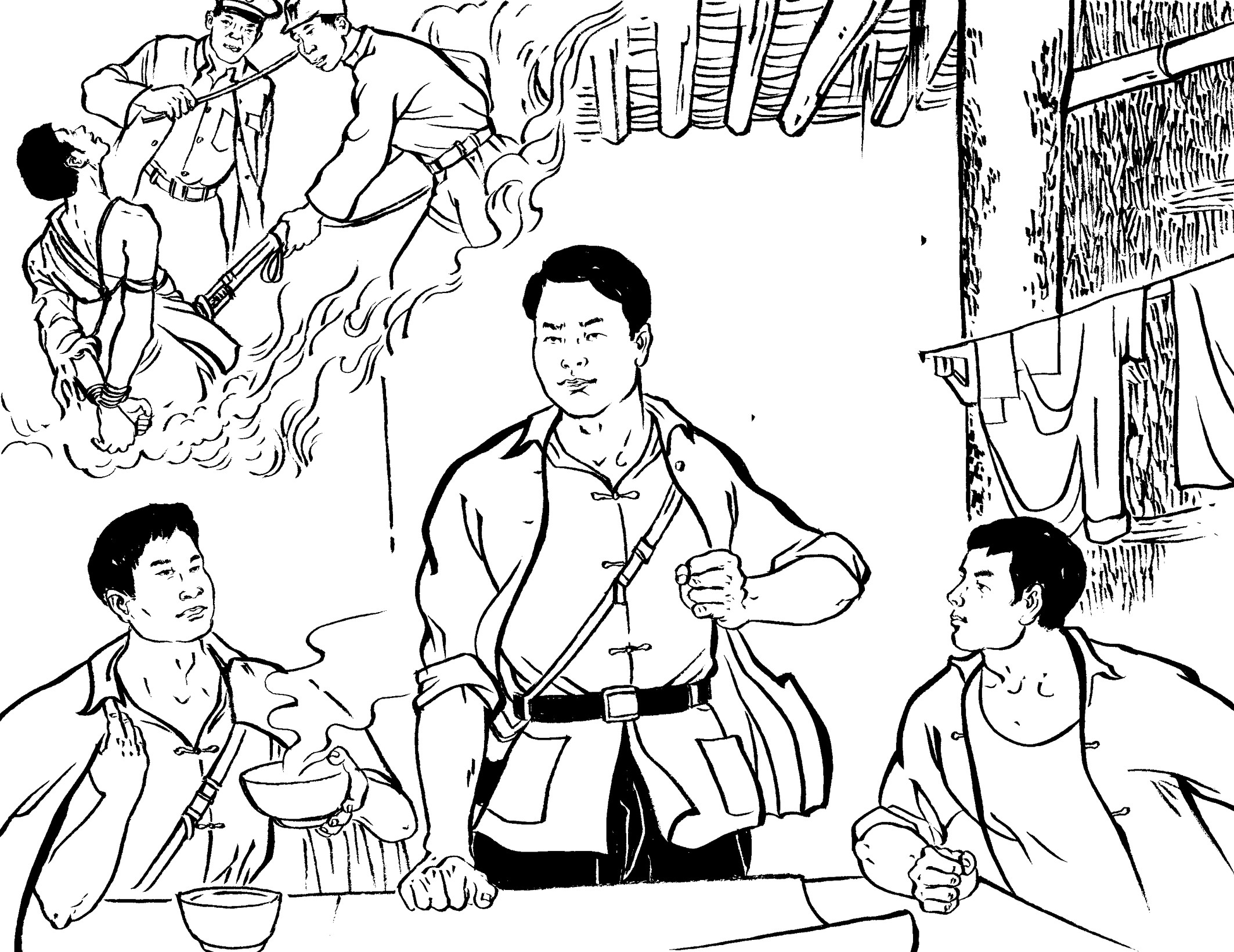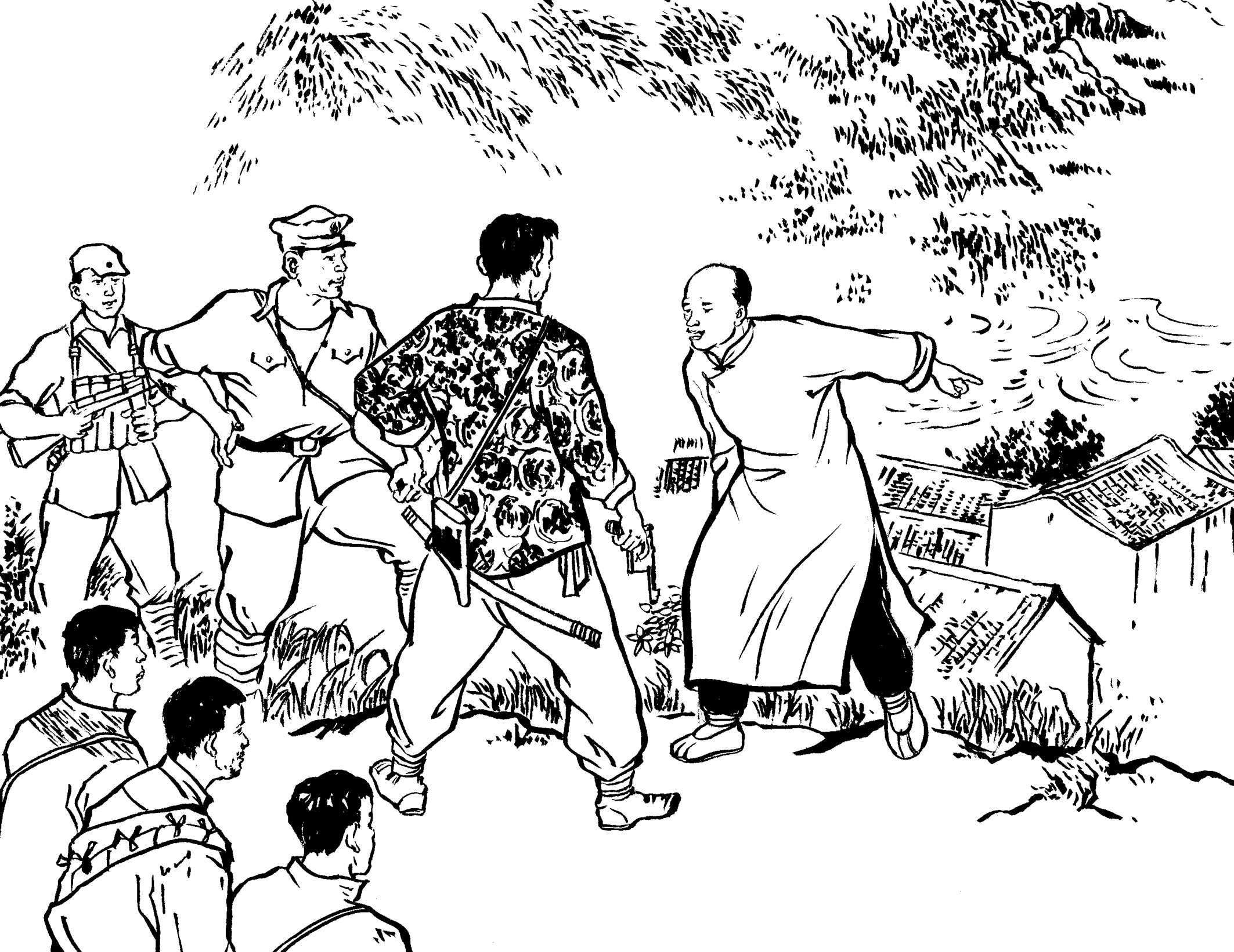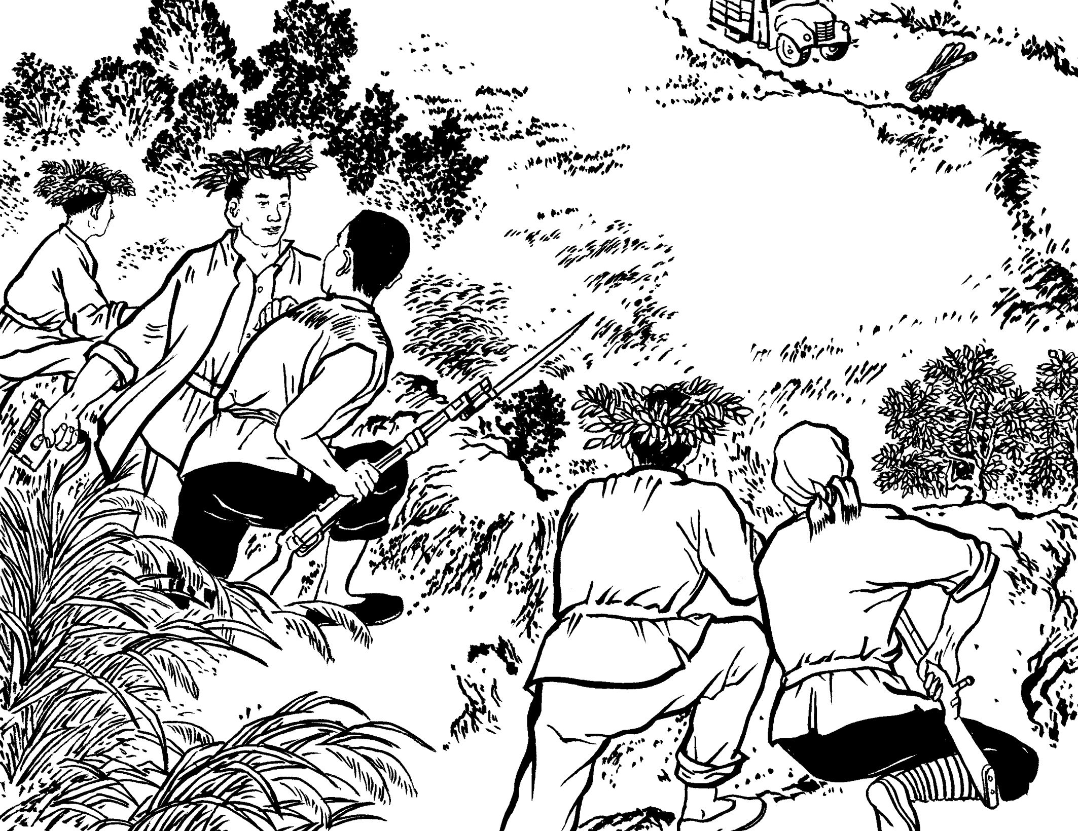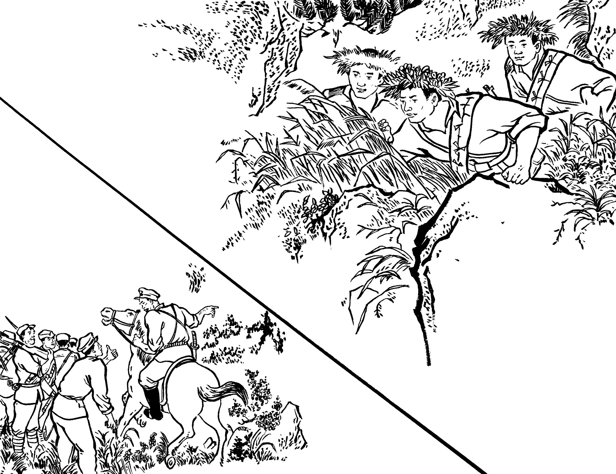 29. 壮汉们提前在草丛中放入捕兽夹,在小道上牵了绳子。国民党军警一进山,有的被绳子绊倒,有的脚被铁夹钳住了,有的当场被击毙,一下子失去了战斗力,剩下的17名士兵全部被抓起来,五花大绑地吊在大松树下拷打。