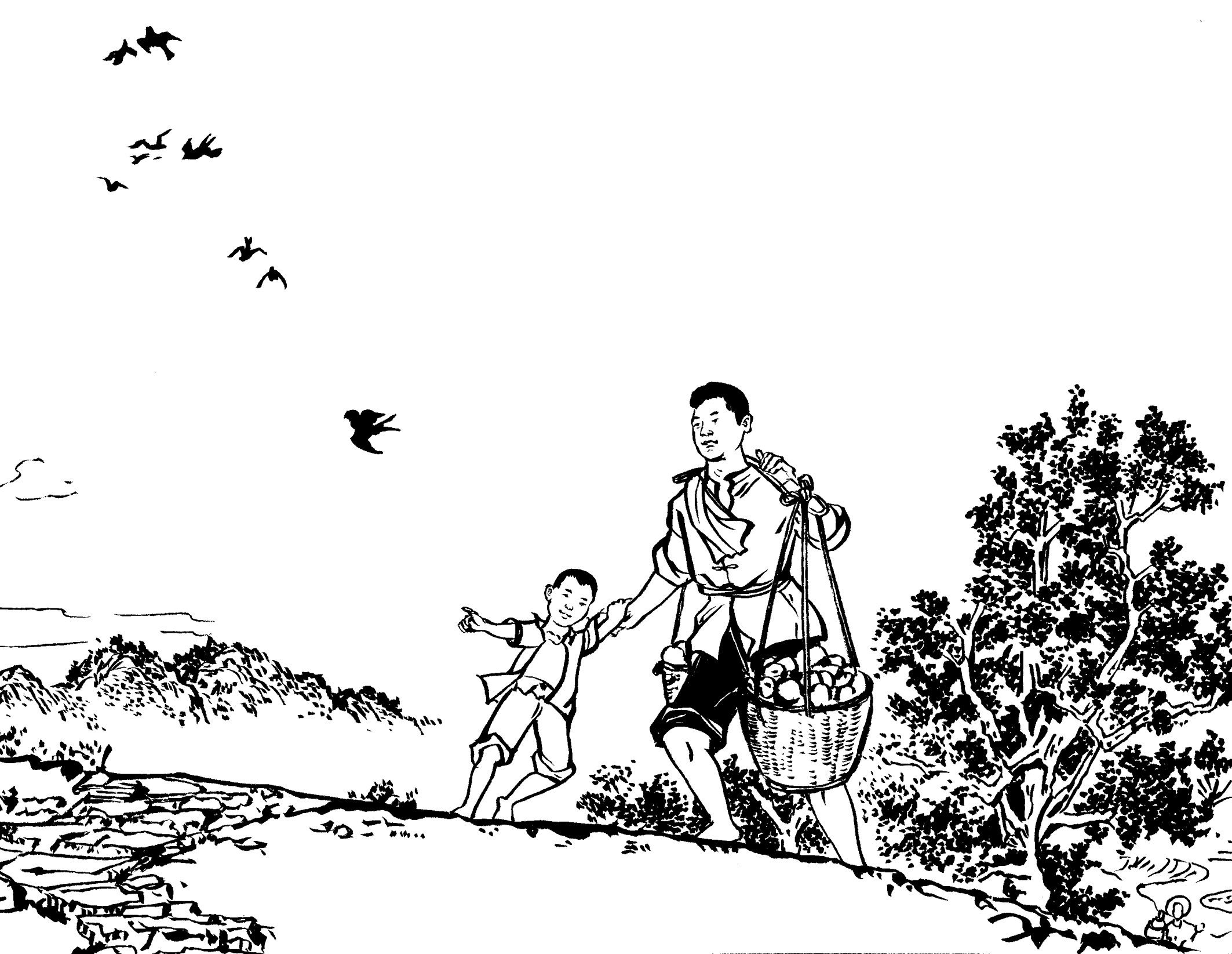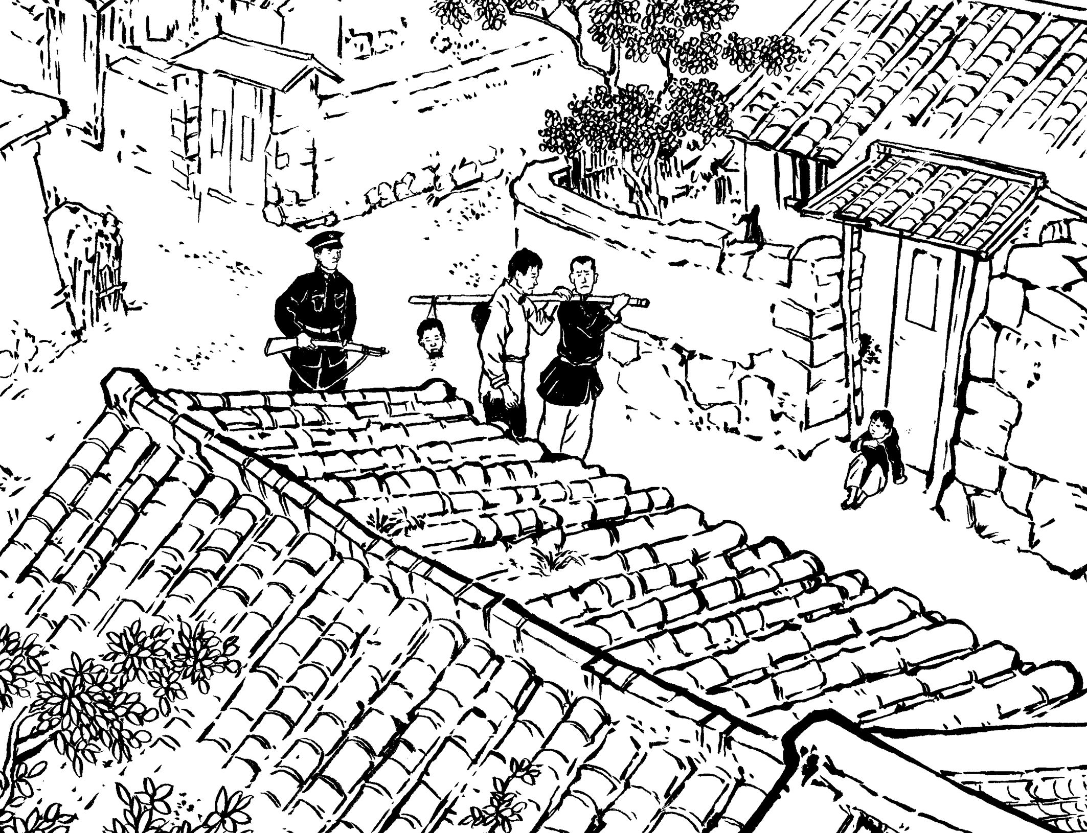 74. 黄振、黄翻挑着两个血淋淋的头颅,从村门自然村出发,沿着古坑——浯坑——溪坂——门口店(今文斗村),直到溪南,他们的心如刀绞一般的痛,泪水模糊了视线。