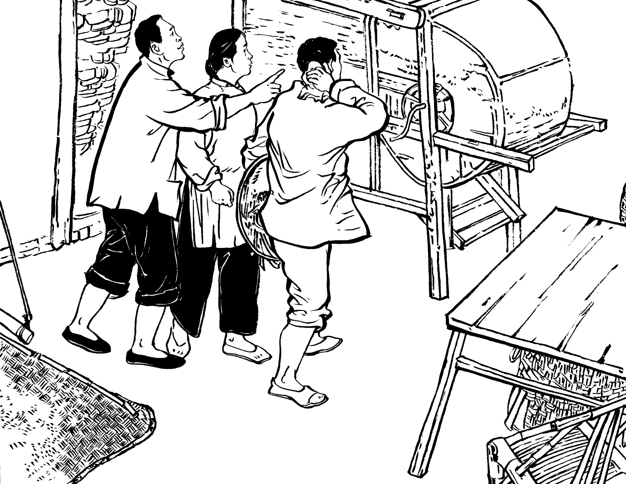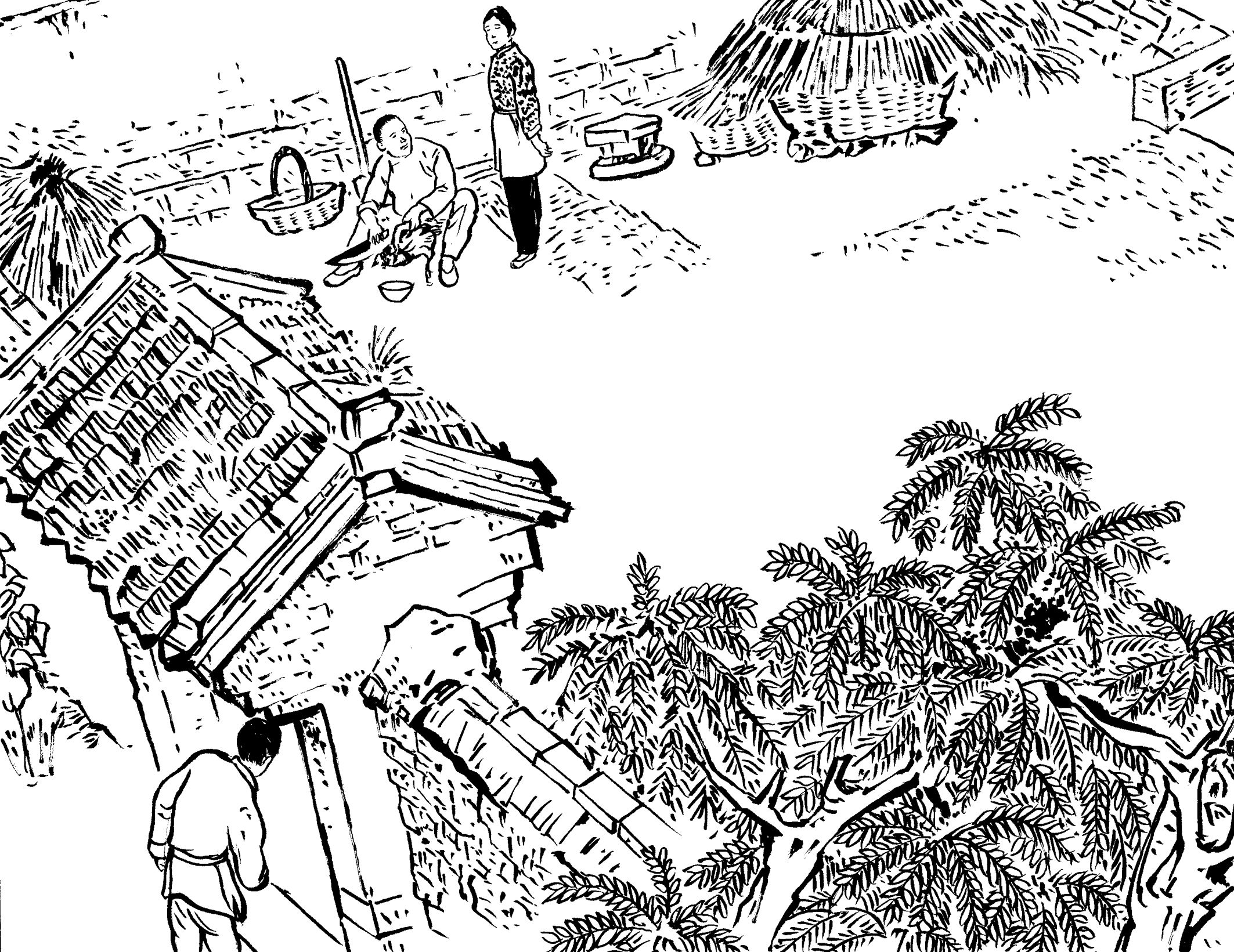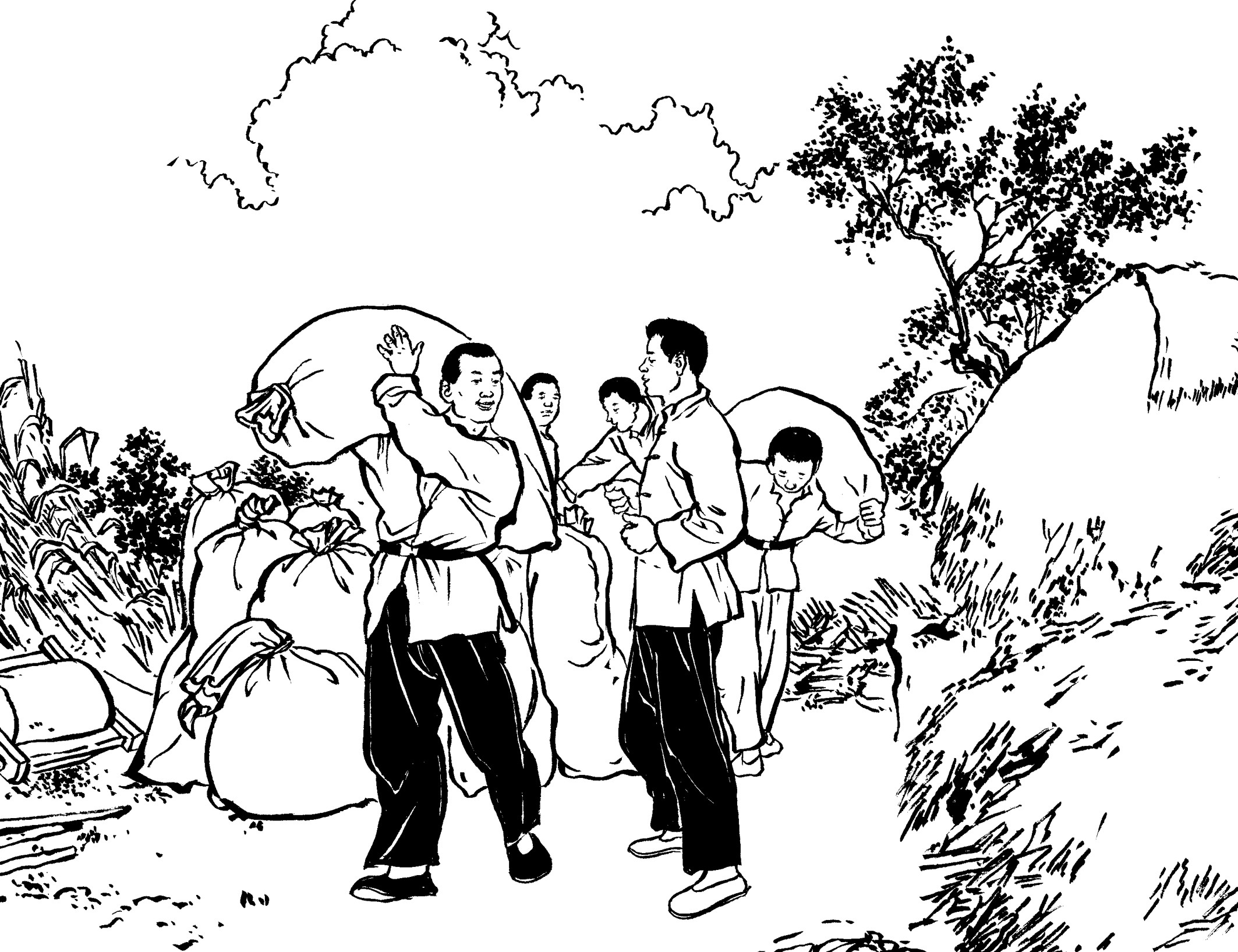57. 秋收后,国民党的征粮队上山来了。保长黄天香哭丧着脸诉说粮食欠收,带着他们走遍13个自然村,挨家挨户征粮,收获甚少。征粮队骂骂咧咧,最后连鸡、鸭、羊也被抵粮带走了。