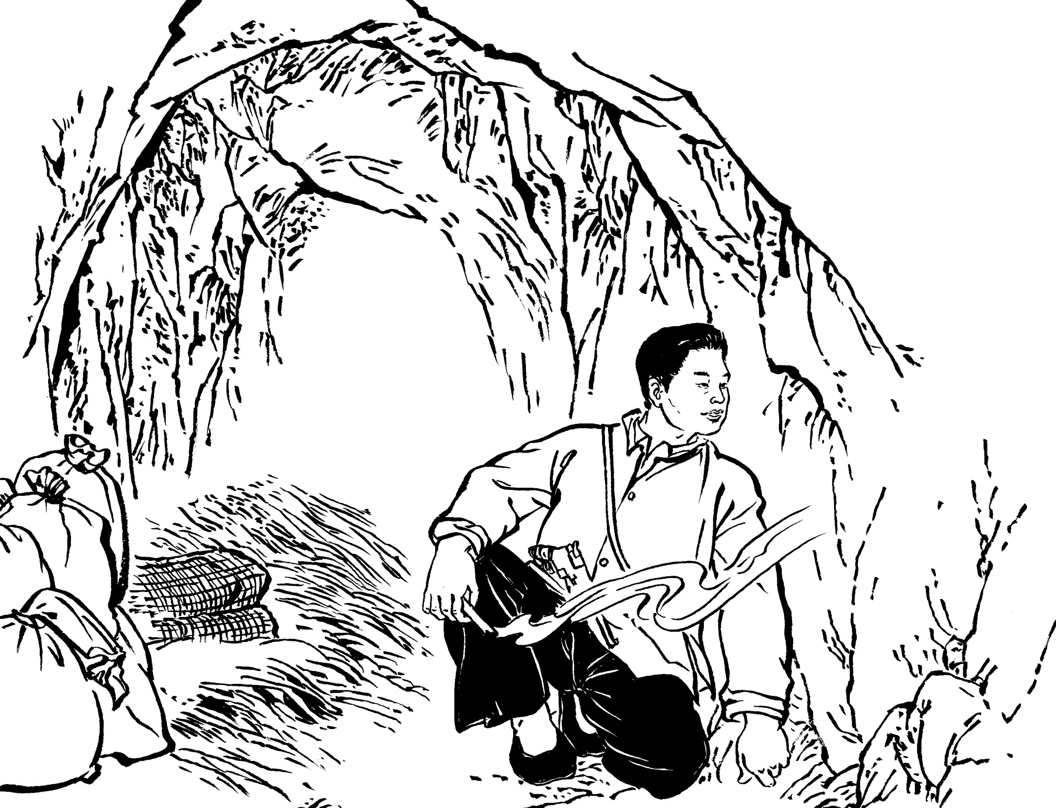 60. 便衣队一过,王朝阳立马抄小路穿过树林,躲进甘露寺旁的九十九洞里,那里老早就预备了一些干粮、水和照明的松明以及当作被子的几个大麻袋。应急时,一个人住在洞里十几个昼夜是没问题的。