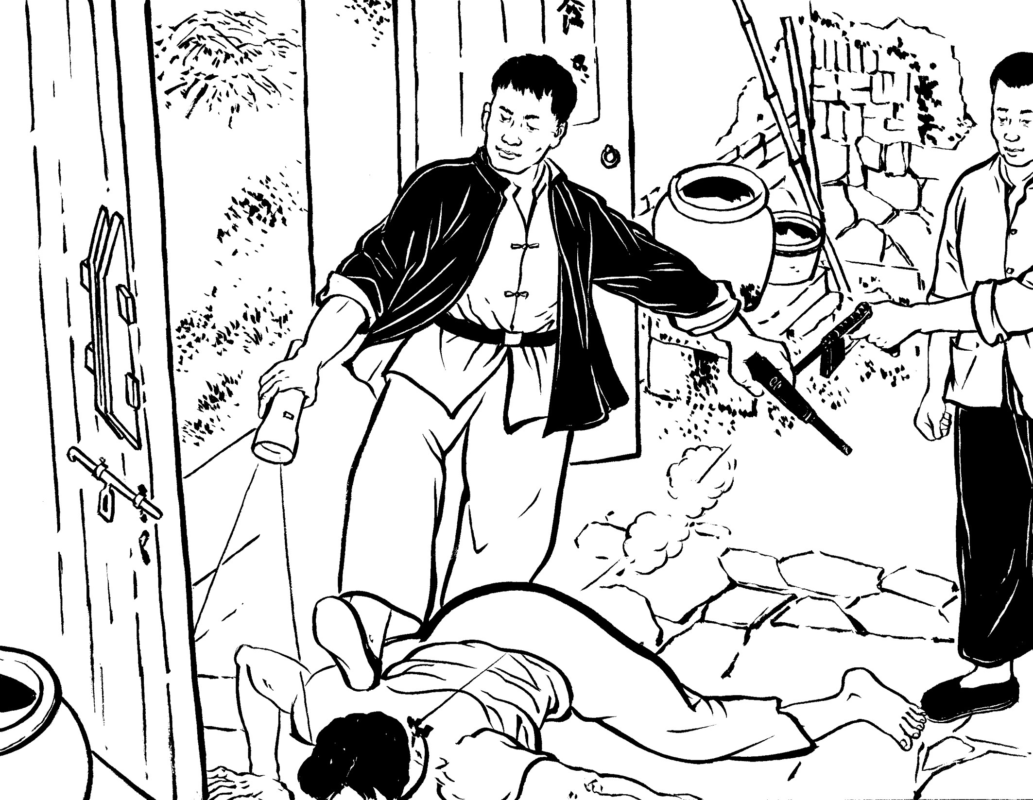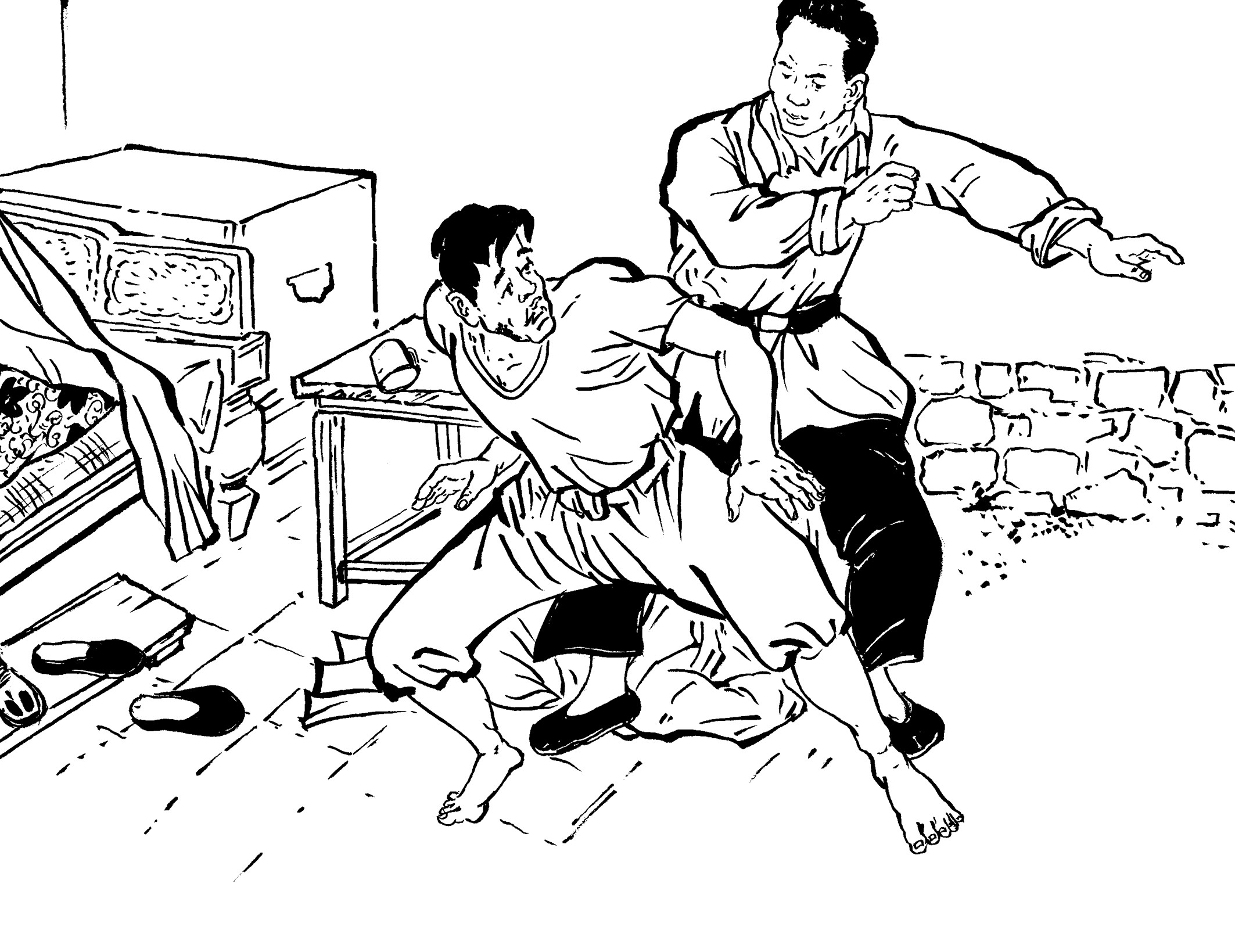 84. 黄章约不顾腿上受伤,翻身冲进房间,抱住正要往外冲的李煨,两人你一拳我一腿厮打起来,一会儿双双倒在地上翻滚,从房里滚到廊道,从廊道滚到天井。