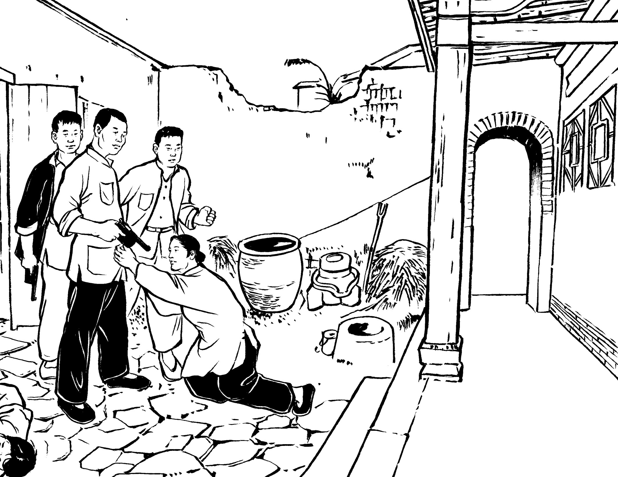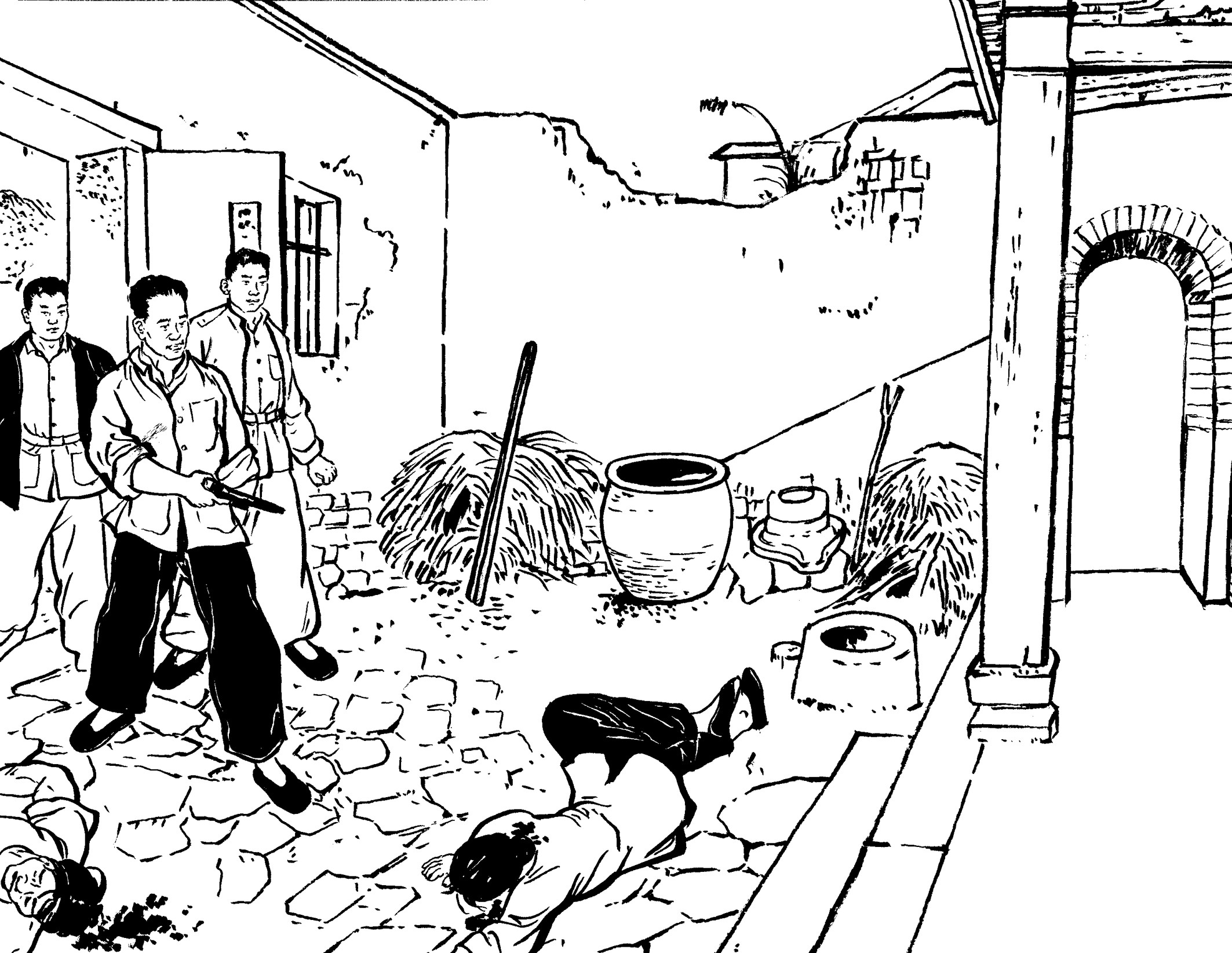 70. 李煨带着“黑狗子”进村了。他们入户搜查了一番,一无所获,暴跳如雷。遂把留在村里的村民集中到村口,逼交粮食,供出共产党。乡亲们宁死不屈,保护共产党员和粮食的安全。