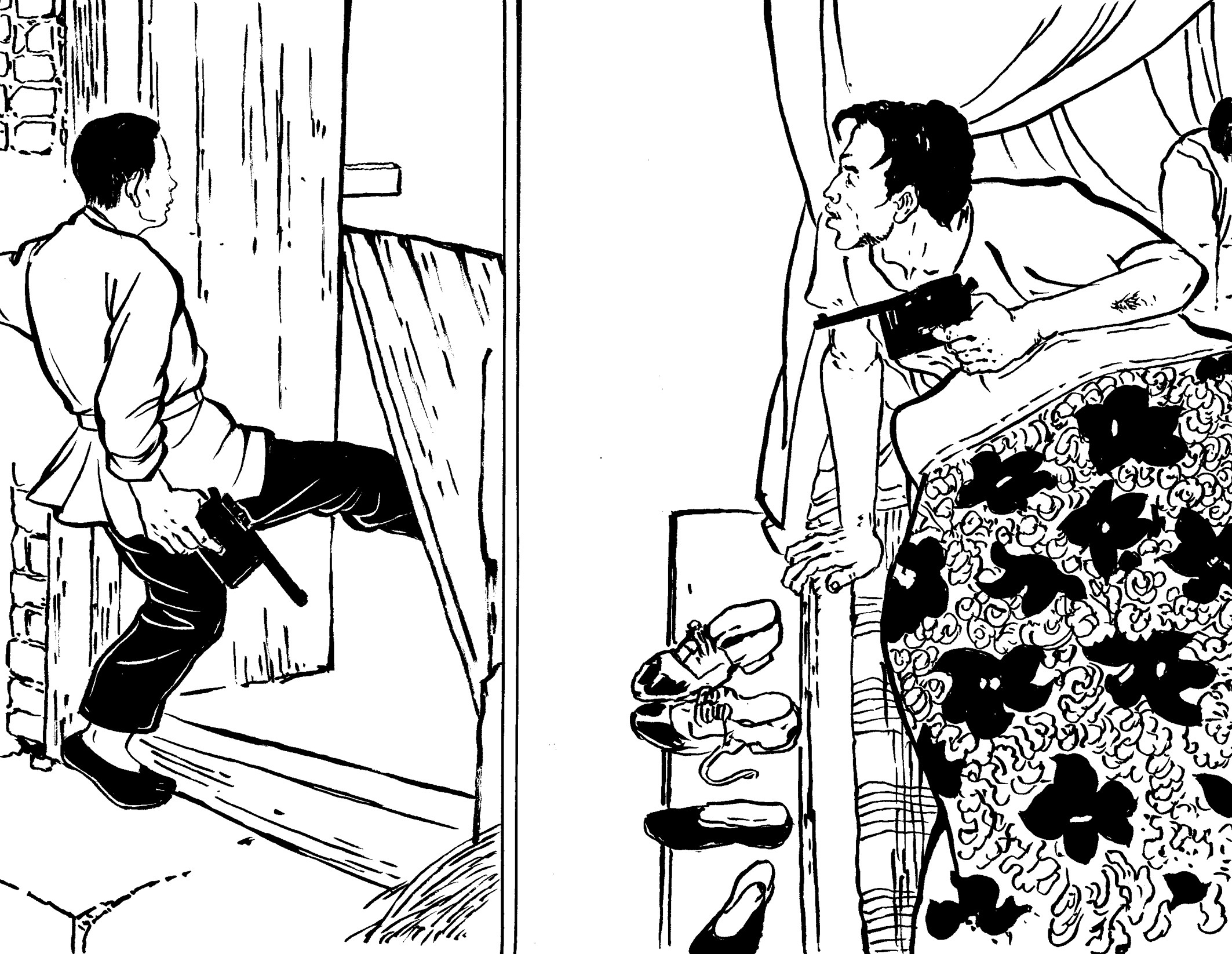 83. 黄章约两步跨过天井,冲到左侧的大房,飞脚一踢,“砰”的一声,门板被踹开倒下,砸在他的右腿上。他一脚没站稳,随门板摔倒在地。与此同时,李煨听到踢门声,从床上一跃而起,顺手抓起放在枕头旁的手枪,对准房门“砰、砰、砰……”一连发出五六发子弹。