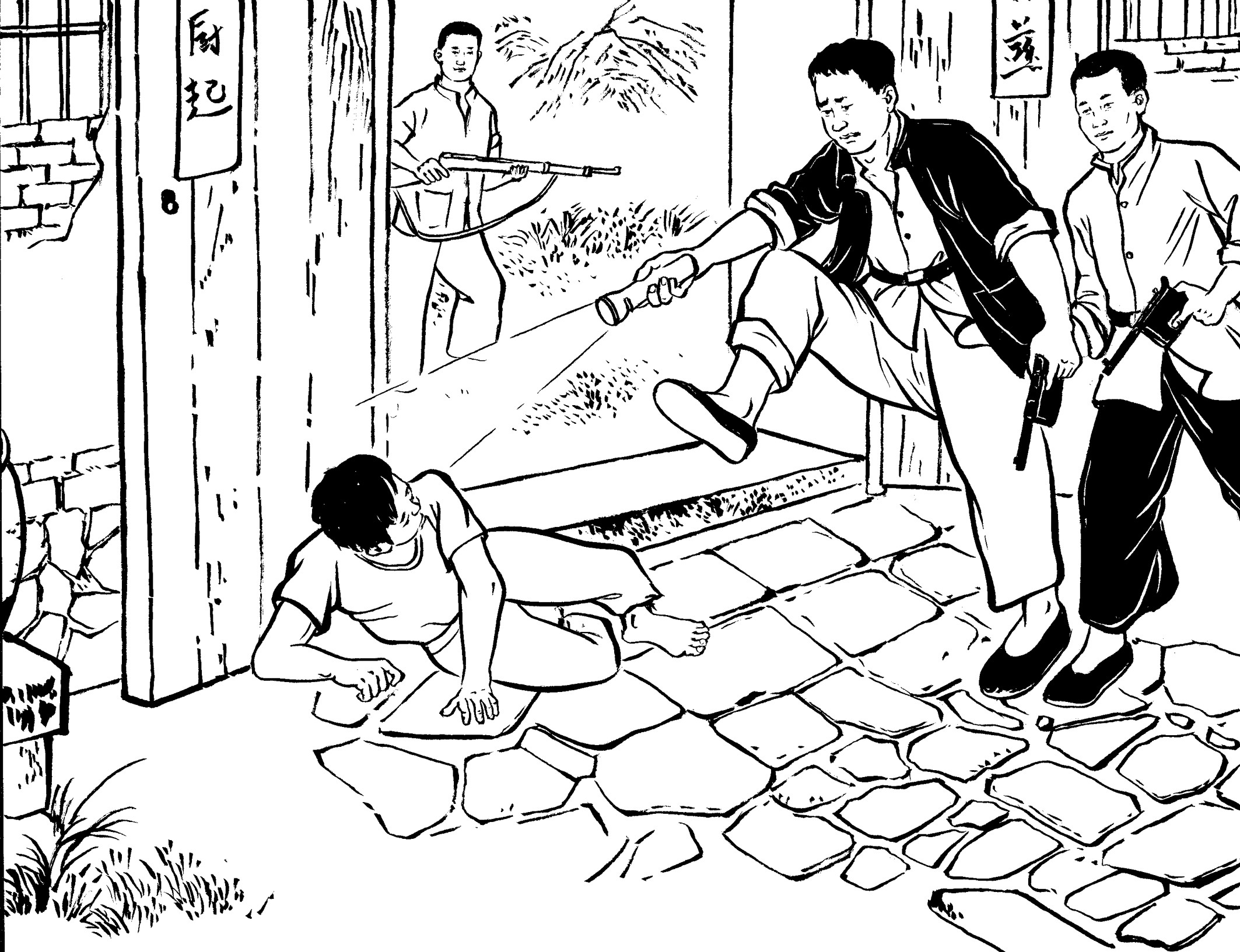 81. 按王朝阳事先布置,参加人员10个,分4组到达指定位置:陈企?、蔡乙民、蔡乙琦站在村口的树林里把守,距他们十步之遥的王水法和黄章开隐蔽在一块大石头后面,黄鱼、黄章?、苏宜演卧在门口大埕的石阶旁,黄章约和黄铨斜隐在大门两侧。