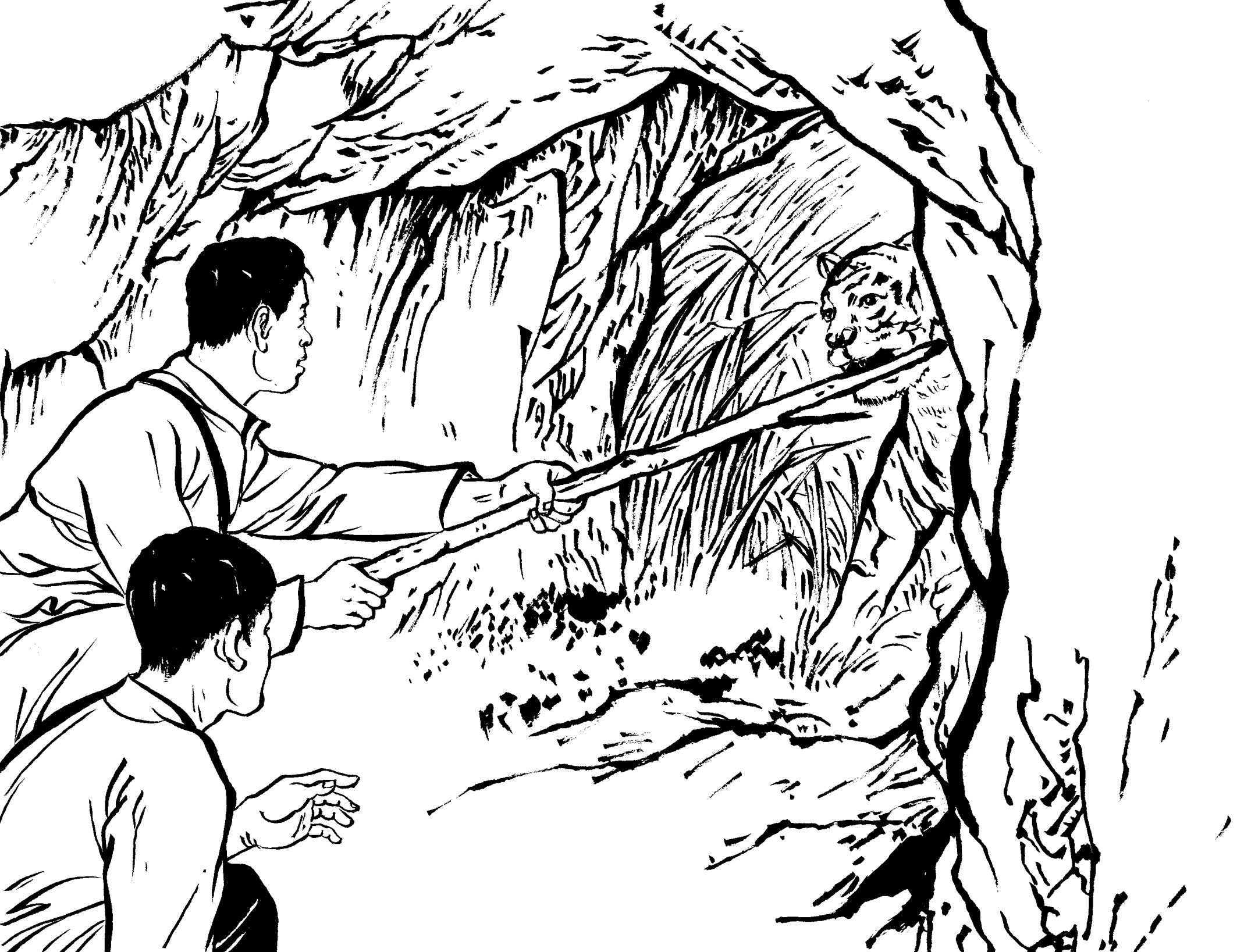 100. 情急之下,两人躲进了一个老虎洞。不久老虎回来了,他们不敢开枪,也不敢生火,怕暴露自己,只能拿着一根长棍,把老虎往外推。老虎不愿走开,双方一直对峙到次日凌晨,老虎走开了,他们才得以脱险。