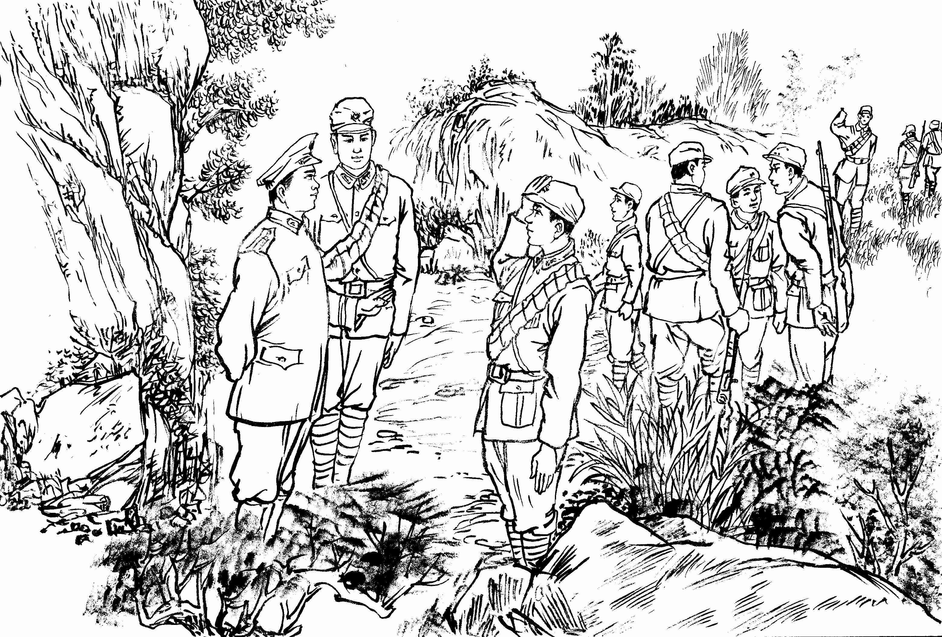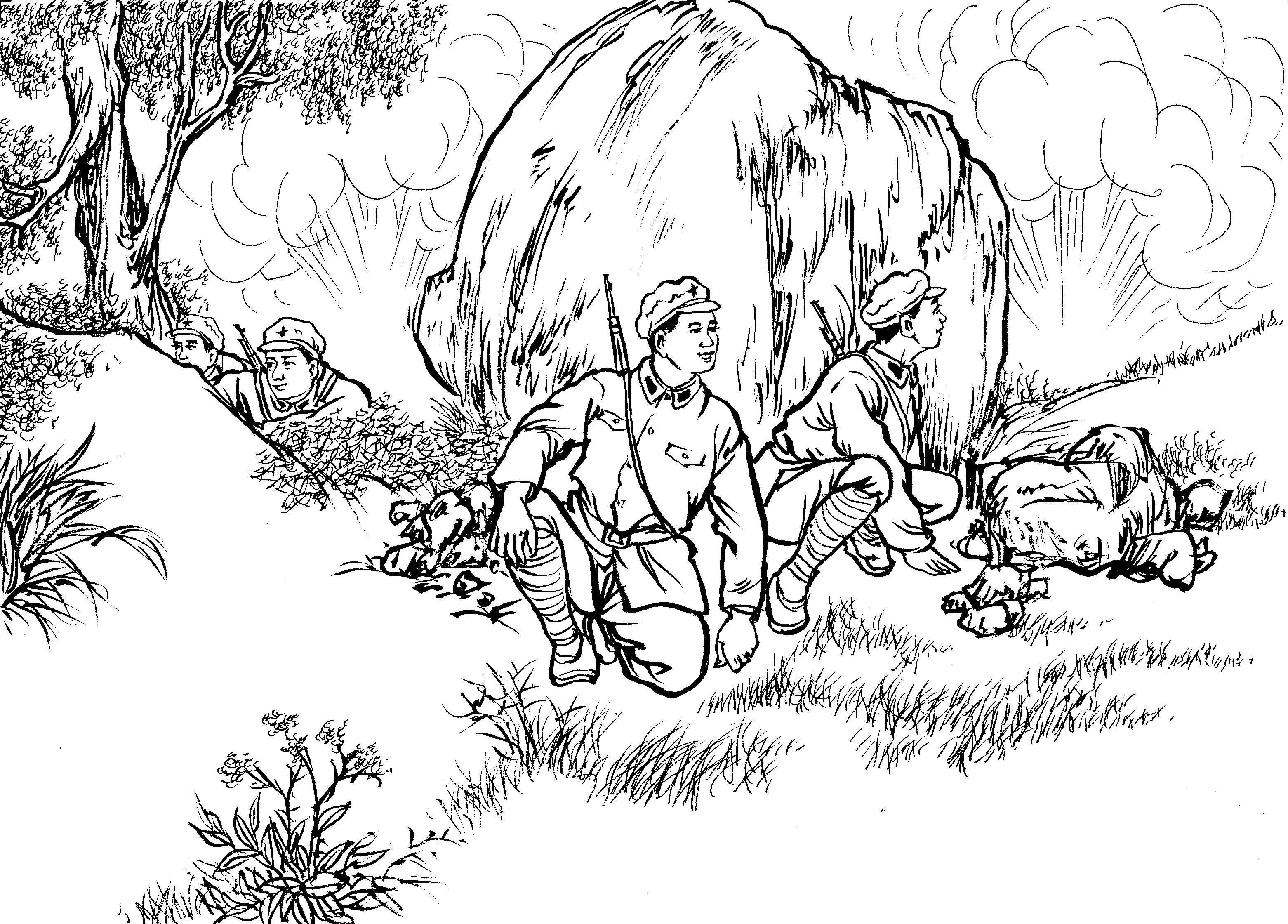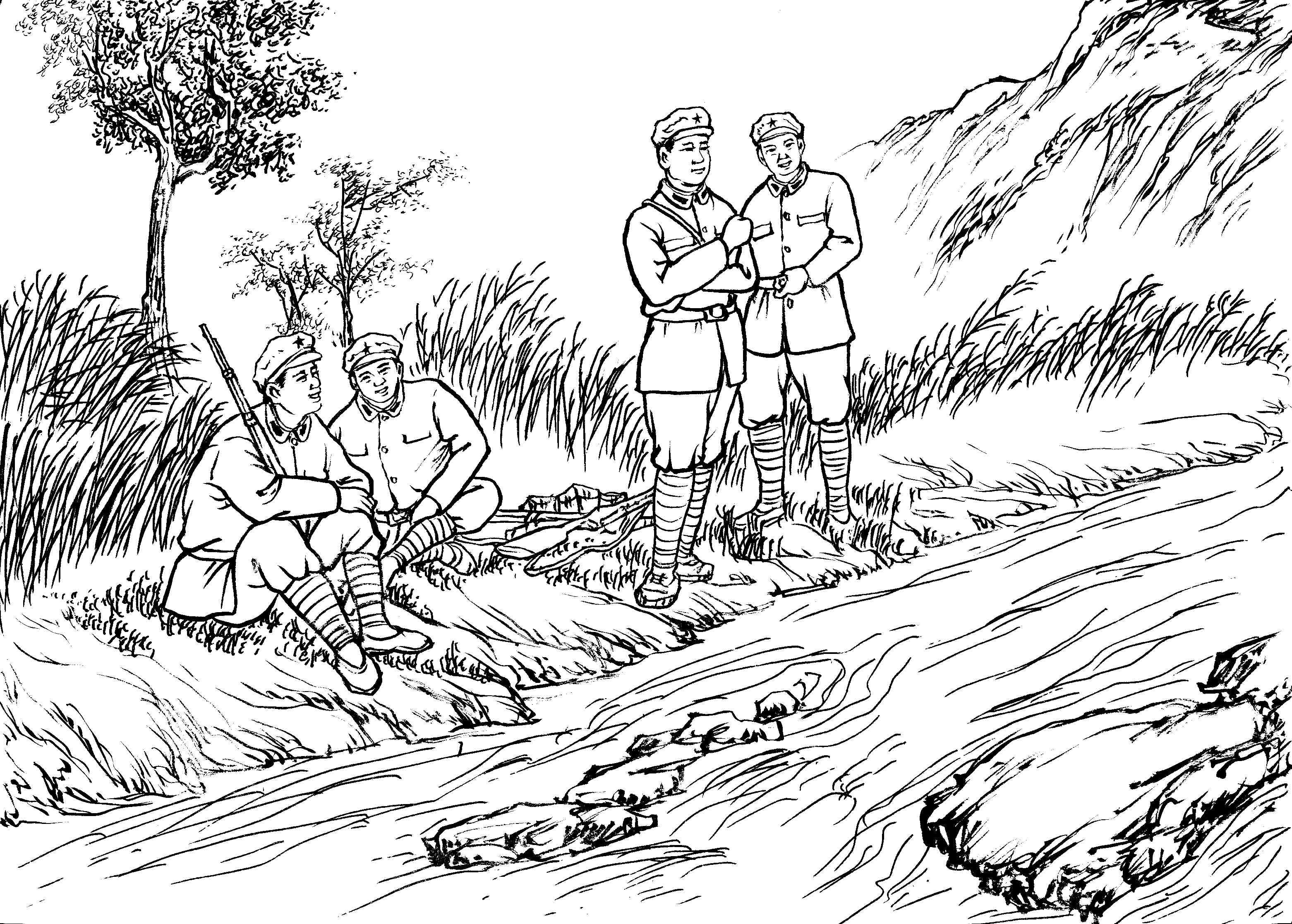 78. 于是,4位战士趴在那儿一整天,没吃东西没喝水。一直等到晚上,月牙儿挂在树梢时,康仲仁才带着3位战士悄悄地撤退。到达山谷时,一条小溪静静地流淌着,他们又饥又渴,蹲在溪旁咕噜噜地喝饱水,最后安全回到驻地。
