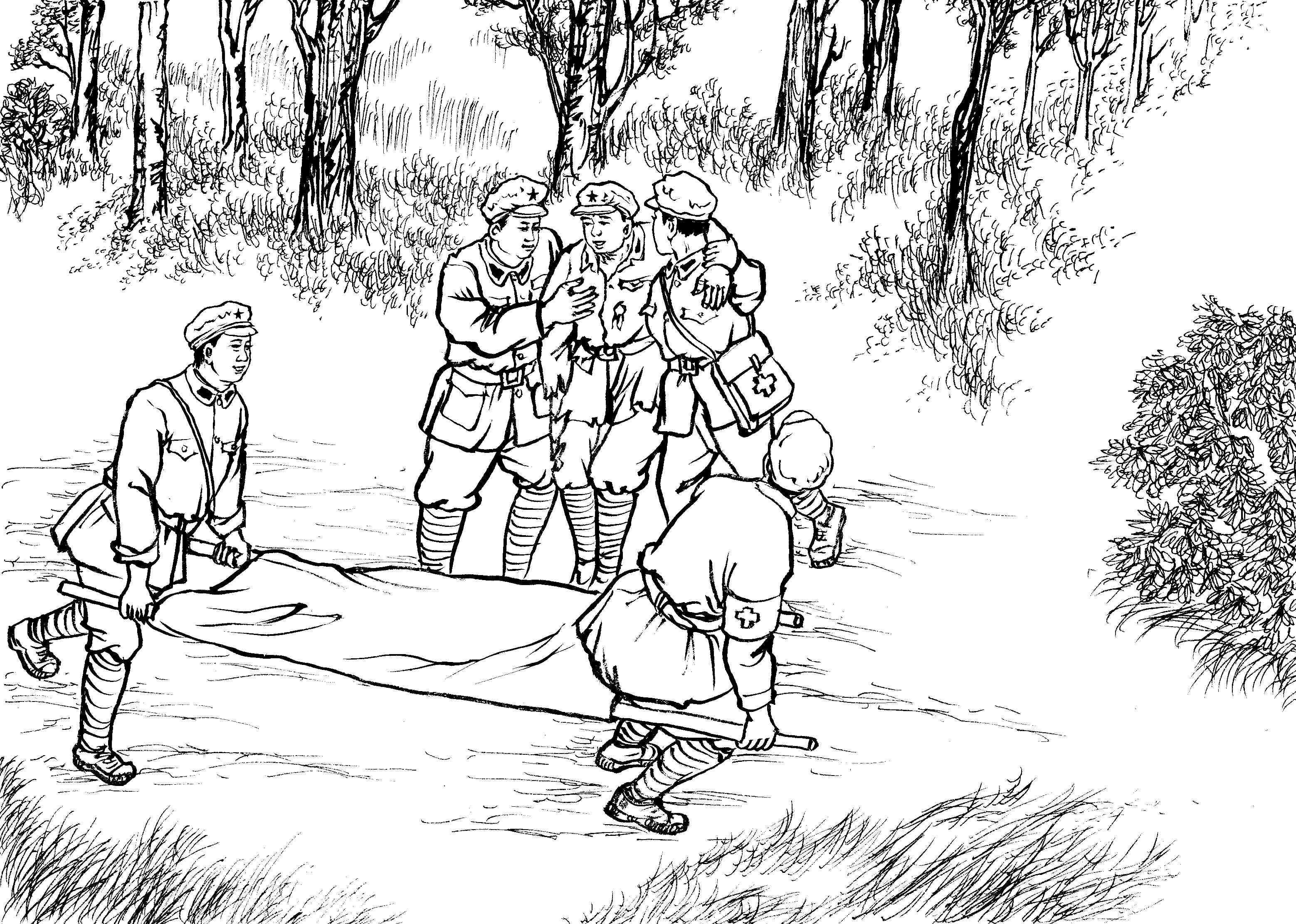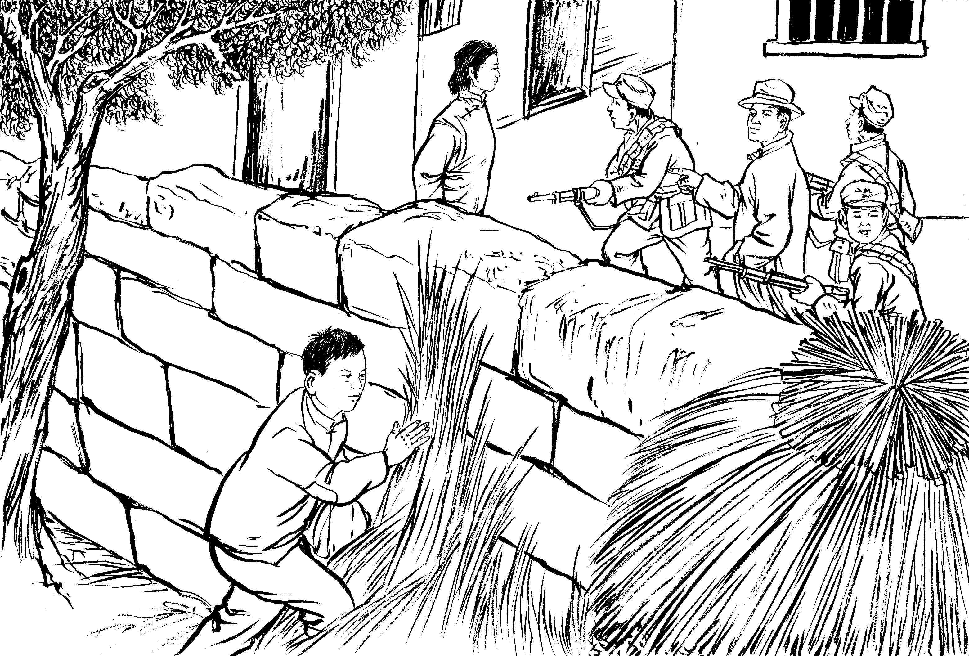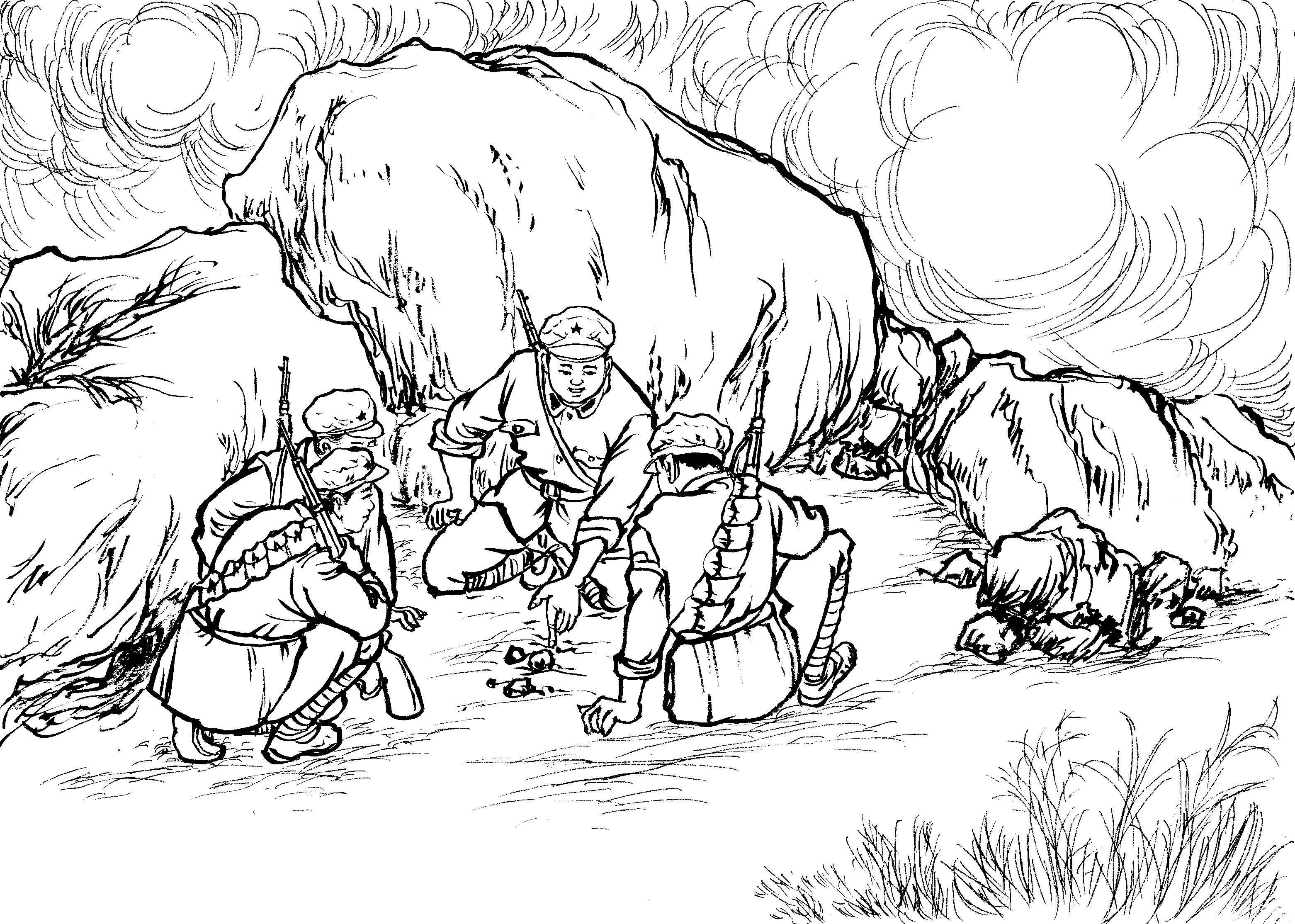78. 于是,4位战士趴在那儿一整天,没吃东西没喝水。一直等到晚上,月牙儿挂在树梢时,康仲仁才带着3位战士悄悄地撤退。到达山谷时,一条小溪静静地流淌着,他们又饥又渴,蹲在溪旁咕噜噜地喝饱水,最后安全回到驻地。