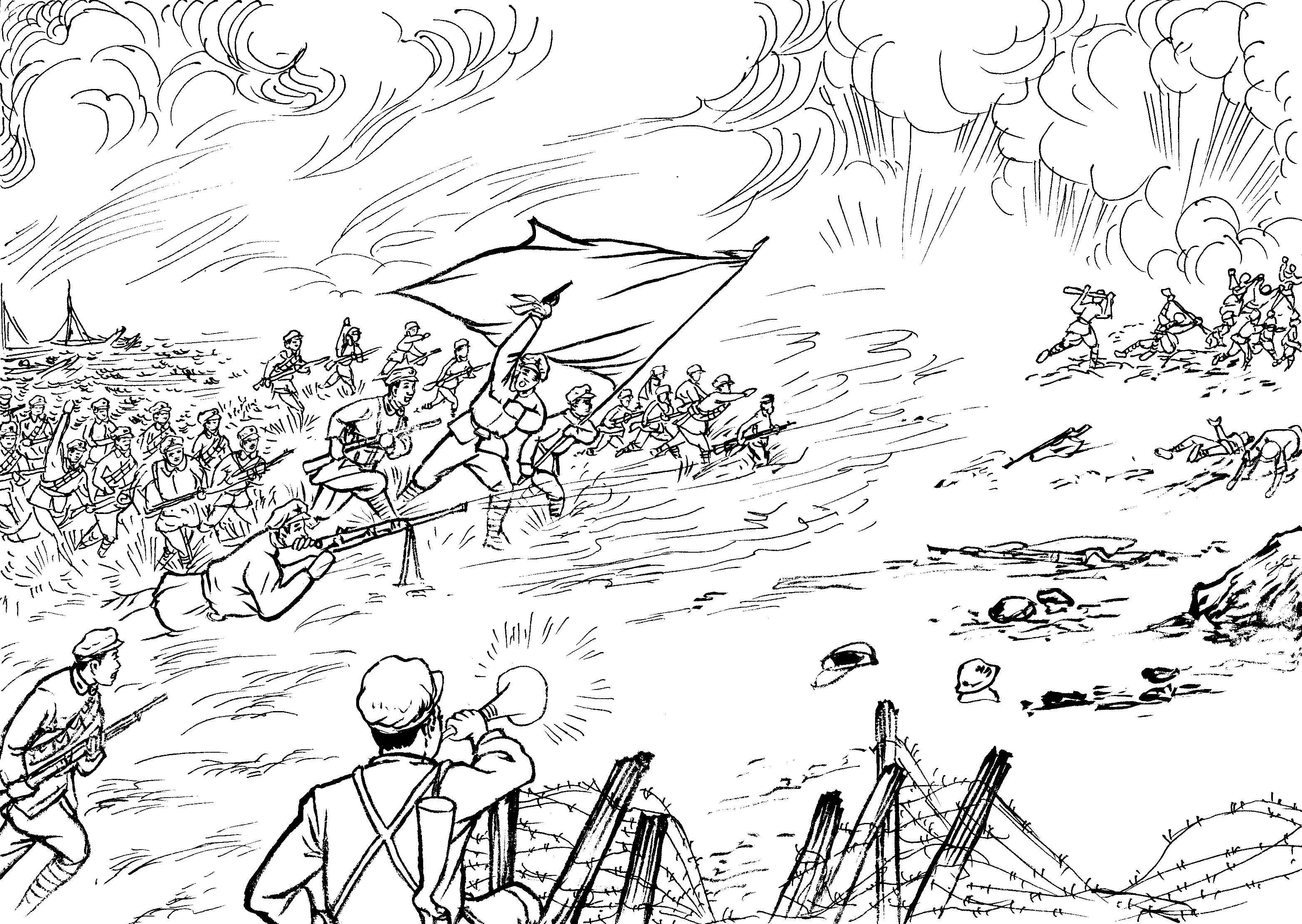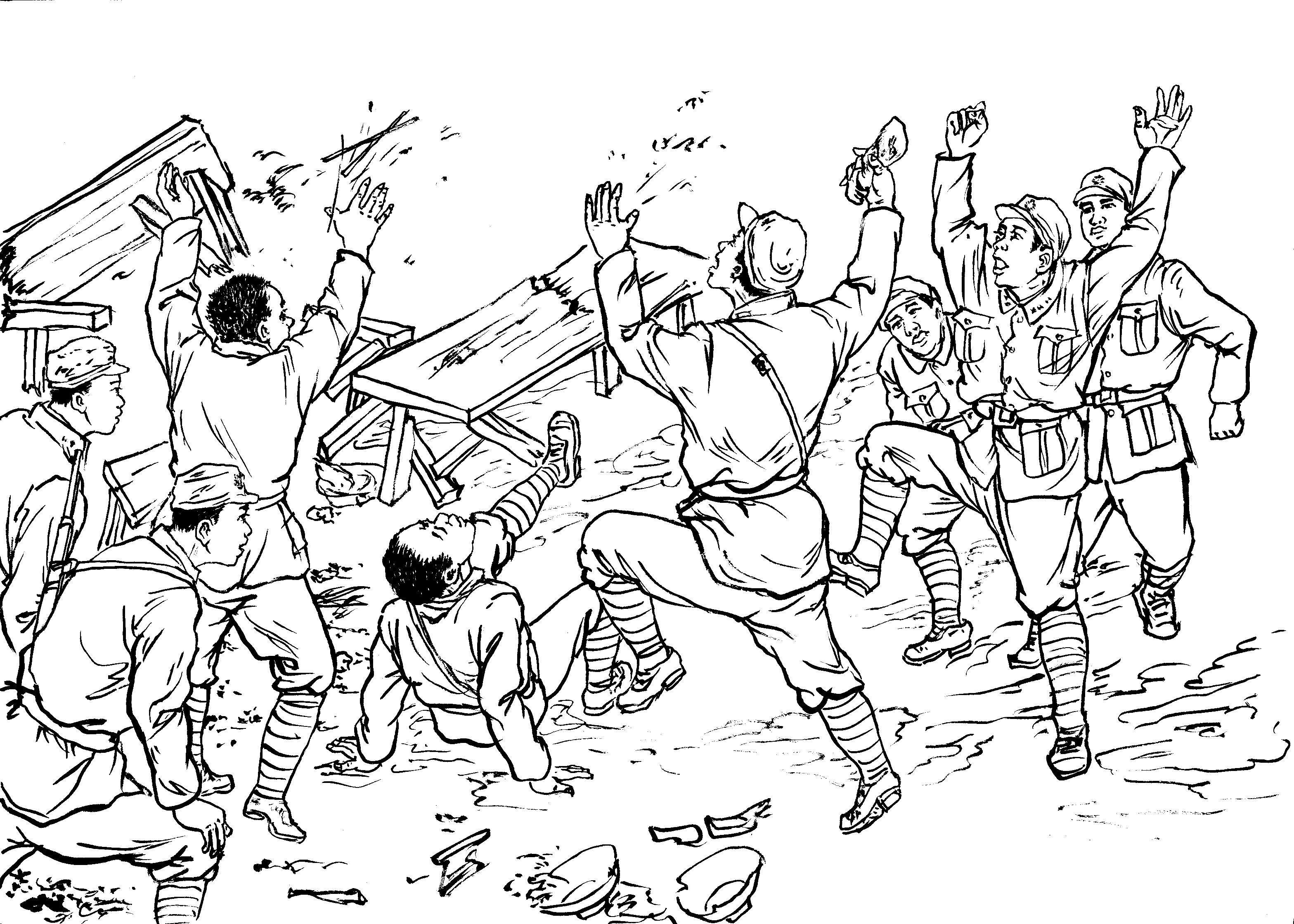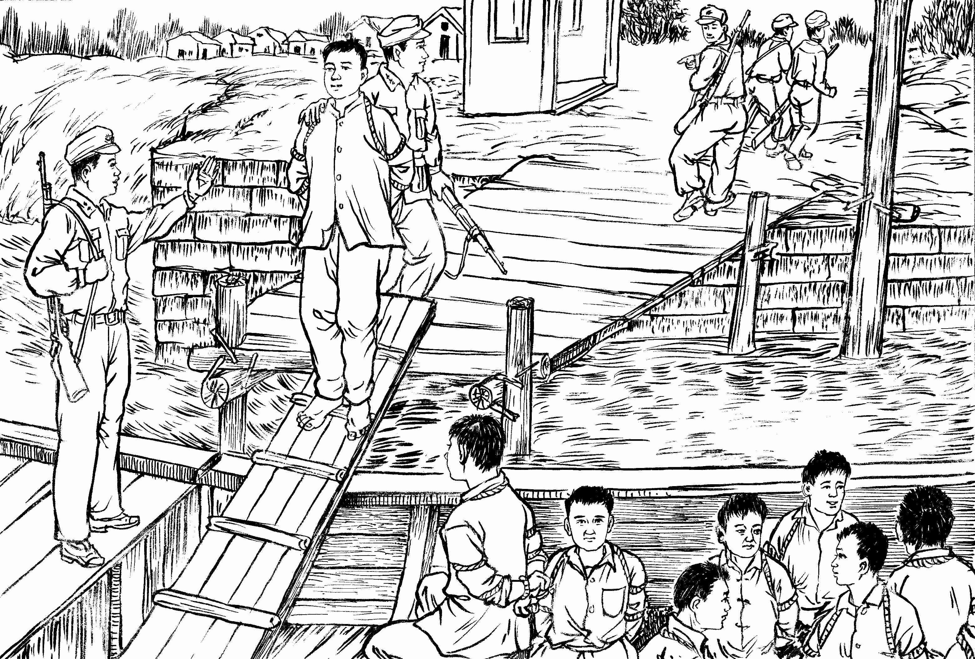 43. 原来3个国民党兵砸坏了碉堡里的机关枪,企图趁机潜逃。康仲仁将他们交给随后的人,继续前进。按照原先约定的,各部队登陆成功以后,即以点起火堆的方式报告战况,瞬间,江南岸成为一片火的海洋。