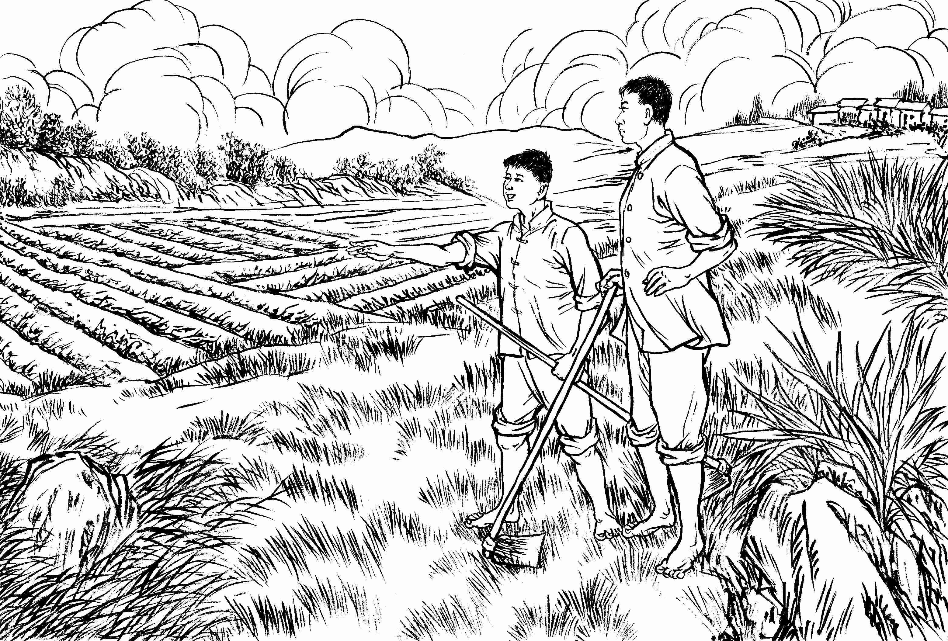 16. 1945年8月15日,日本无条件投降,结束侵华战争。康仲仁欣喜若狂,立即回到家乡,和弟弟康琴一起种田,过着平凡的农家日子。这时,他已长成20岁的壮实小伙了。