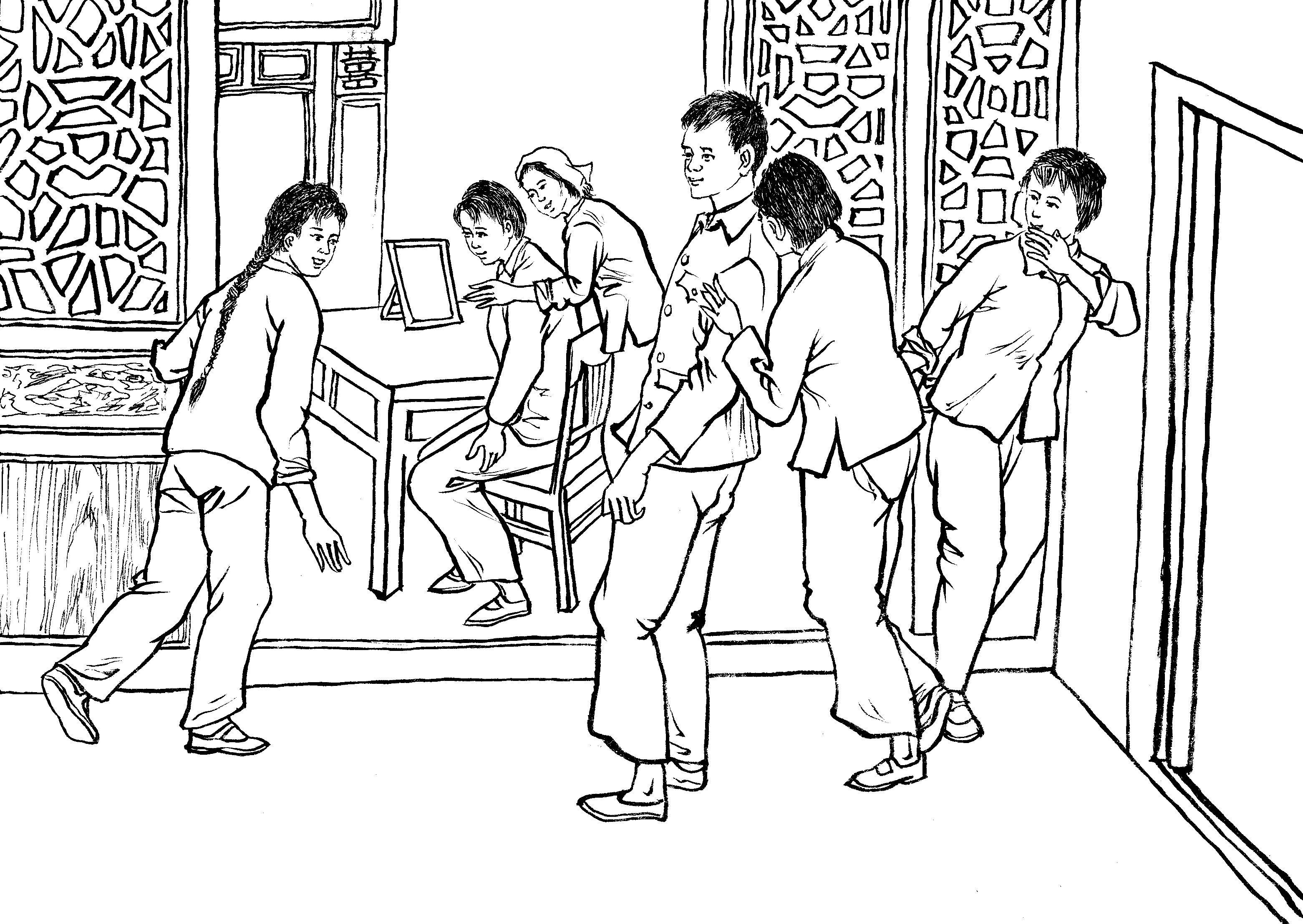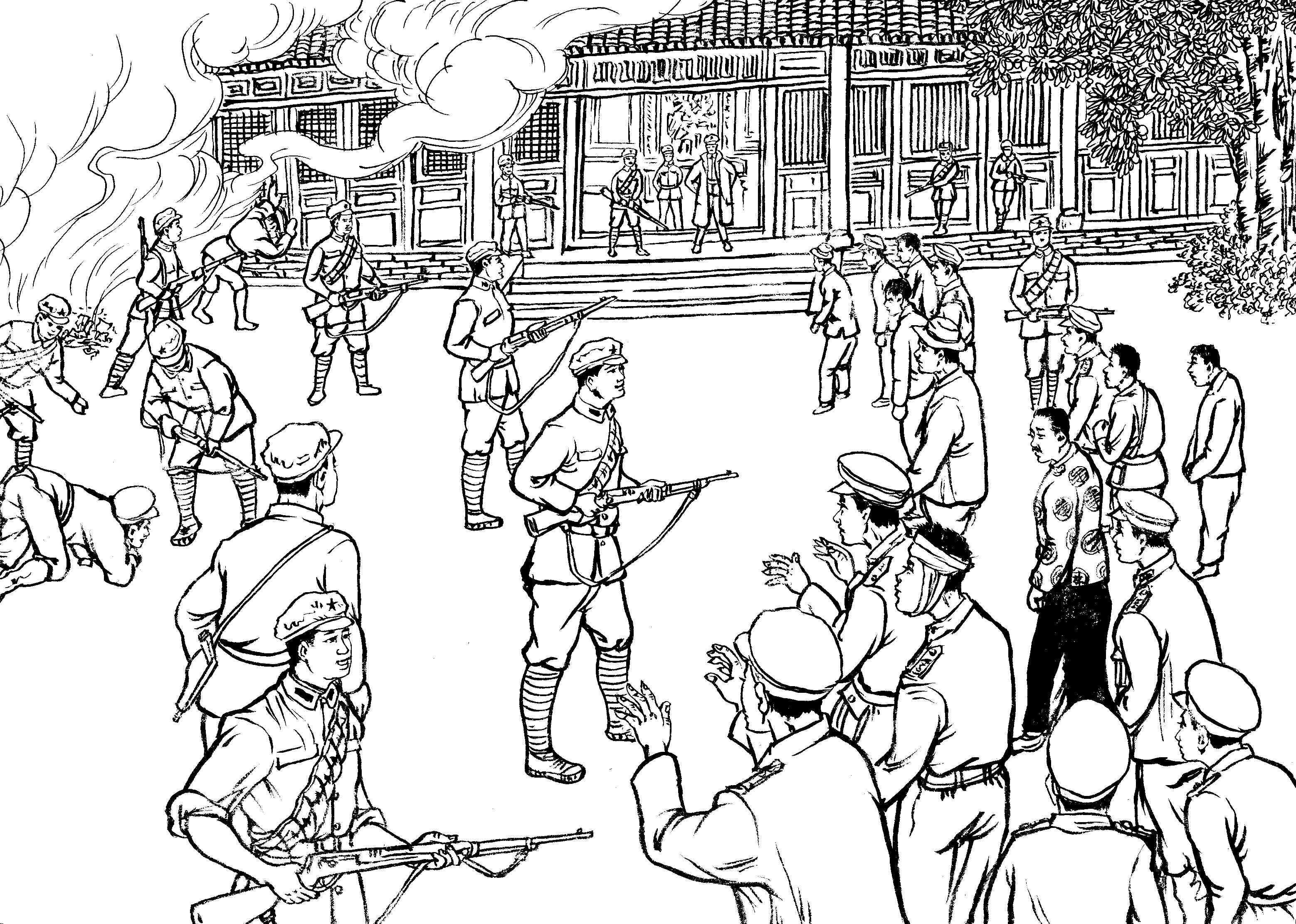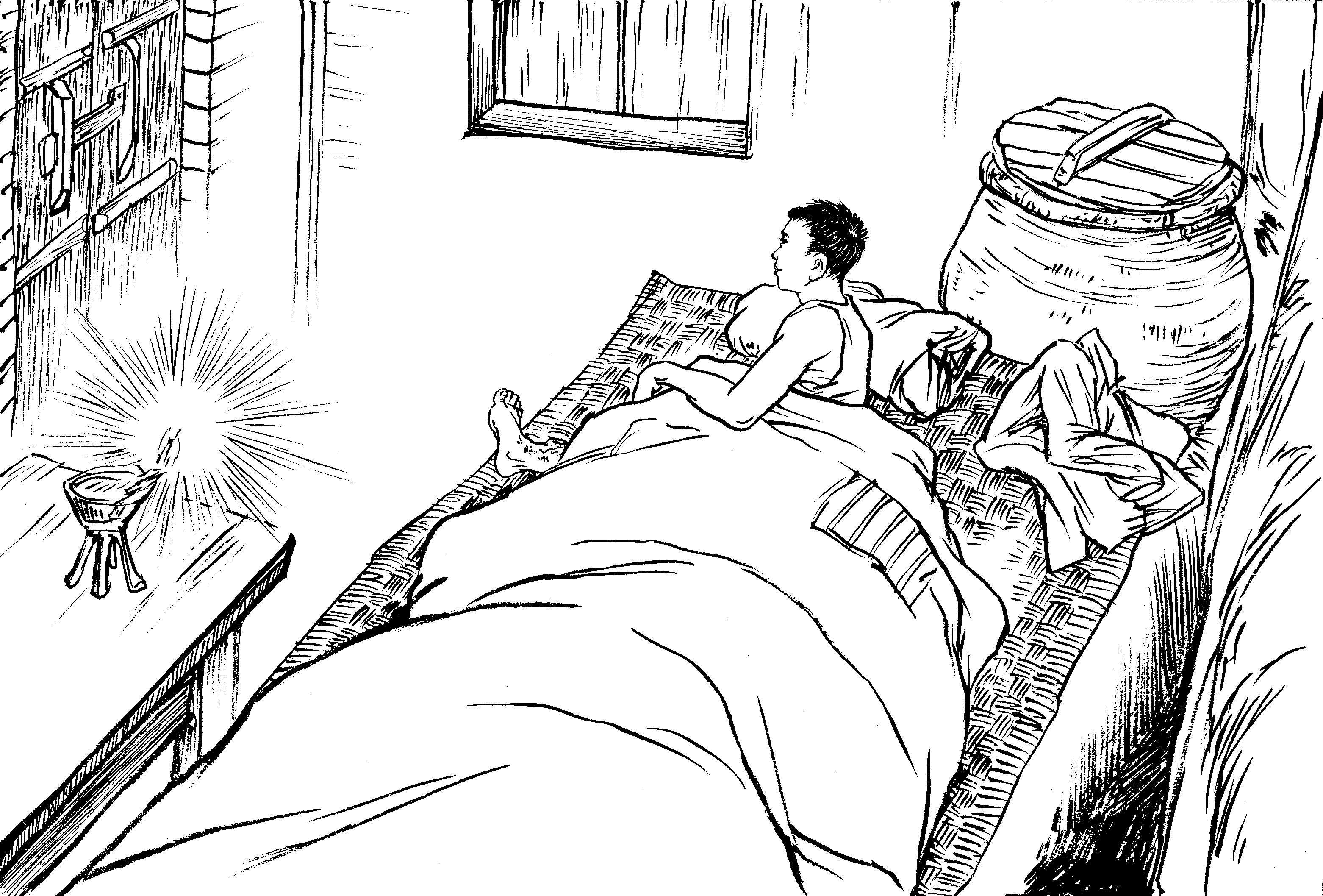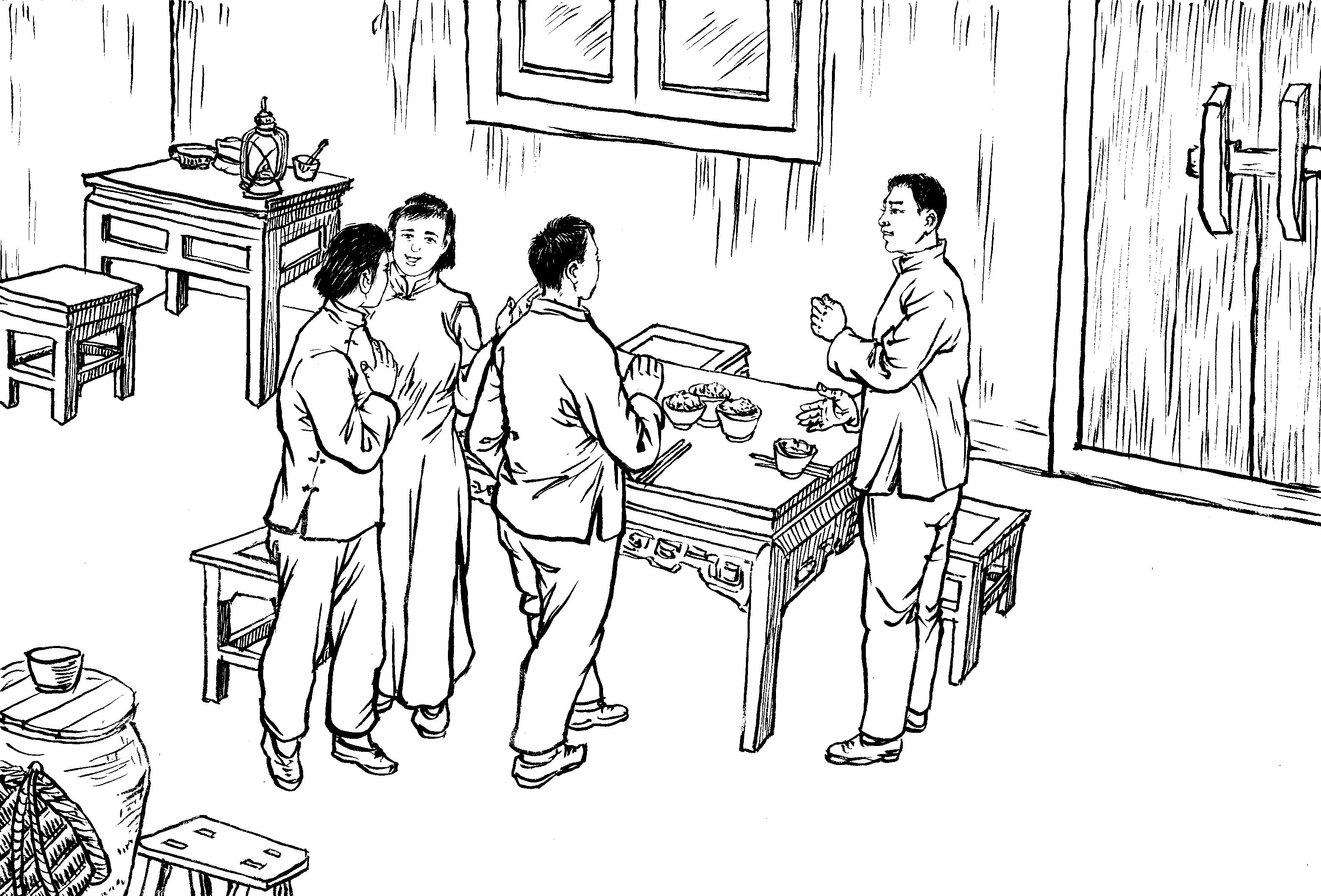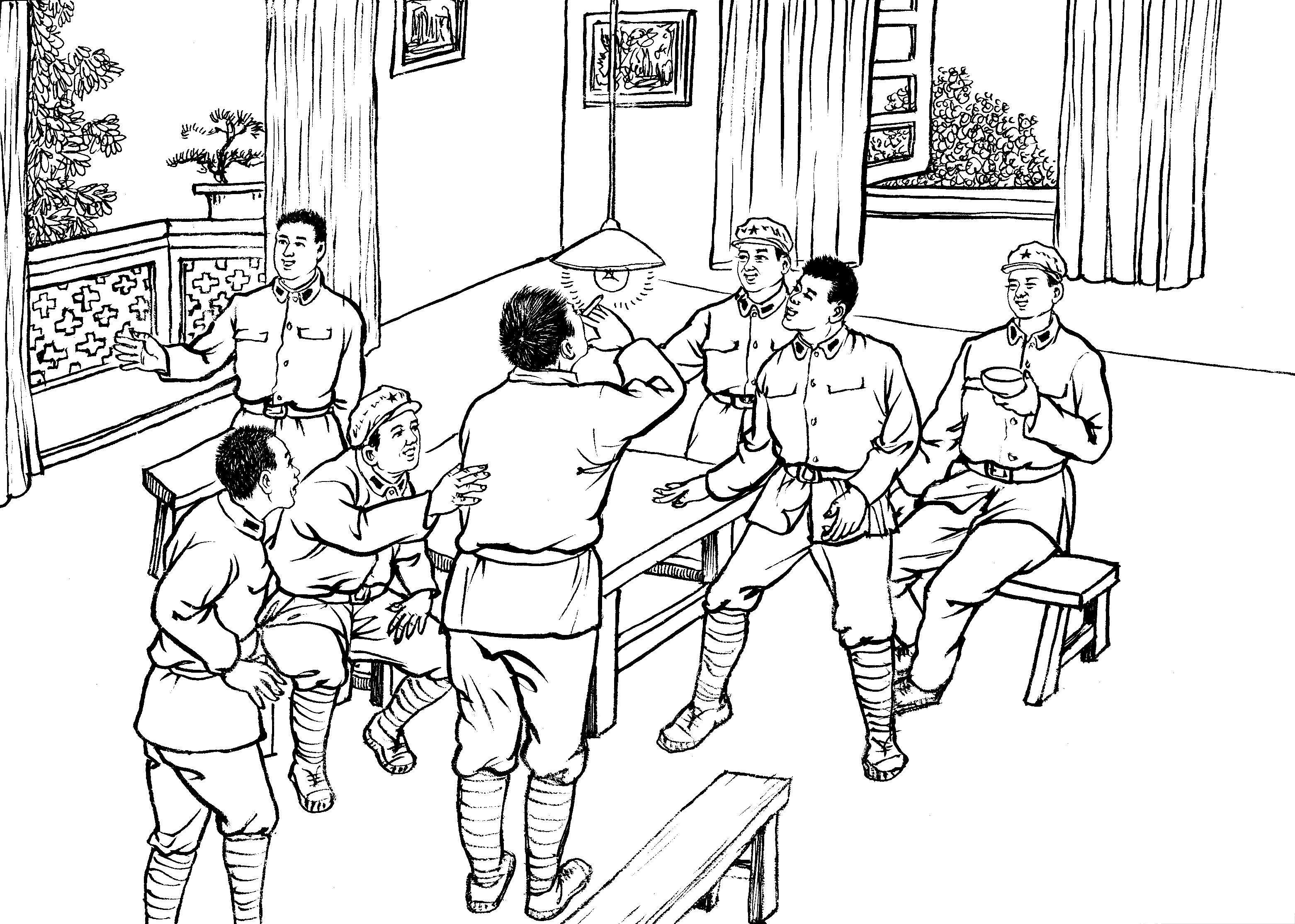 50. 部队驻扎在南门附近的旅馆里。康仲仁和战士们第一次看见了电灯,非常兴奋惊奇。一位老兵卷了一个纸烟,凑近灯泡想要点燃,嘿,点不着。大家开心得哈哈大笑,笑他刘姥姥进了大观园。