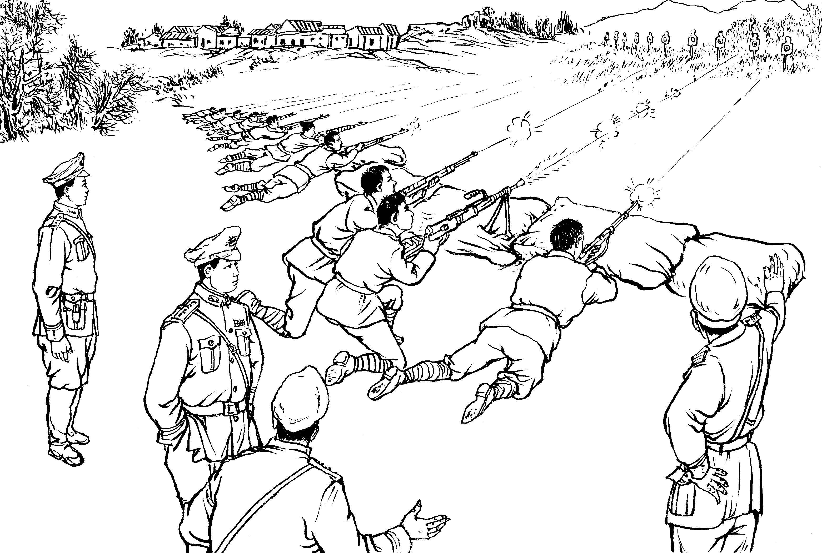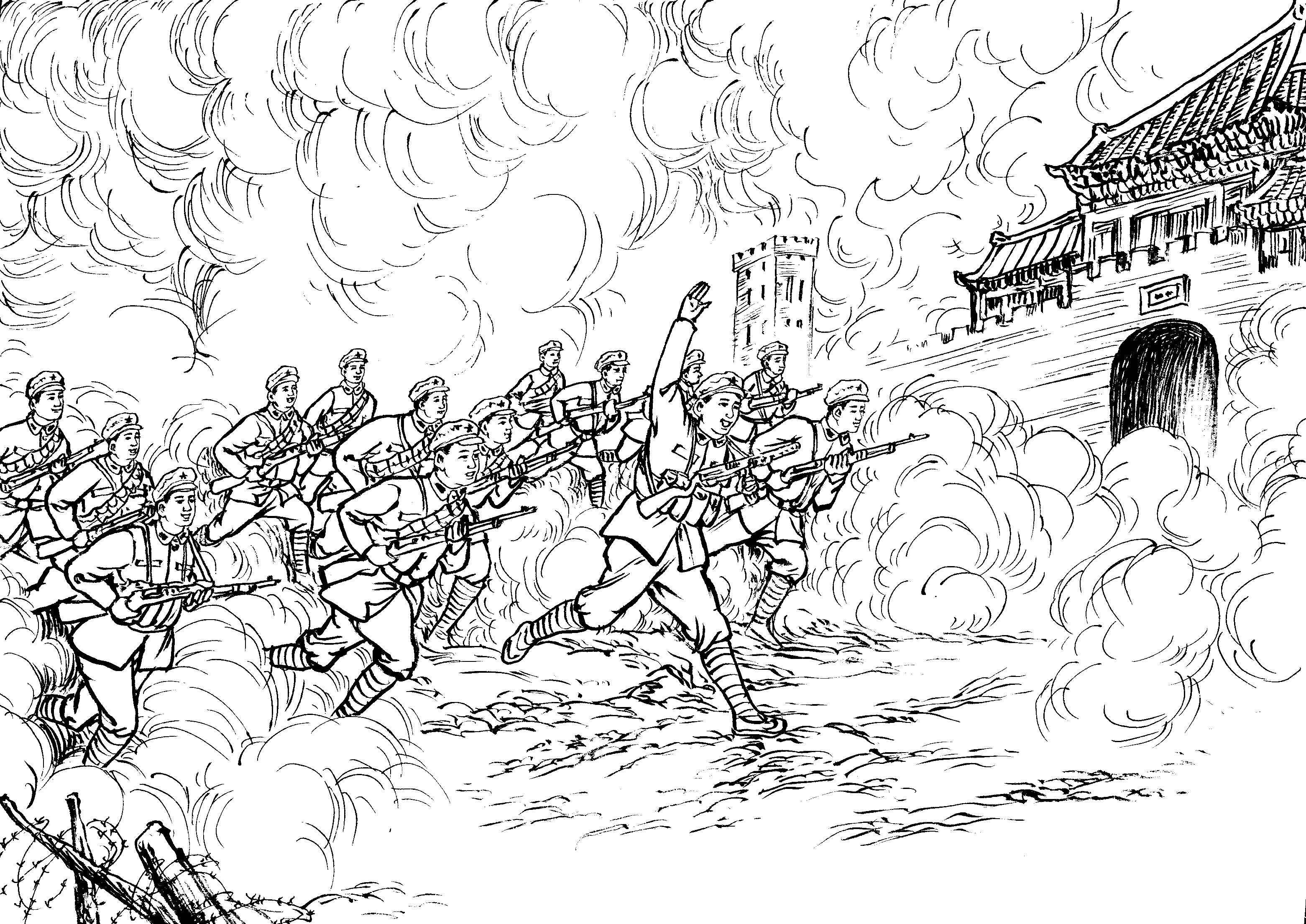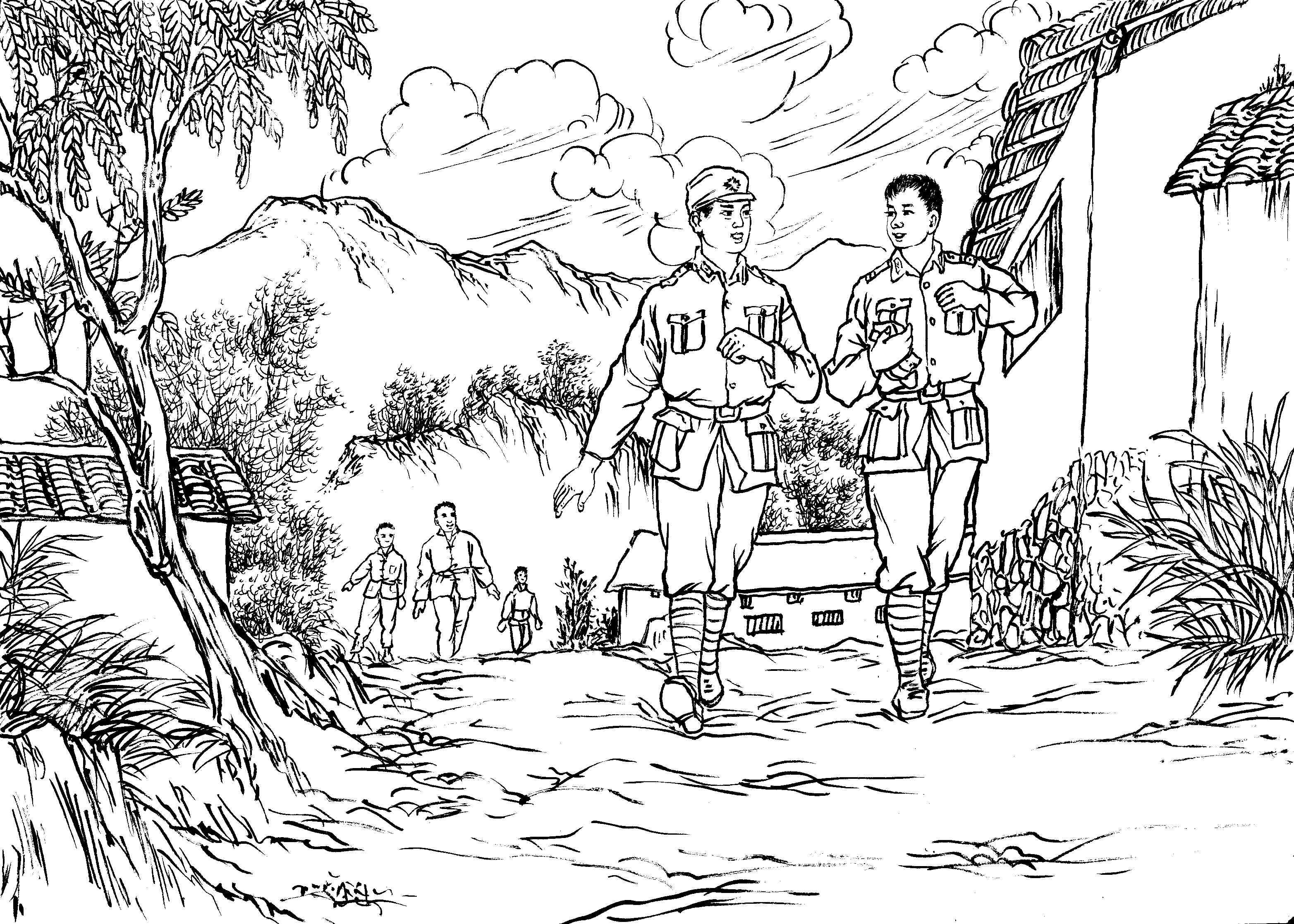 47. 战士们在城外整队,排成两列,中间是一挺重机枪,由3位战士扛着。营长和连长都喜欢康仲仁,让他一起走在队伍的最前头,雄纠纠气昂昂地进城。他的营长,就是后来被授予“全国战斗英雄”称号的魏尚友。