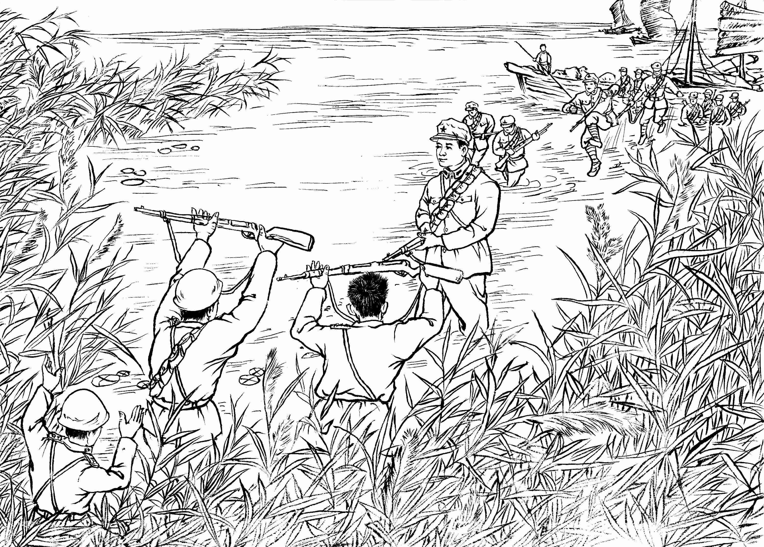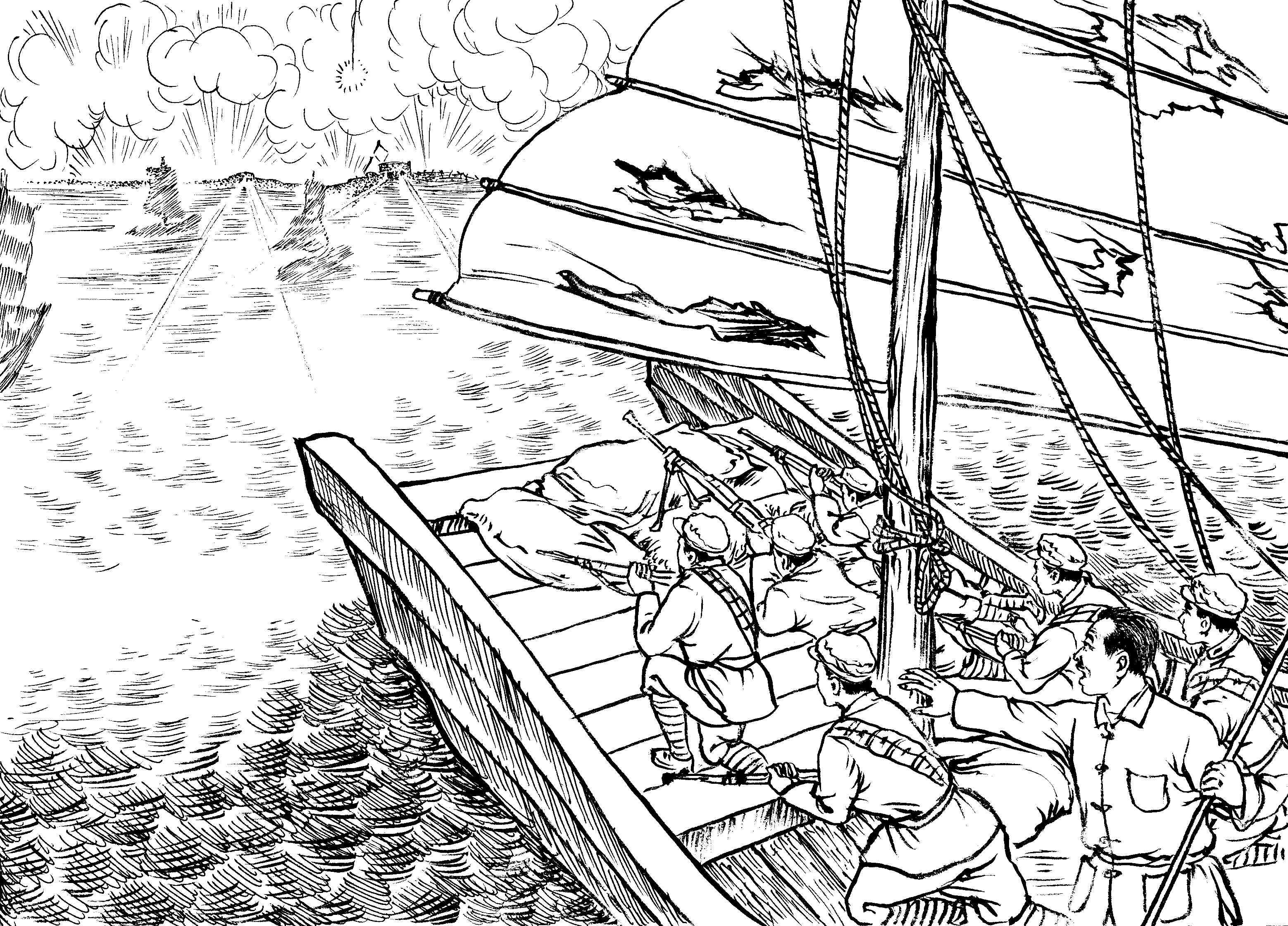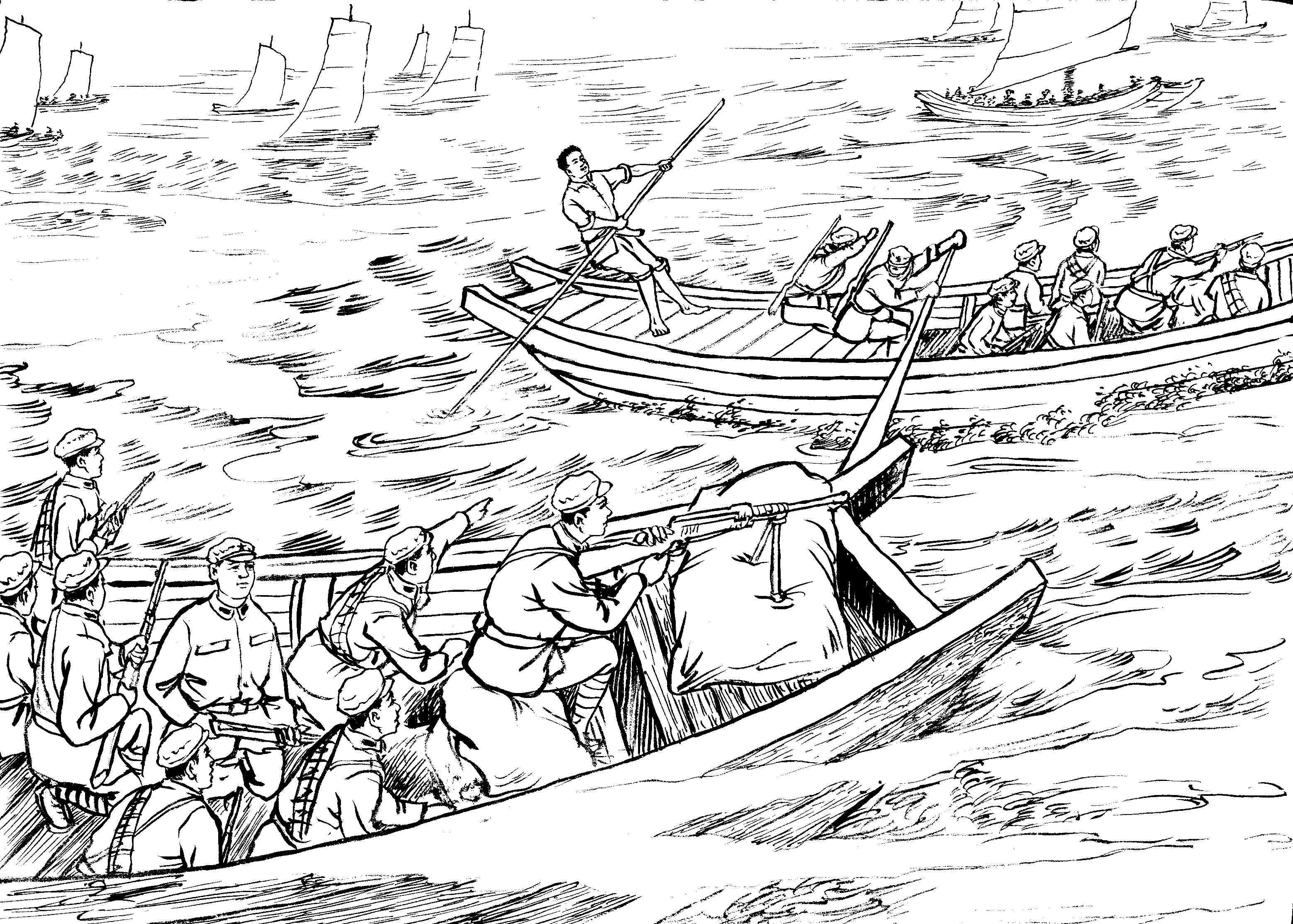 37. 船头堆放着两袋沙包,一挺机关枪架在上面。站在尾舵前的艄公是一位40多岁的当地船民,浓眉大眼,沉着稳当地操舵。为了加快船速,尽快到达对岸,战士们把铁锹、钢盔等一切手边能划水的东西,全部随身带上。