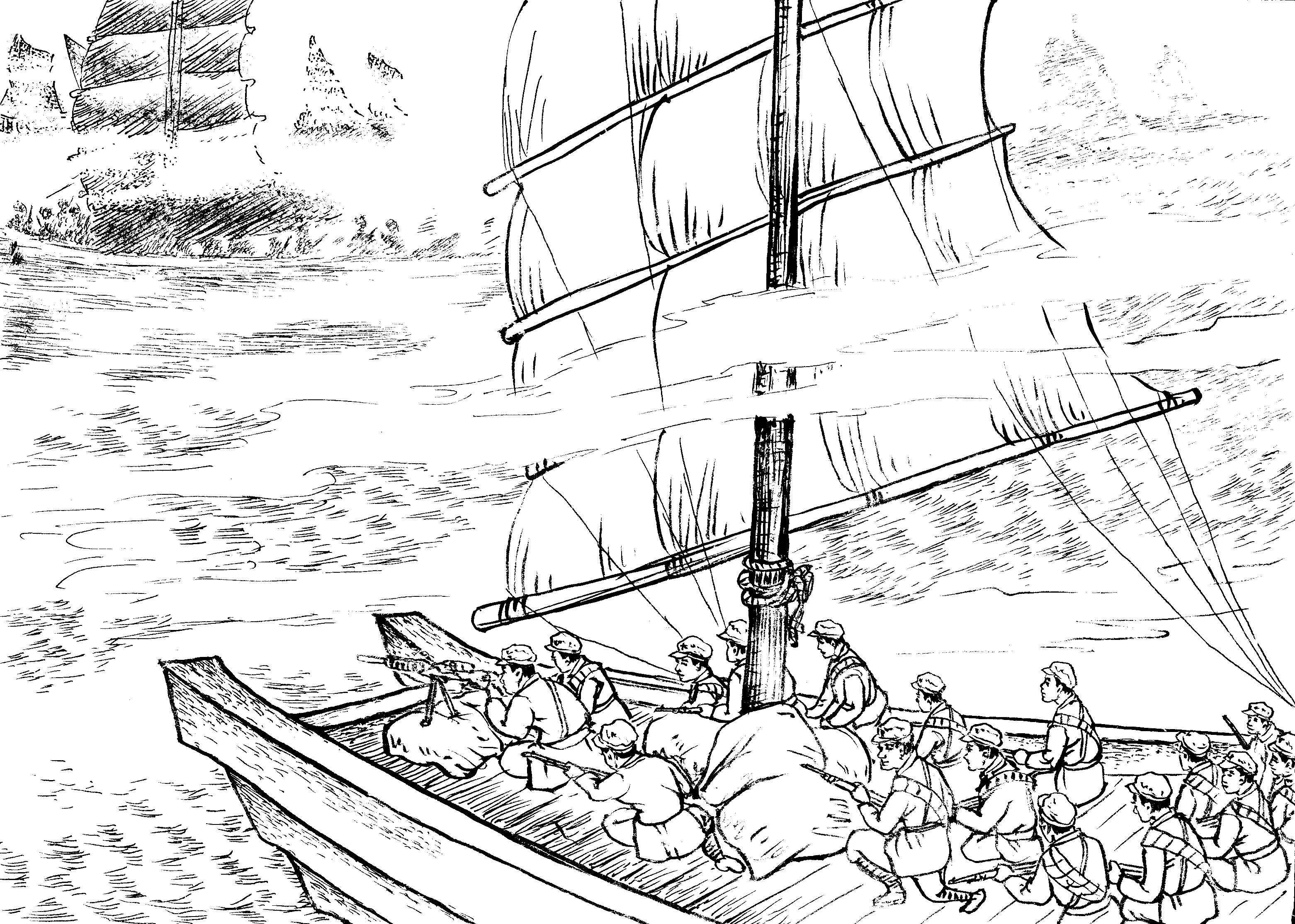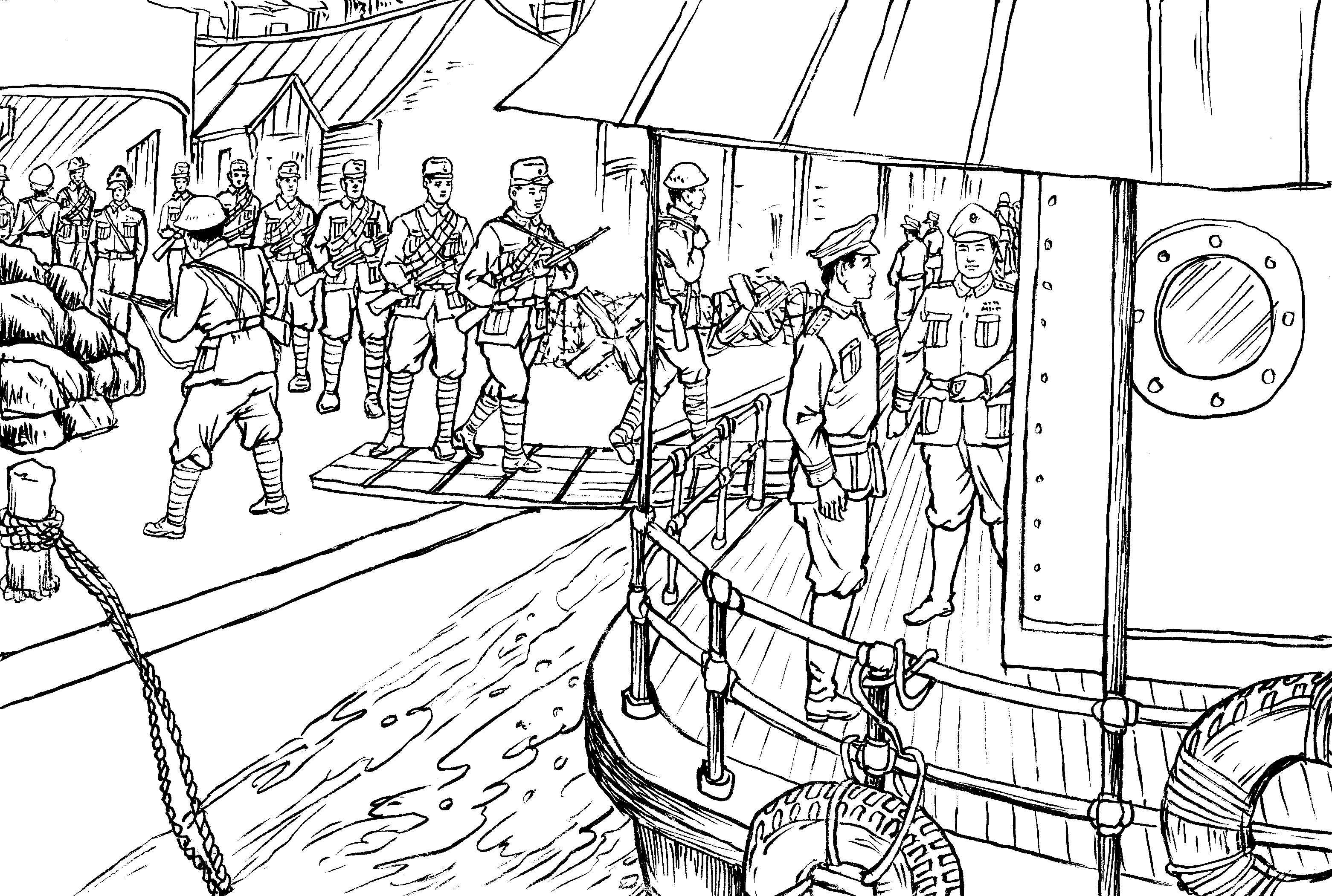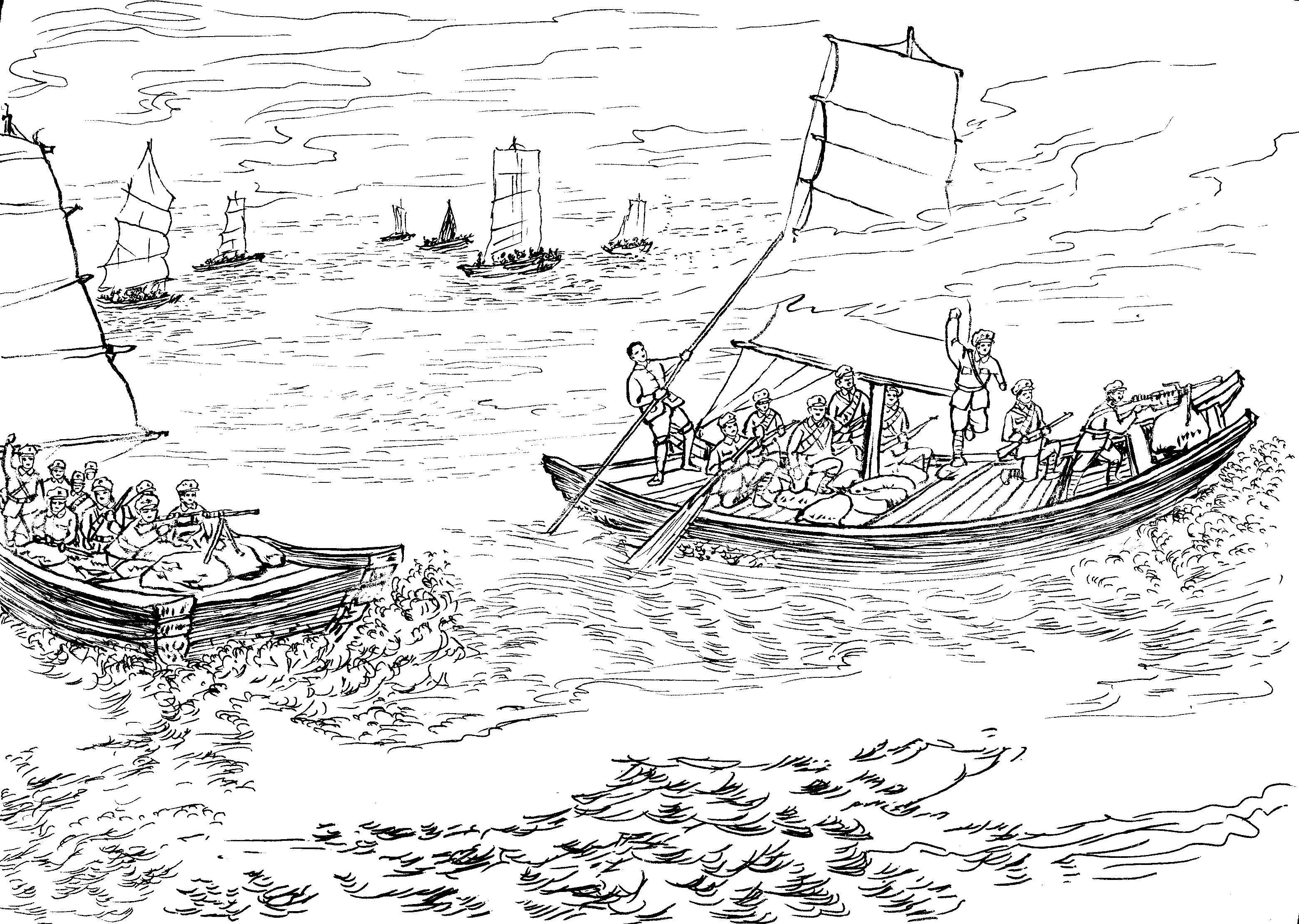37. 船头堆放着两袋沙包,一挺机关枪架在上面。站在尾舵前的艄公是一位40多岁的当地船民,浓眉大眼,沉着稳当地操舵。为了加快船速,尽快到达对岸,战士们把铁锹、钢盔等一切手边能划水的东西,全部随身带上。