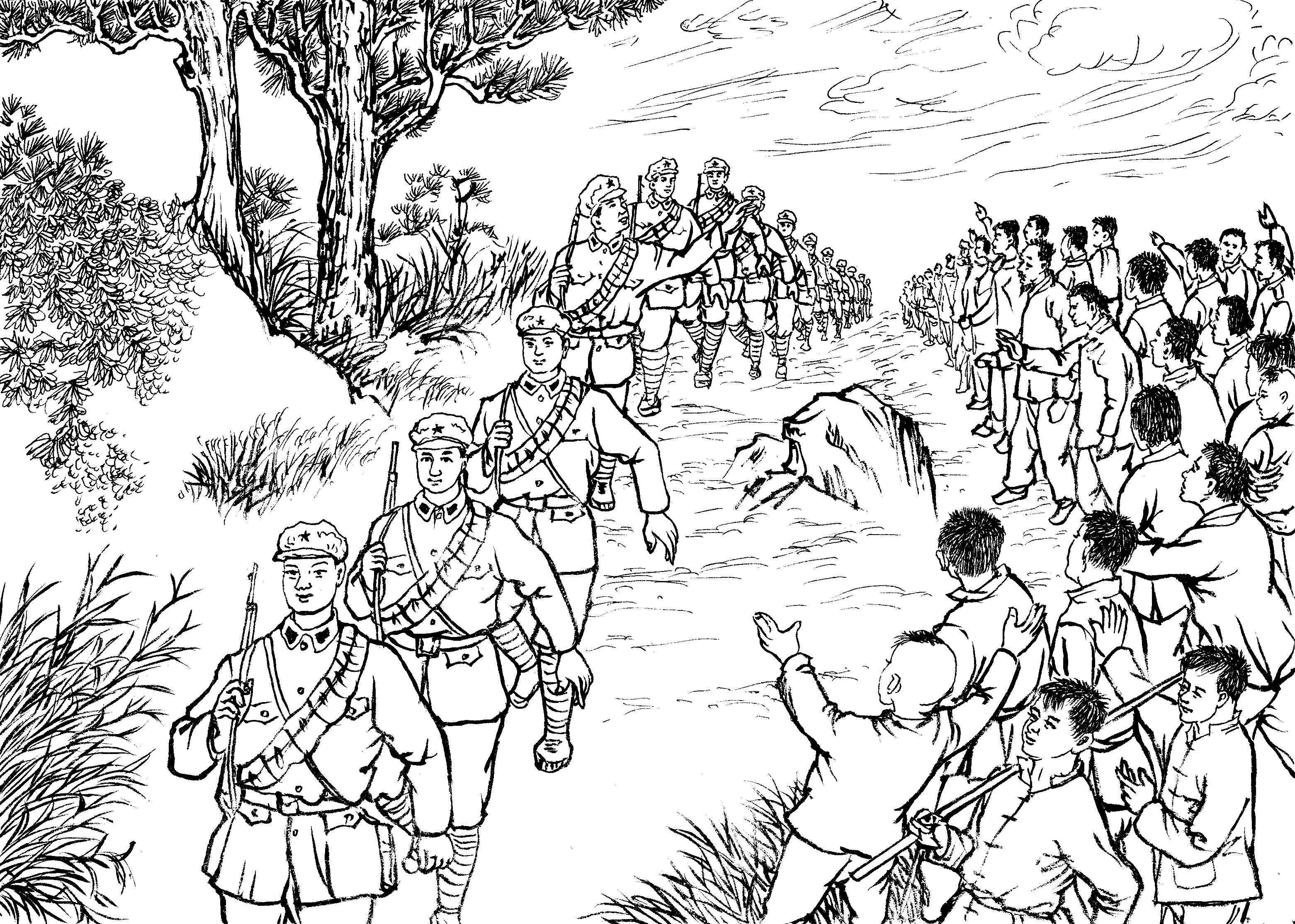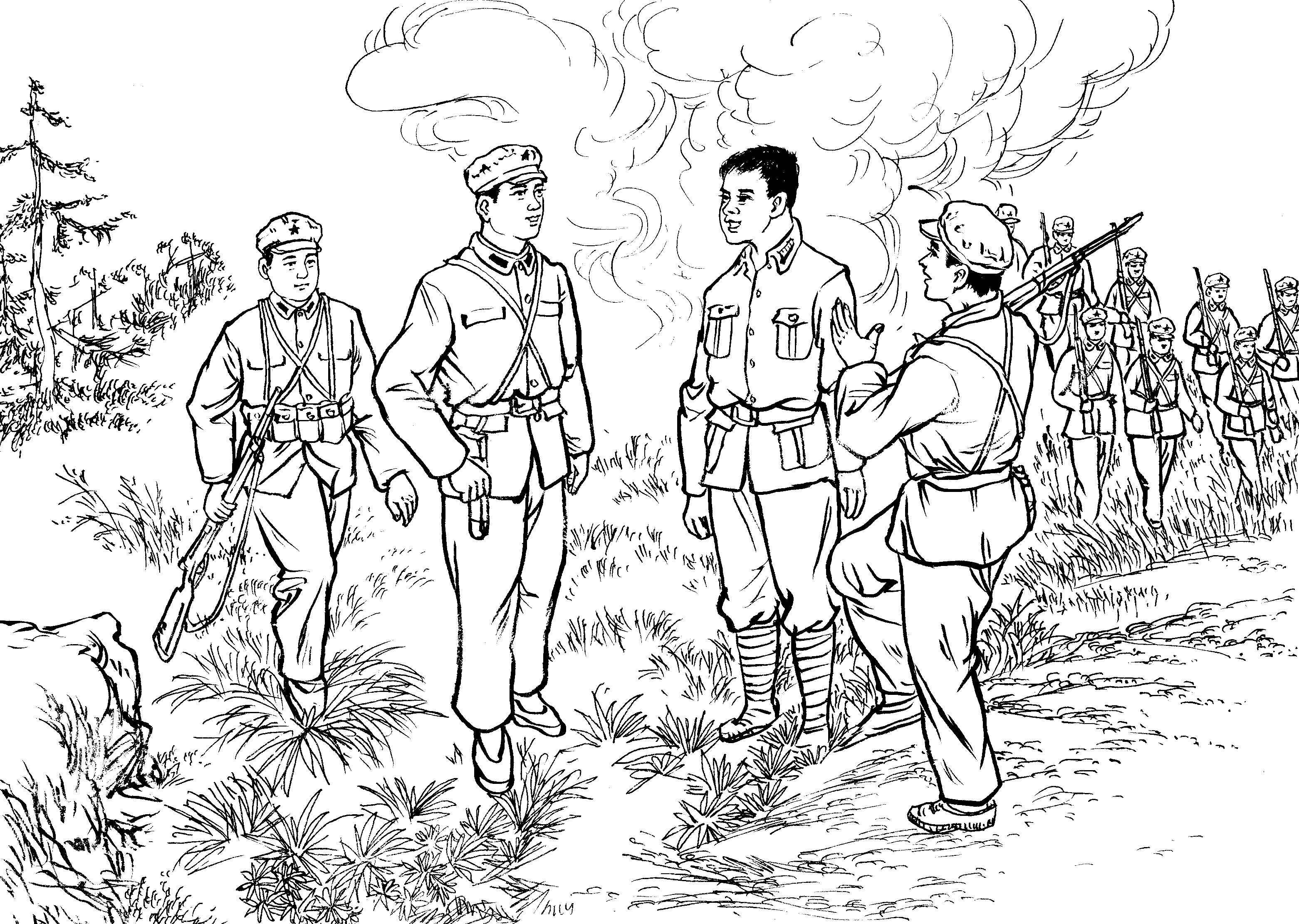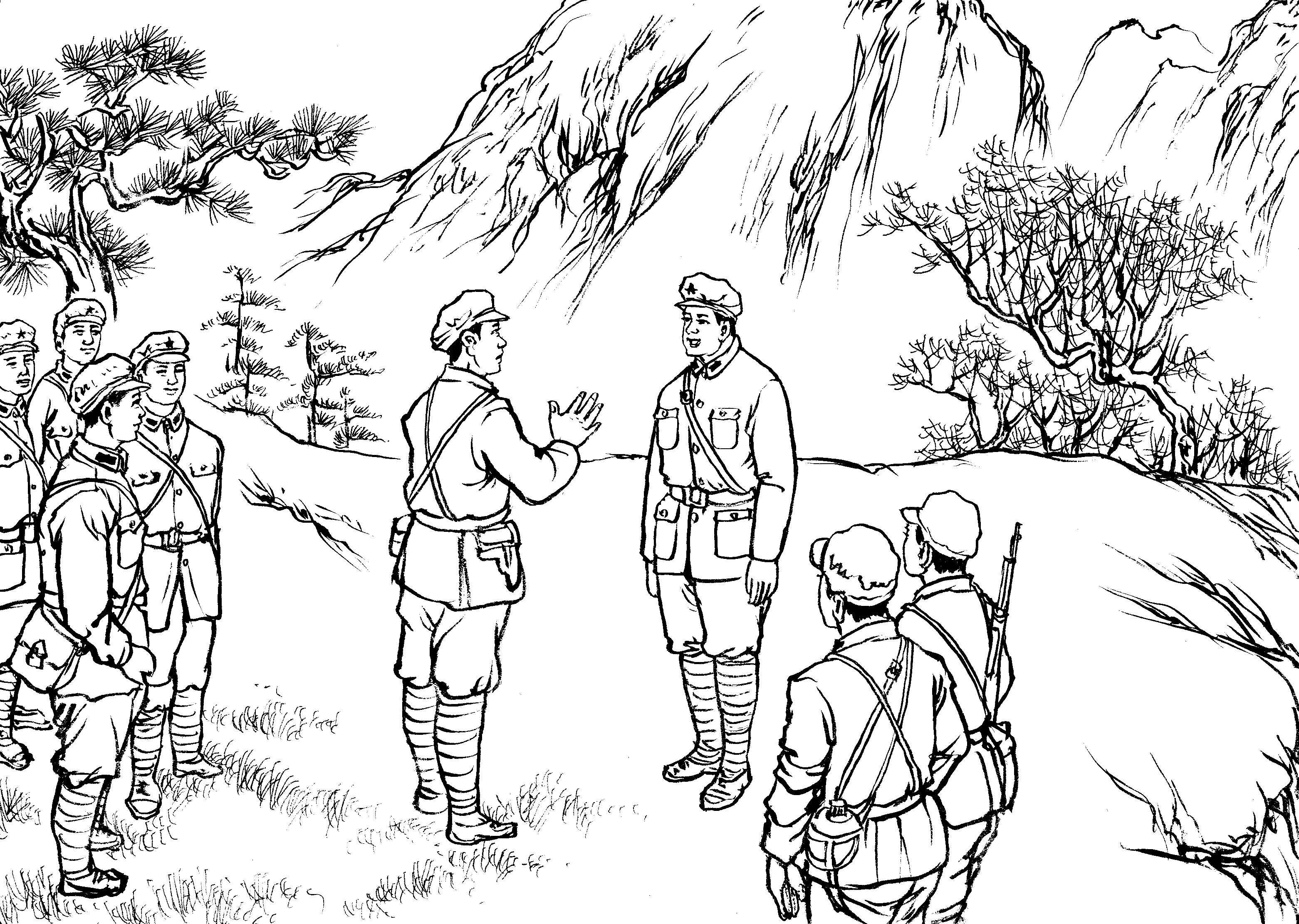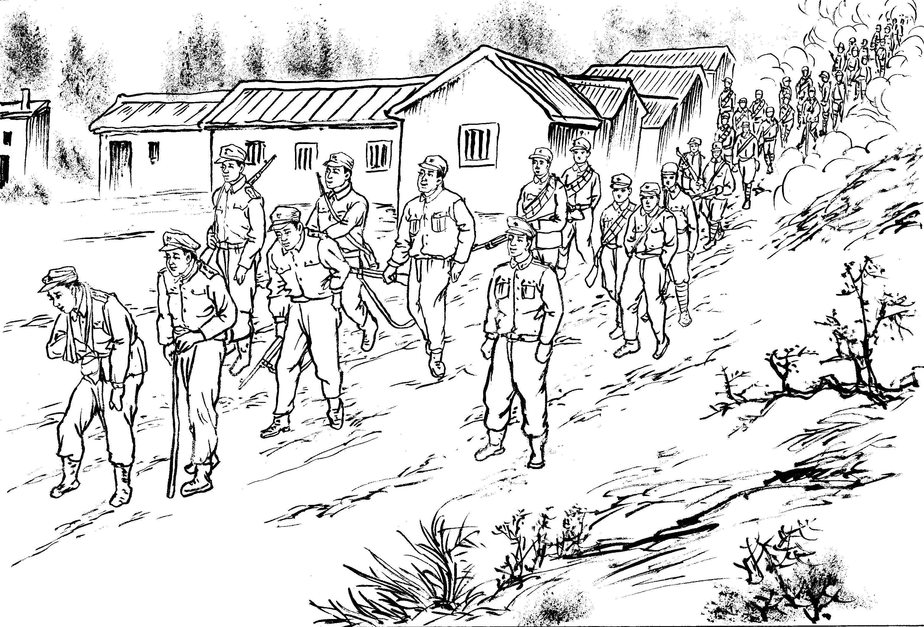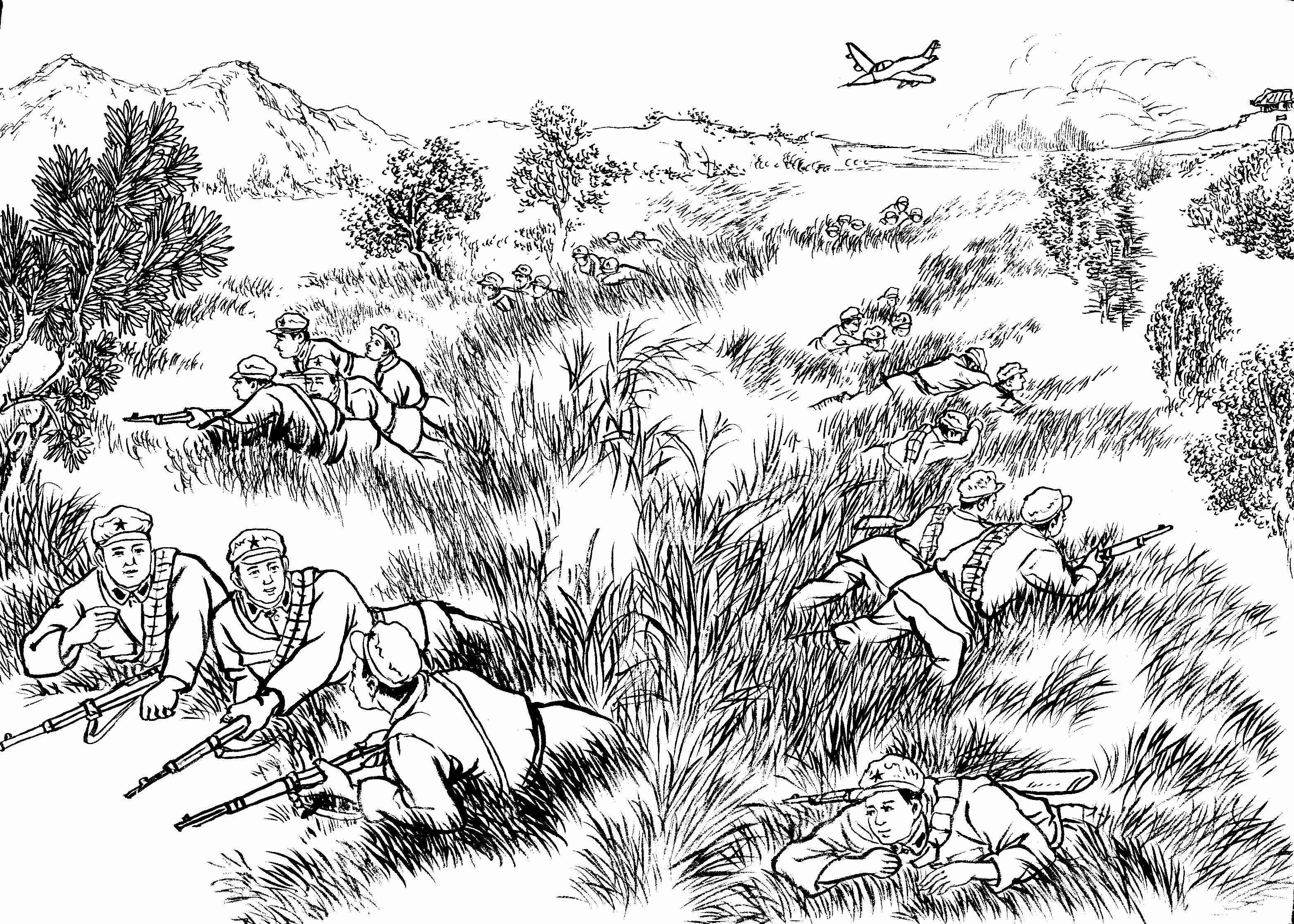 48. 不一会儿,国民党的一架飞机飞来了。营长命令队伍立即疏散,大家握着手中枪卧倒在道路两旁的山沟里、草丛中、大树下,敌机没有发现目标,低空盘旋几圈后又飞走了。