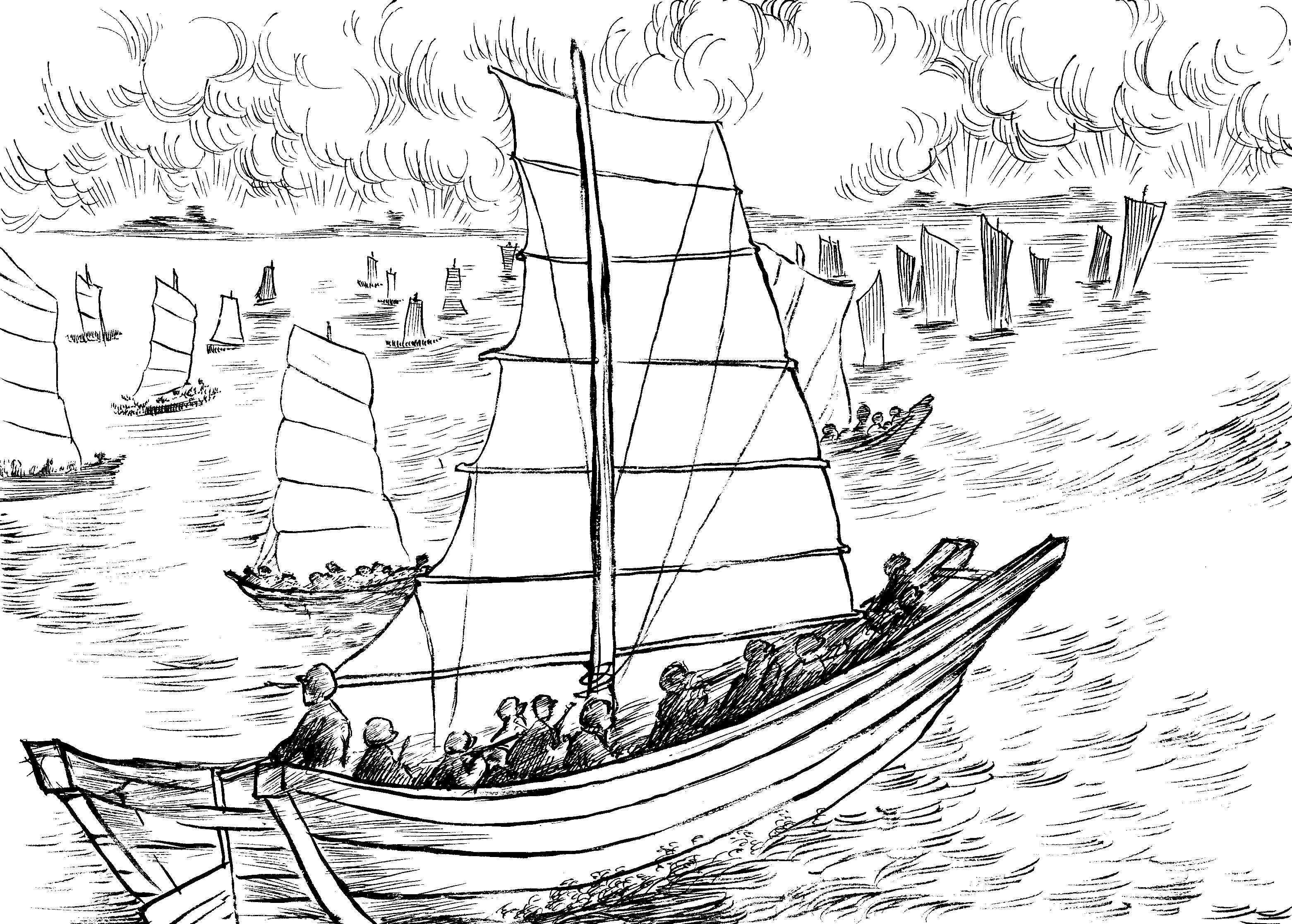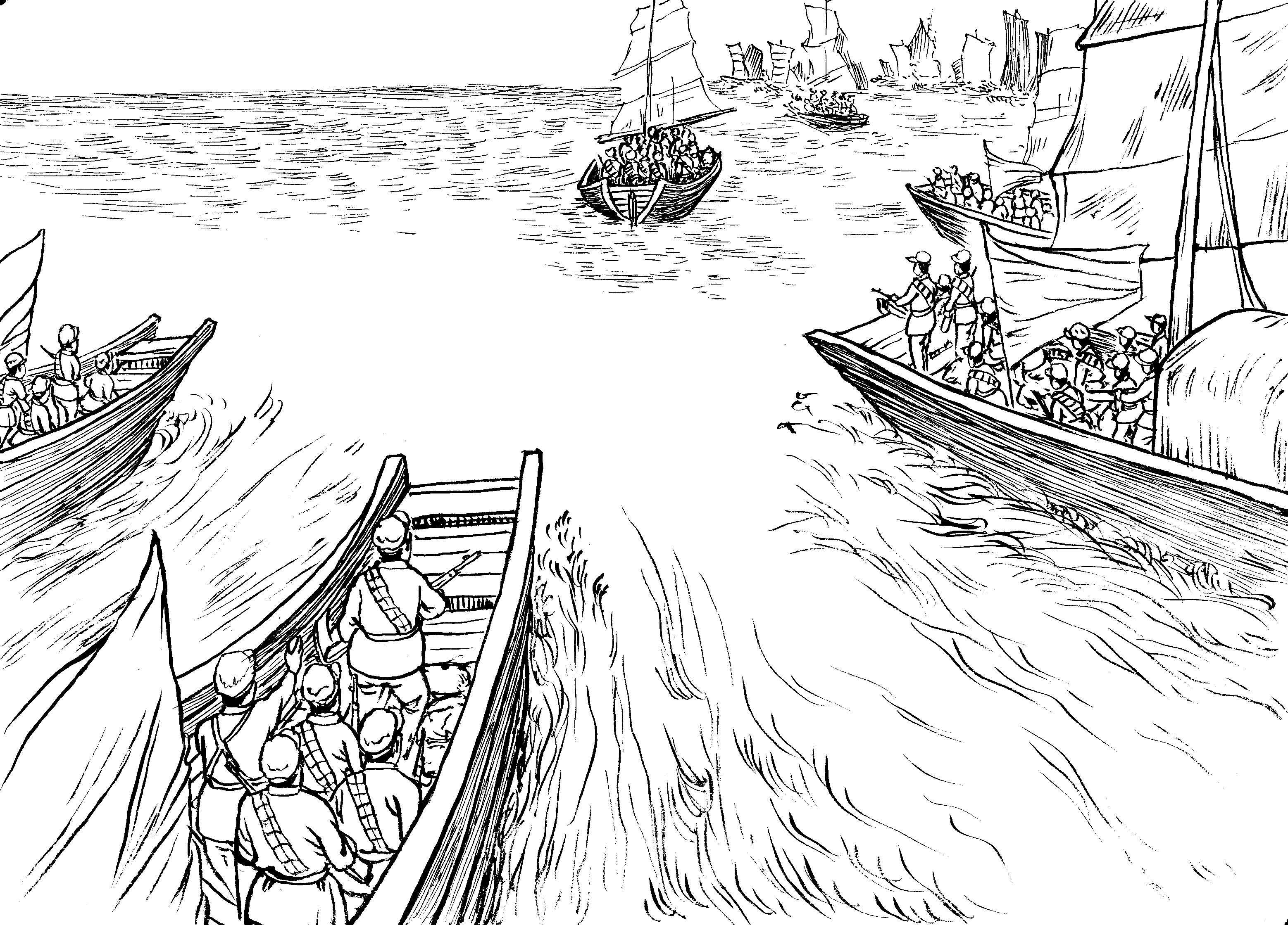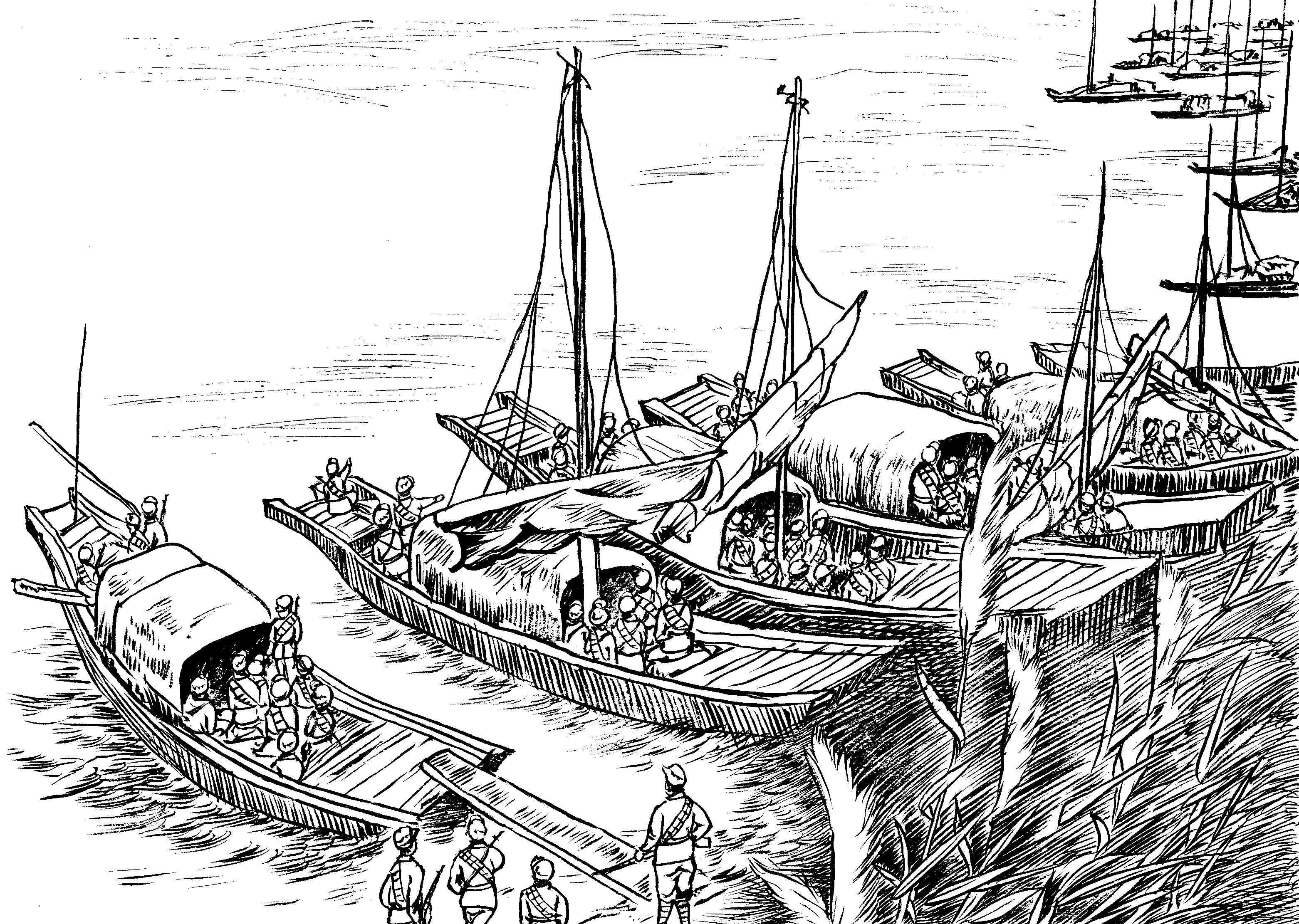 32. 我军突击部队打开了大堤出口,将隐蔽在内河道里的船只翻过堤坝推入大江边。空旷的江边,转眼间桅杆林立,篷帆招展;宽阔的江面波涛滚滚,涛声怒吼。