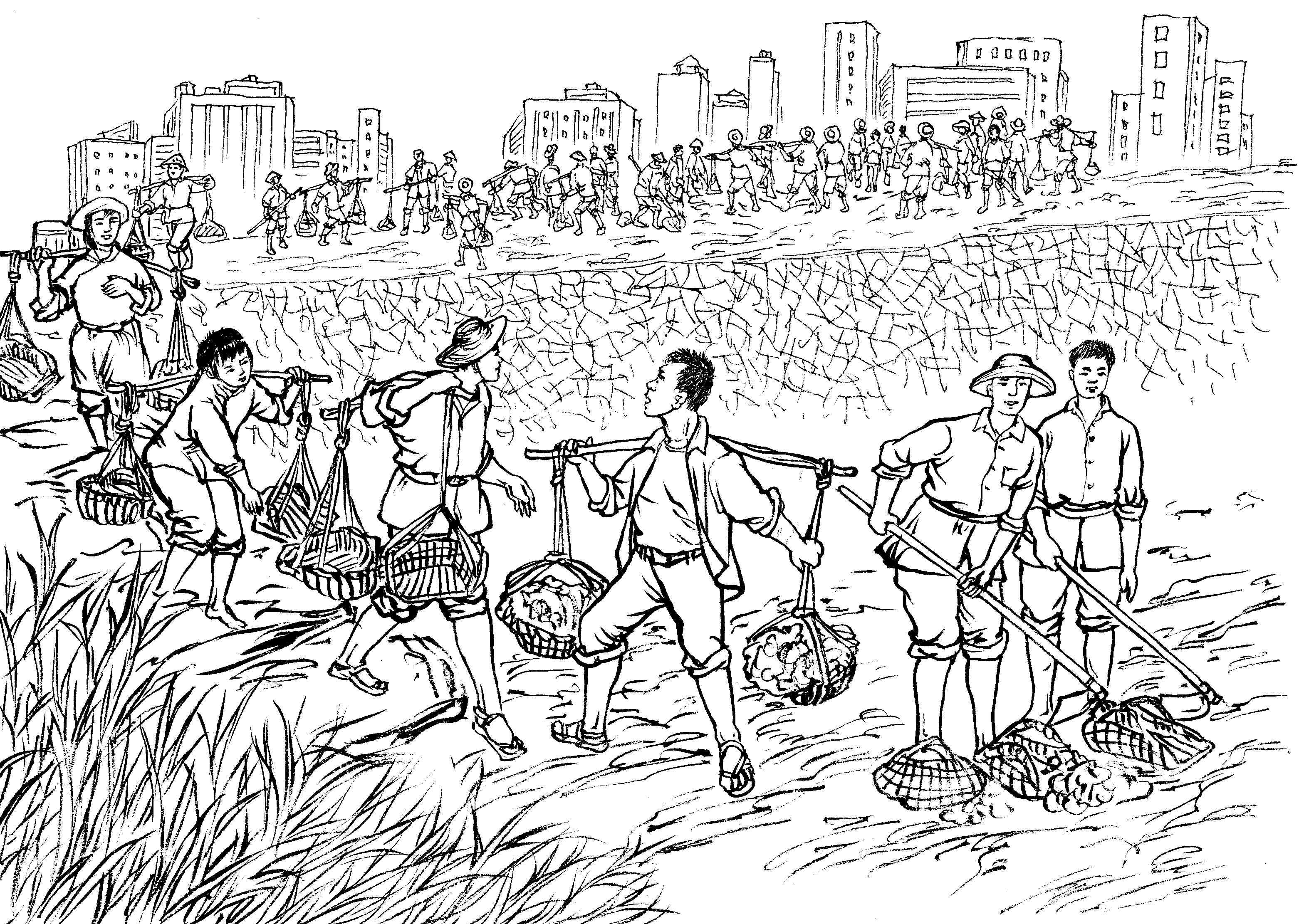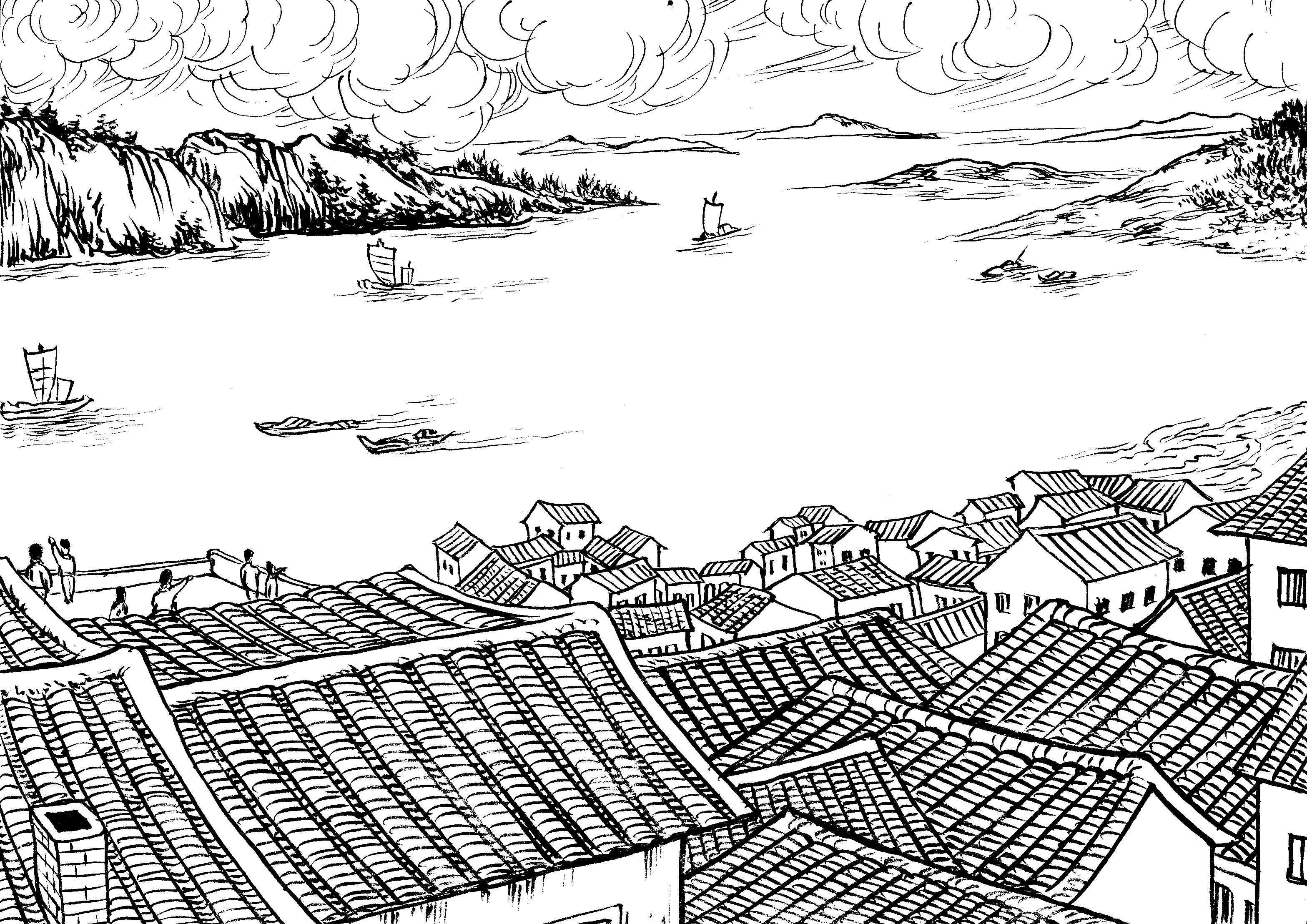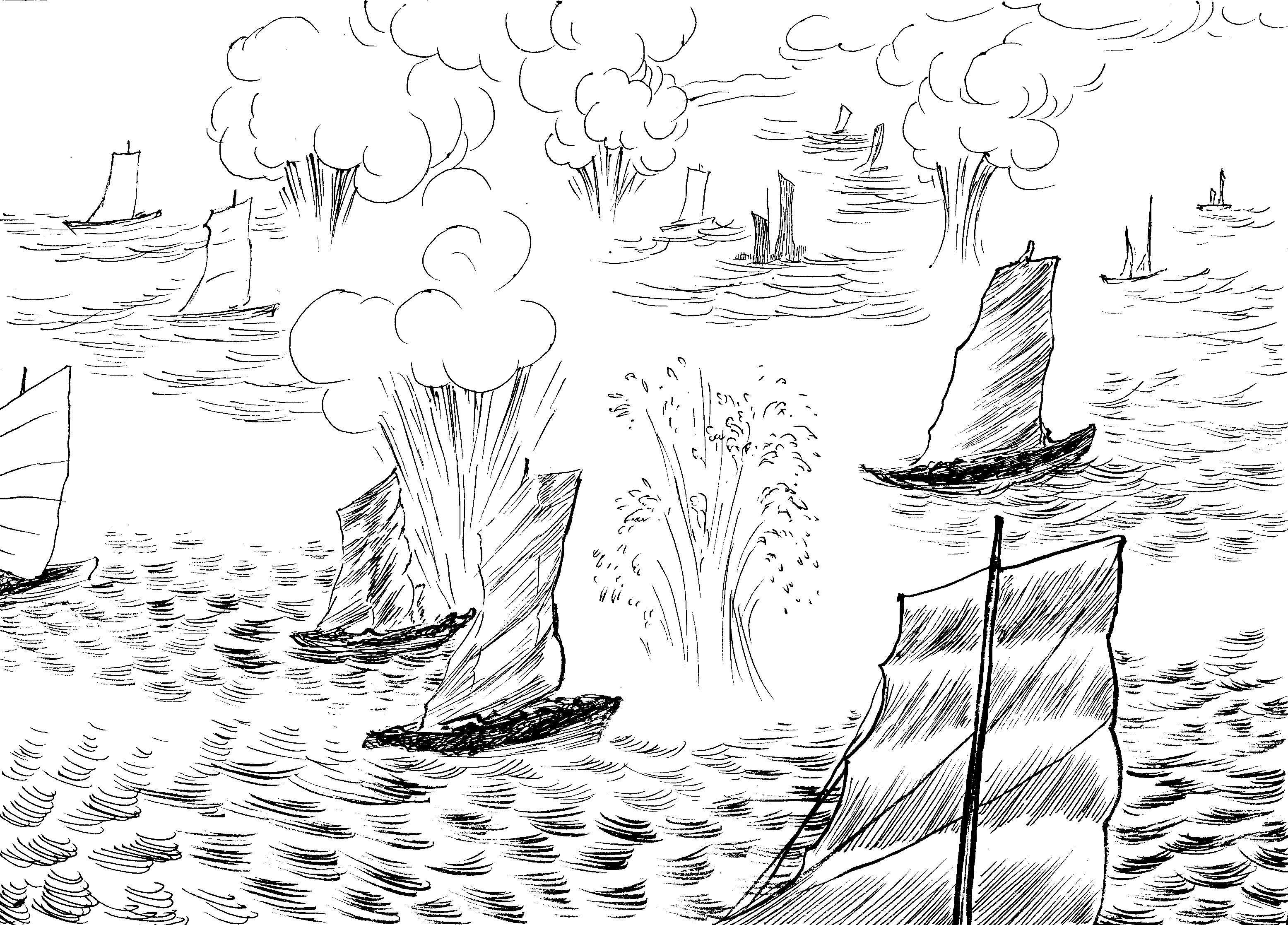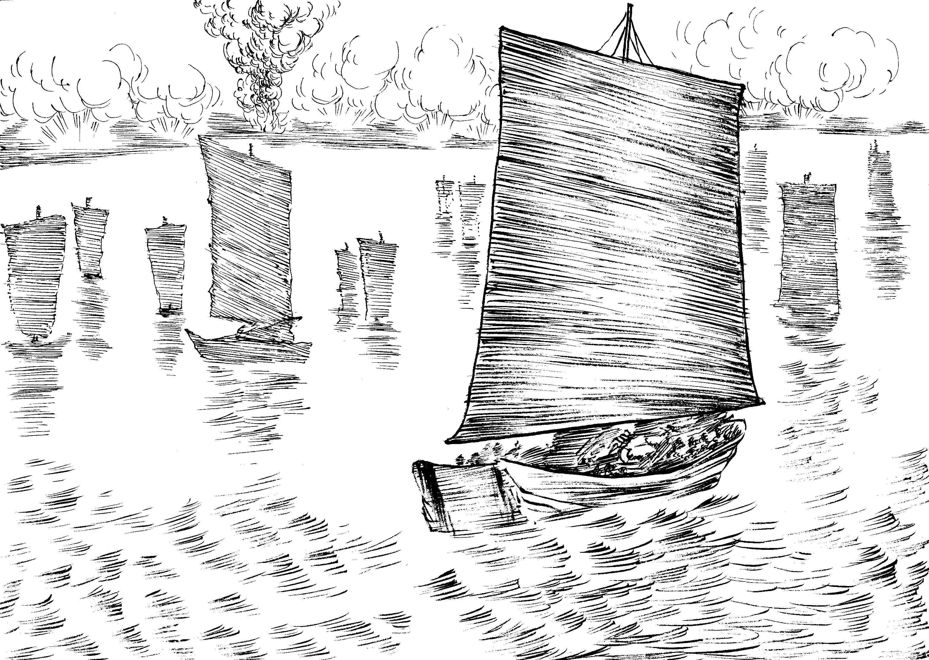 32. 我军突击部队打开了大堤出口,将隐蔽在内河道里的船只翻过堤坝推入大江边。空旷的江边,转眼间桅杆林立,篷帆招展;宽阔的江面波涛滚滚,涛声怒吼。