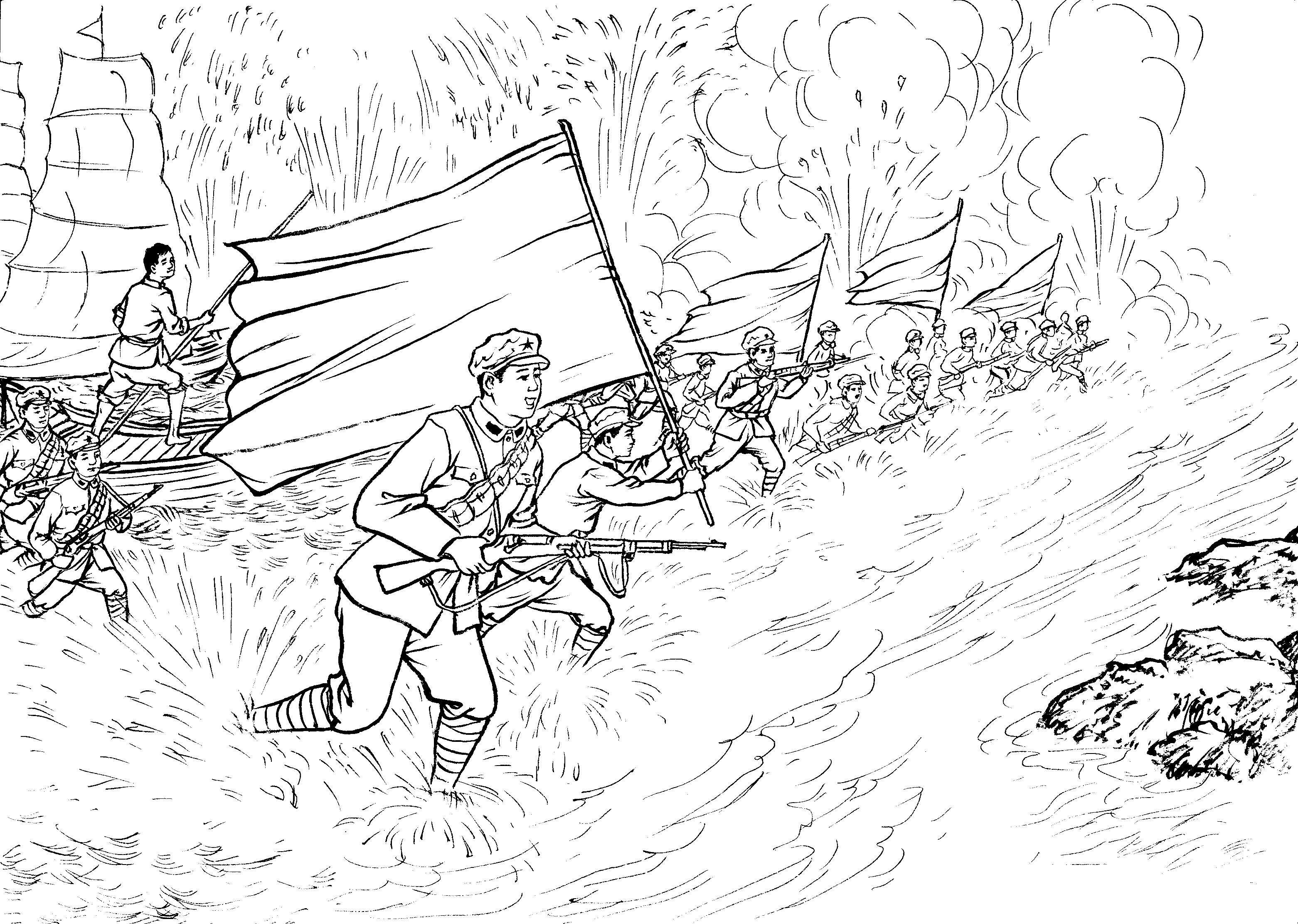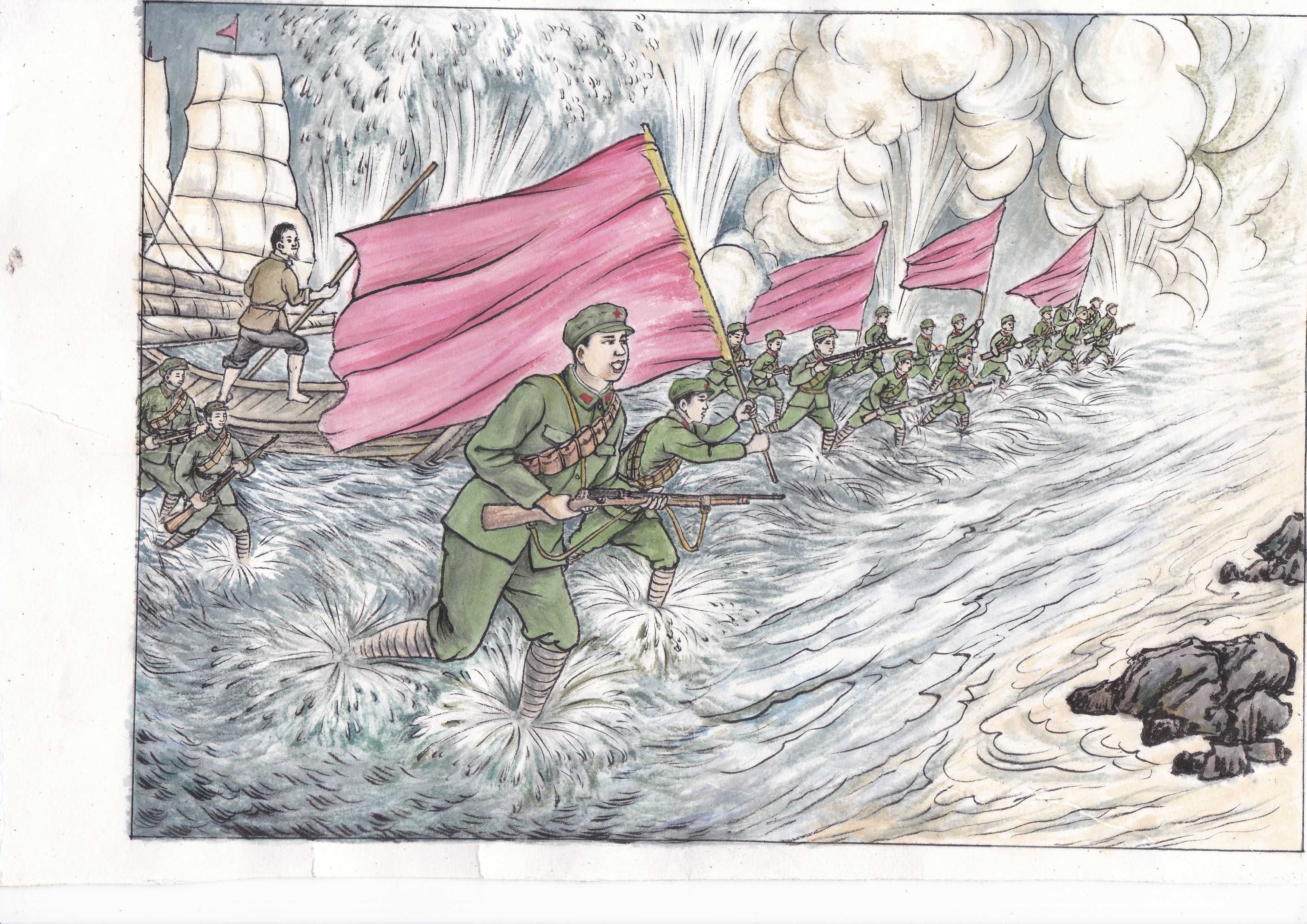 38. “轰隆隆,轰隆隆……”在我方炮火的掩护下,一只只渡船带着坚强勇敢的解放军战士,穿行于波涛浪尖,向南岸驶去。国民党军重机枪迎面疯狂扫射,子弹在身边“咻咻咻”地飞过,犹如千万颗流星从四周掠过。