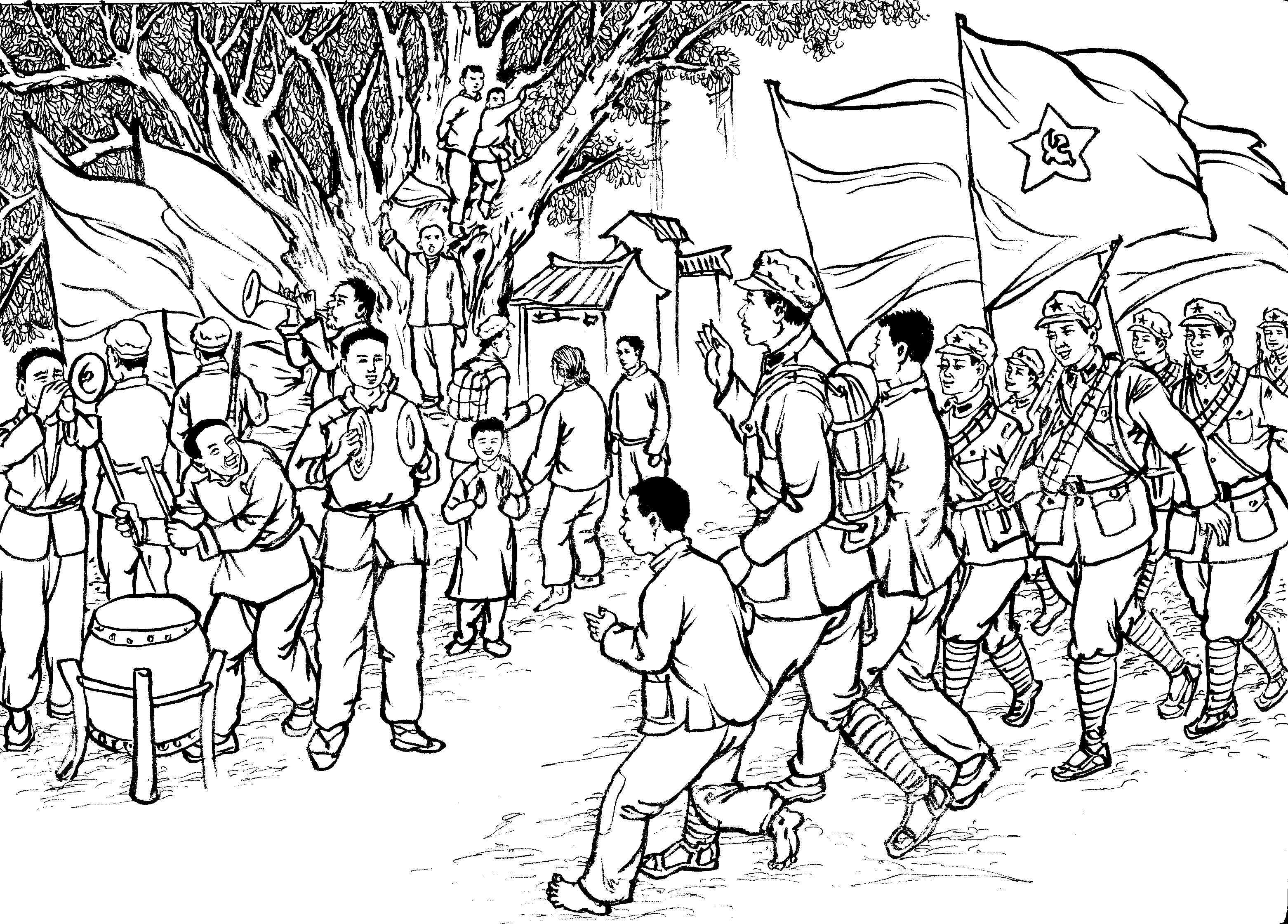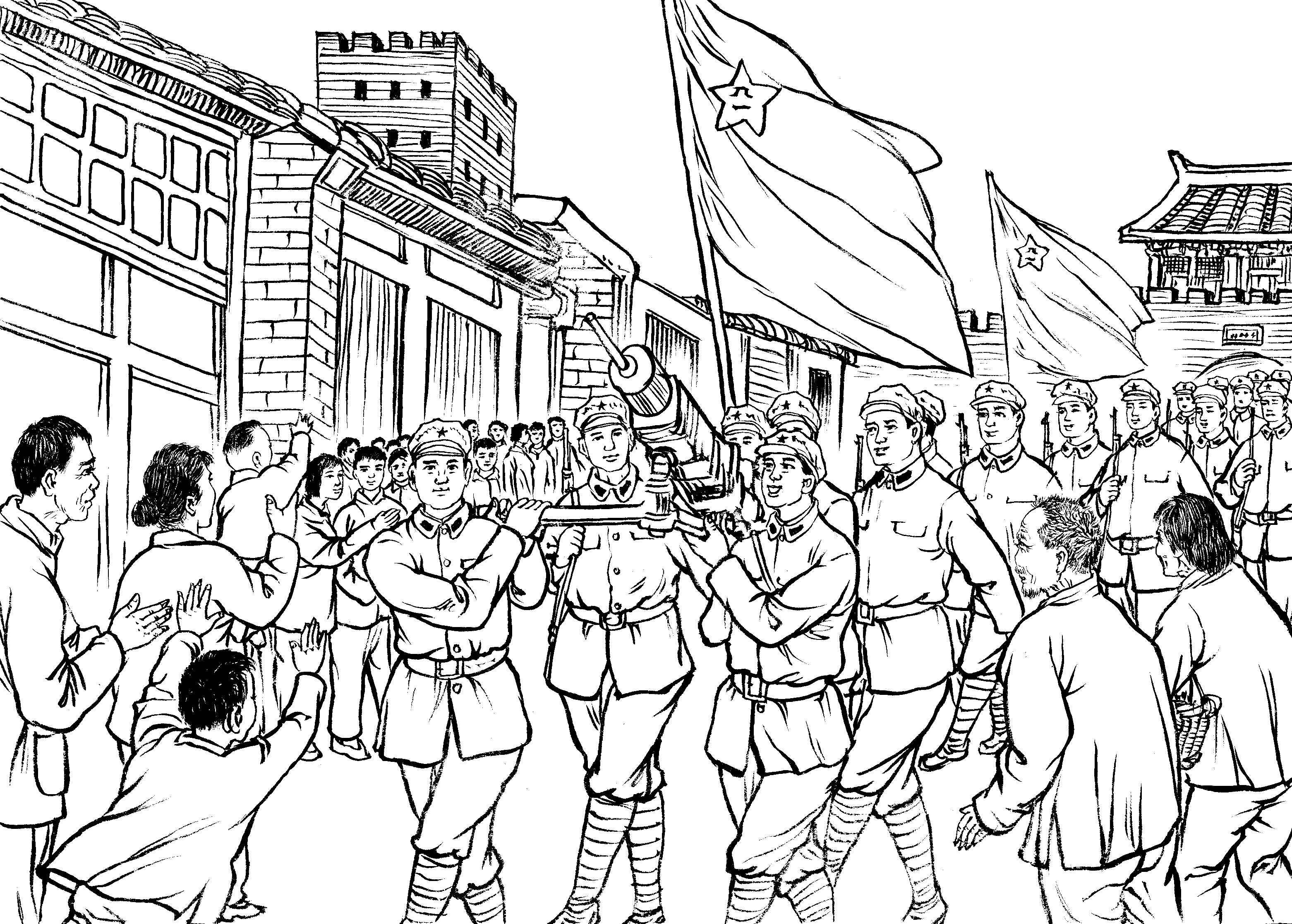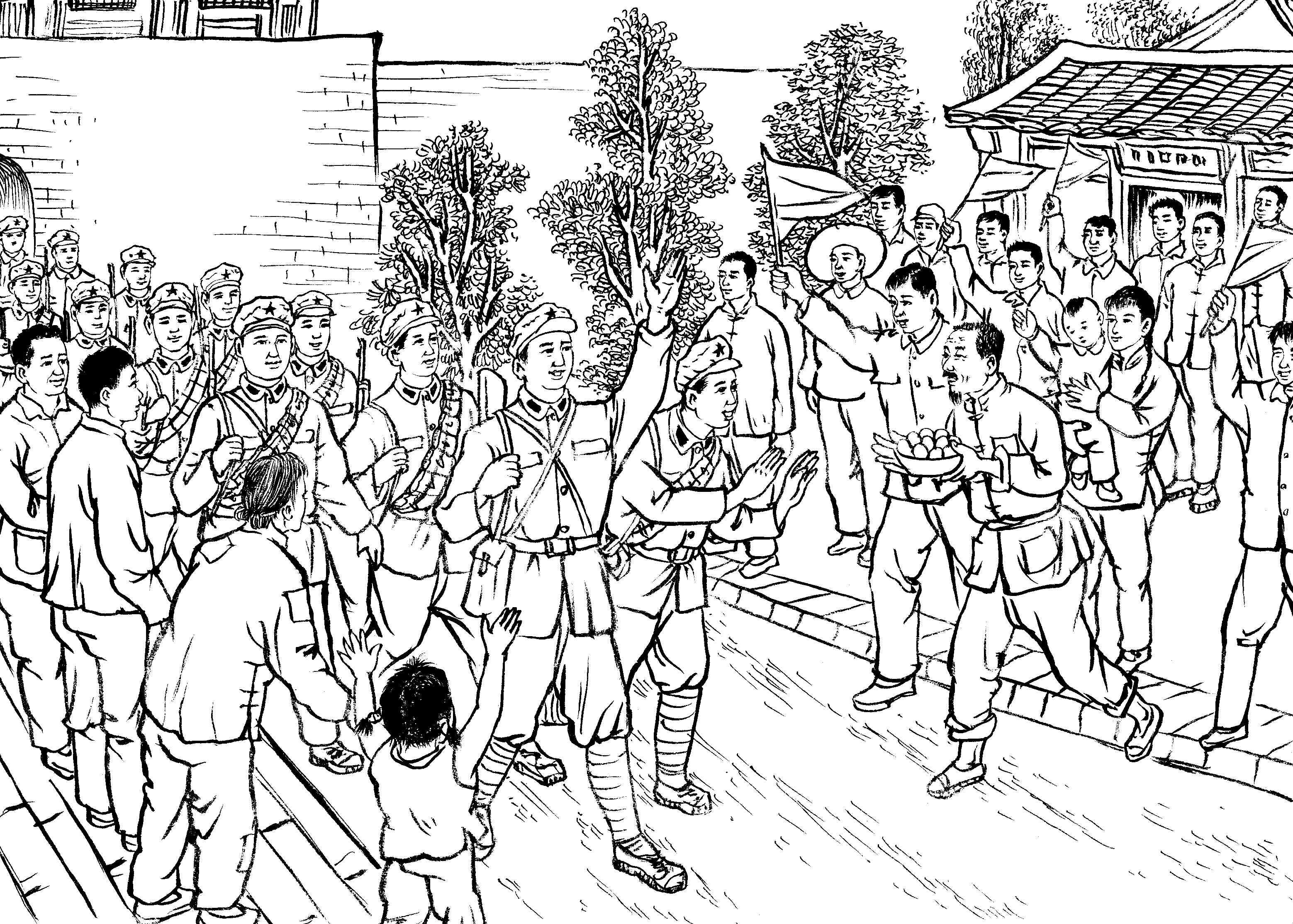 49. 部队进城后,市民们兴高采烈,站在街道两旁,举着鲜艳的三角彩旗,箪食壶浆,迎接正义之师。整个杭州城里充满胜利的喜悦。战士们的脸上洋溢着骄傲与荣光。