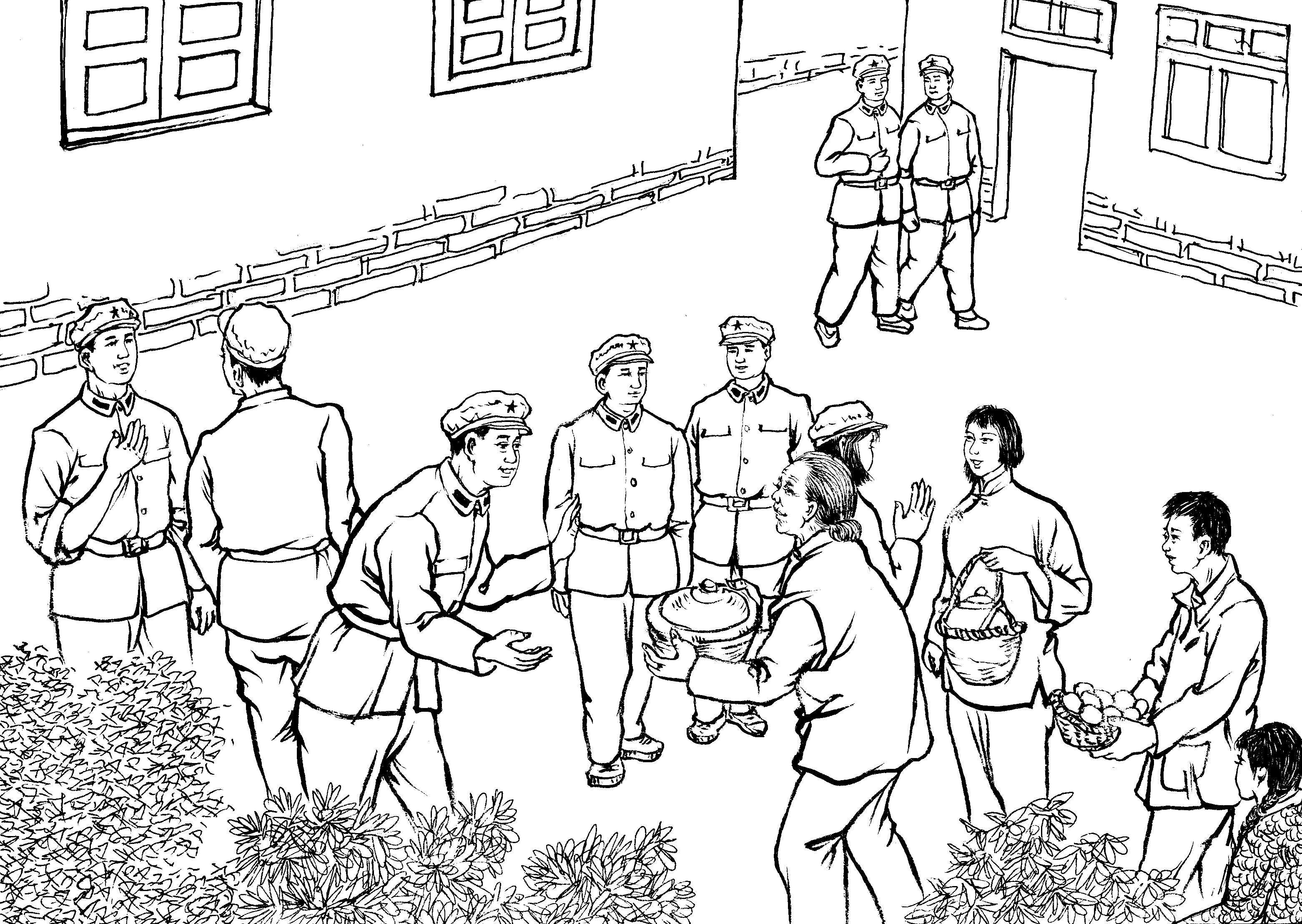 52. 解放军的行为举止,老百姓都看在眼里感动在心,不少老百姓给他们送吃的。一个老阿婆炖了老鸭竹笋汤送过来,香喷喷的,令人垂涎三尺。但他们婉言谢绝,谁都不喝。三天后,市场上的商品进行定价后,部队去买菜,才结束了吃油盐饭的日子。