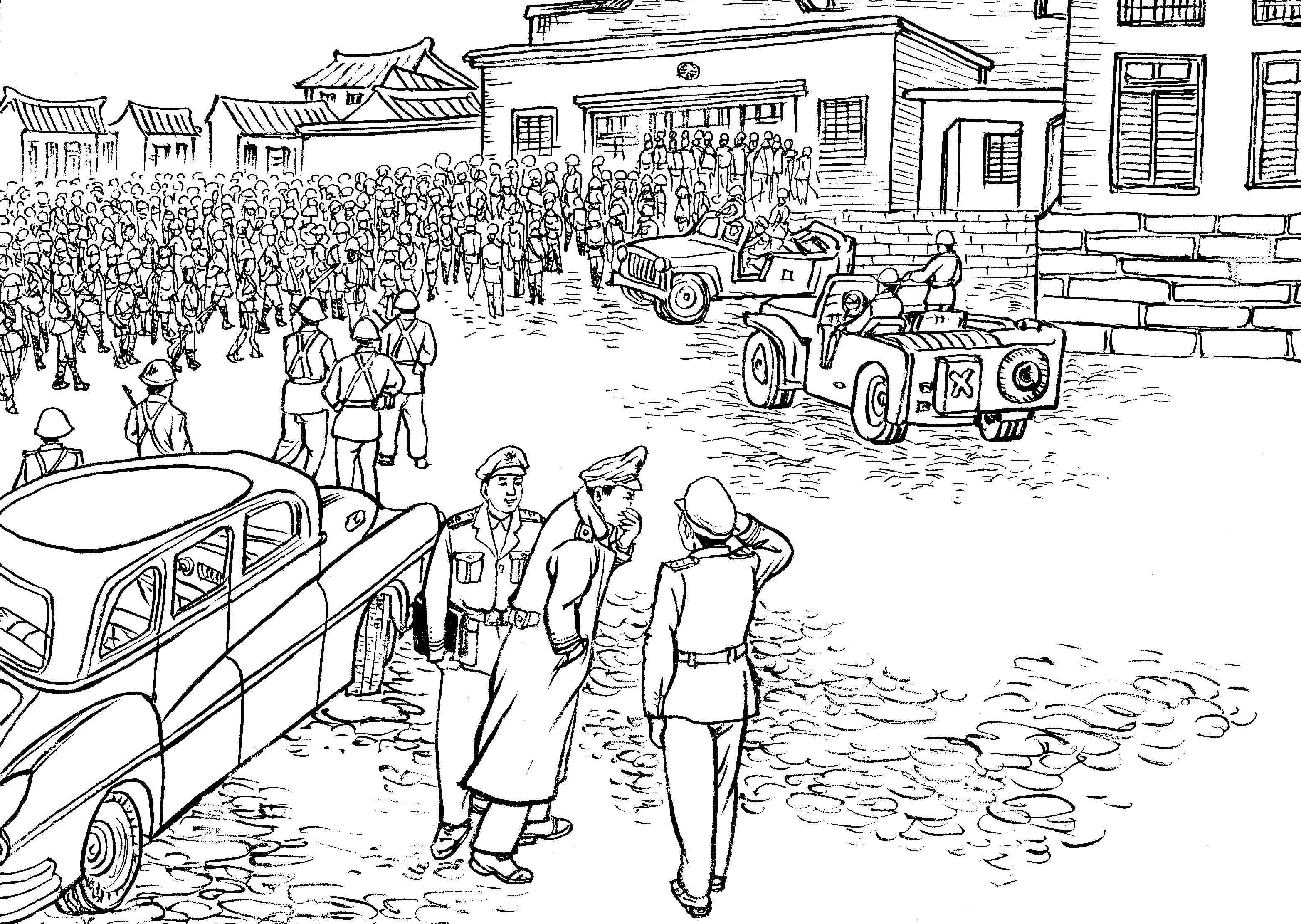 53. 1949年10月1日那一天,部队开拔到城外,指导员告诉他们:今天,中华人民共和国中央人民政府成立啦!我们胜利啦!大伙儿欢呼跃雀。部队给战士加餐庆祝。
