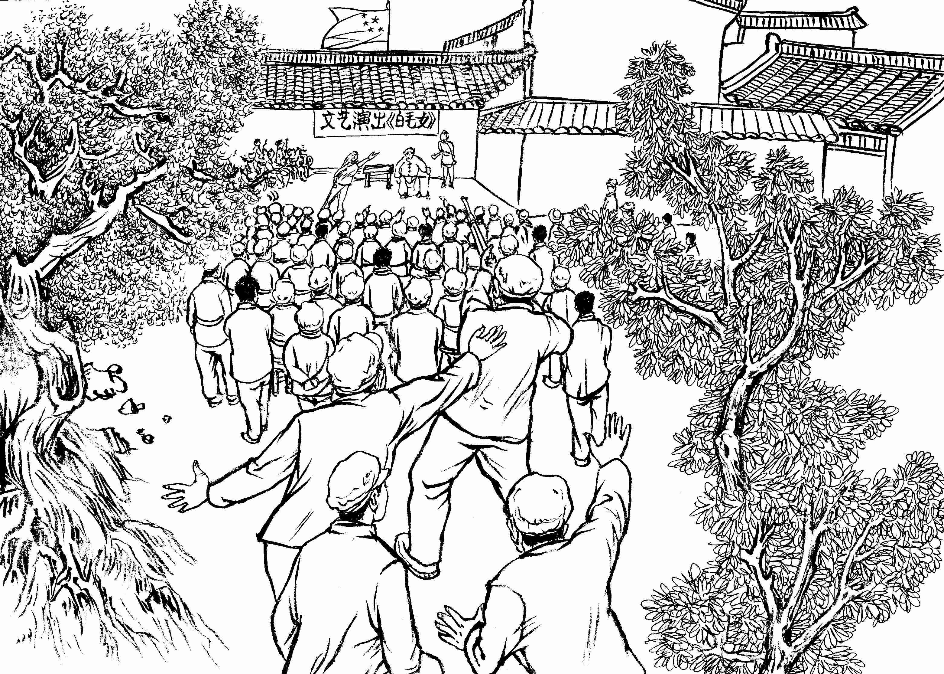 57. 一天晚上,部队文工团前往溪口镇慰问演出 ,出演话剧《白毛女》,大家感触良多。当场有个站岗的战士神情激动,拿起枪对着扮演地主黄世仁的演员就要射击。战士们更加坚信,只有共产党,才能让劳苦大众翻身解放。