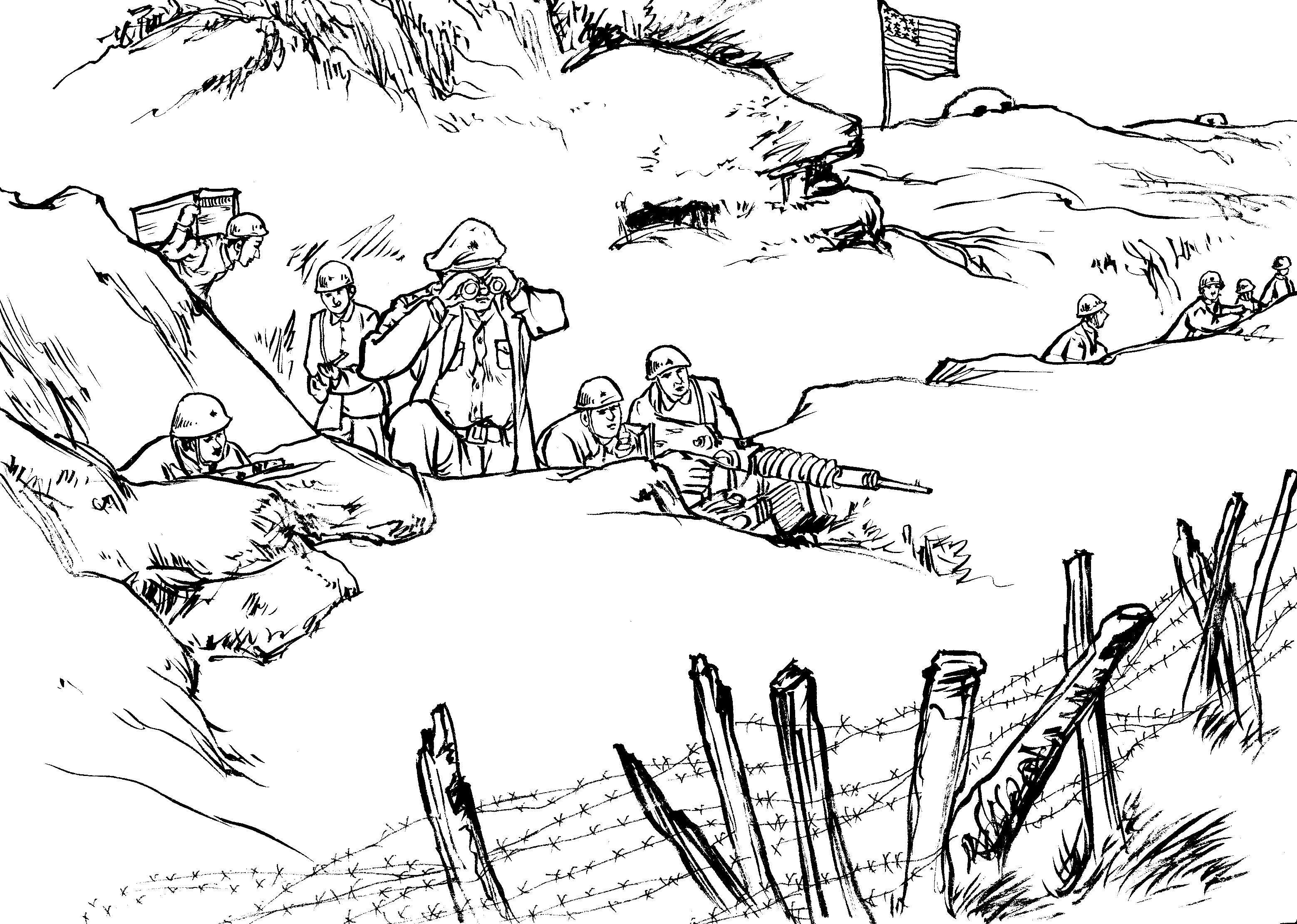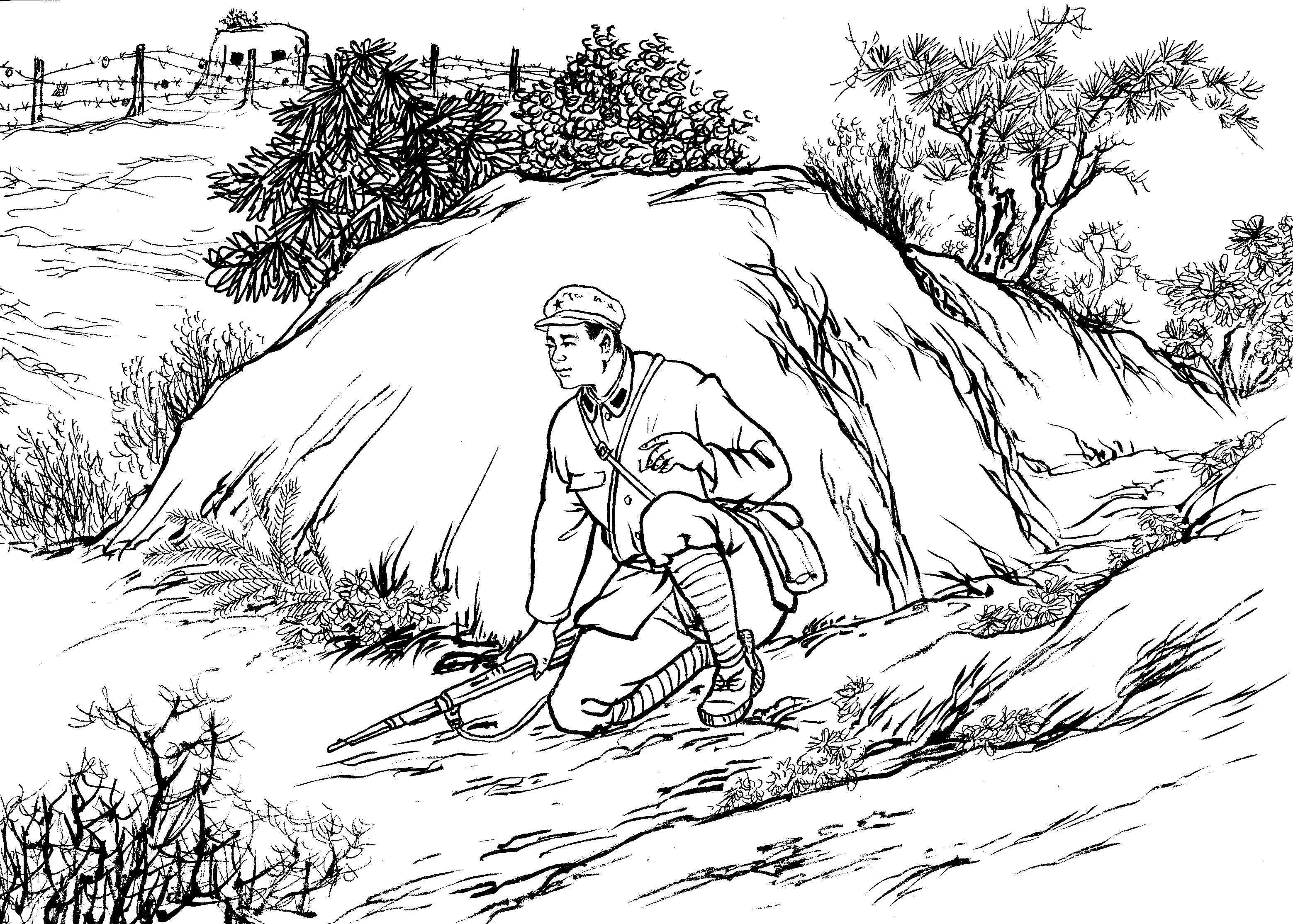 73. “血债要用血来还。”“没有恐惧,没有害怕,只有向前!向前!向前!”康仲仁带领侦察排的战士,一次次出色地完成任务,部队攻下了一个个山头,阵地一段段往上推进。这样,我军和美军终于各自占据一个高地,两军对峙。他们排三班的战士就部署在前沿阵地上。