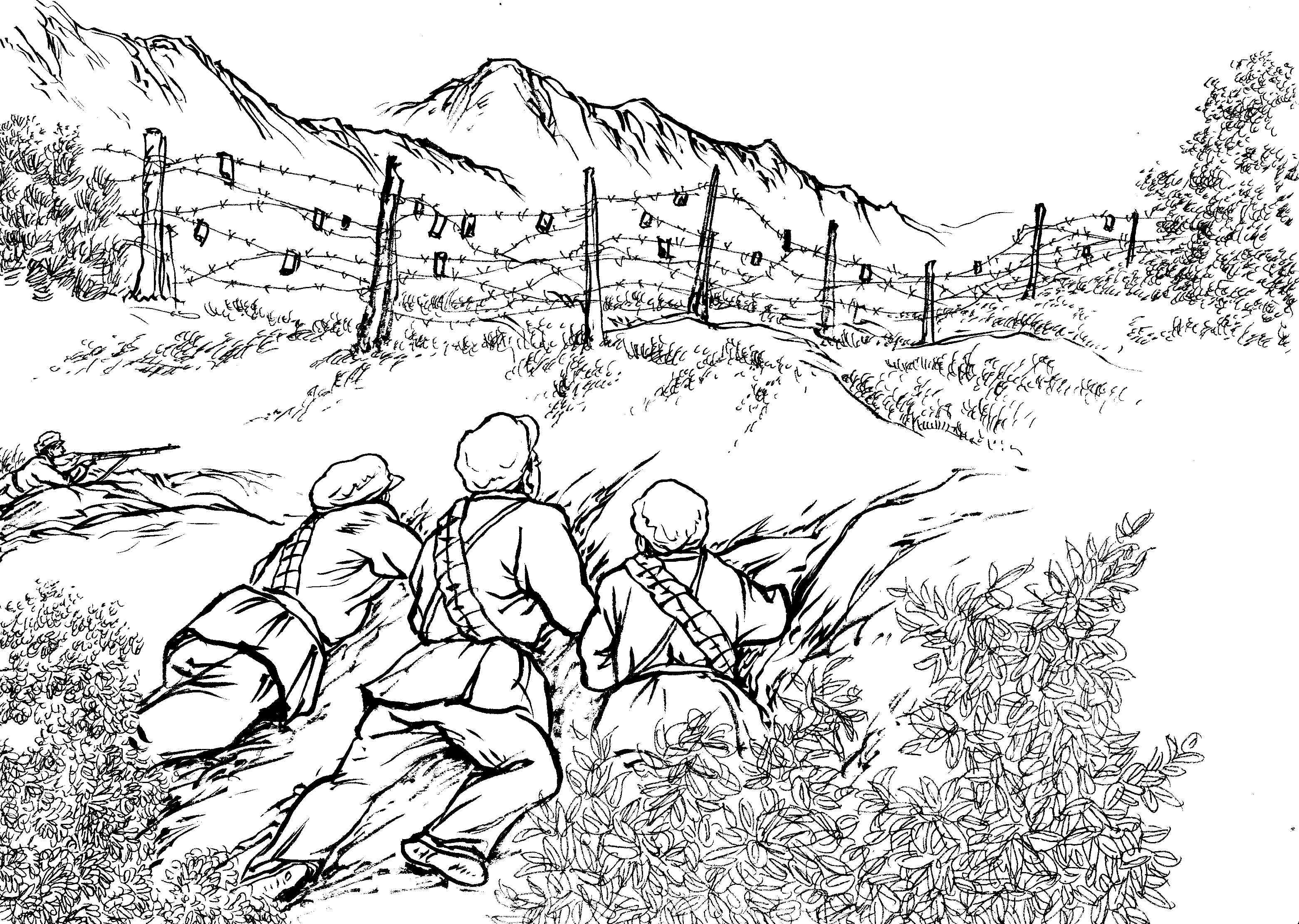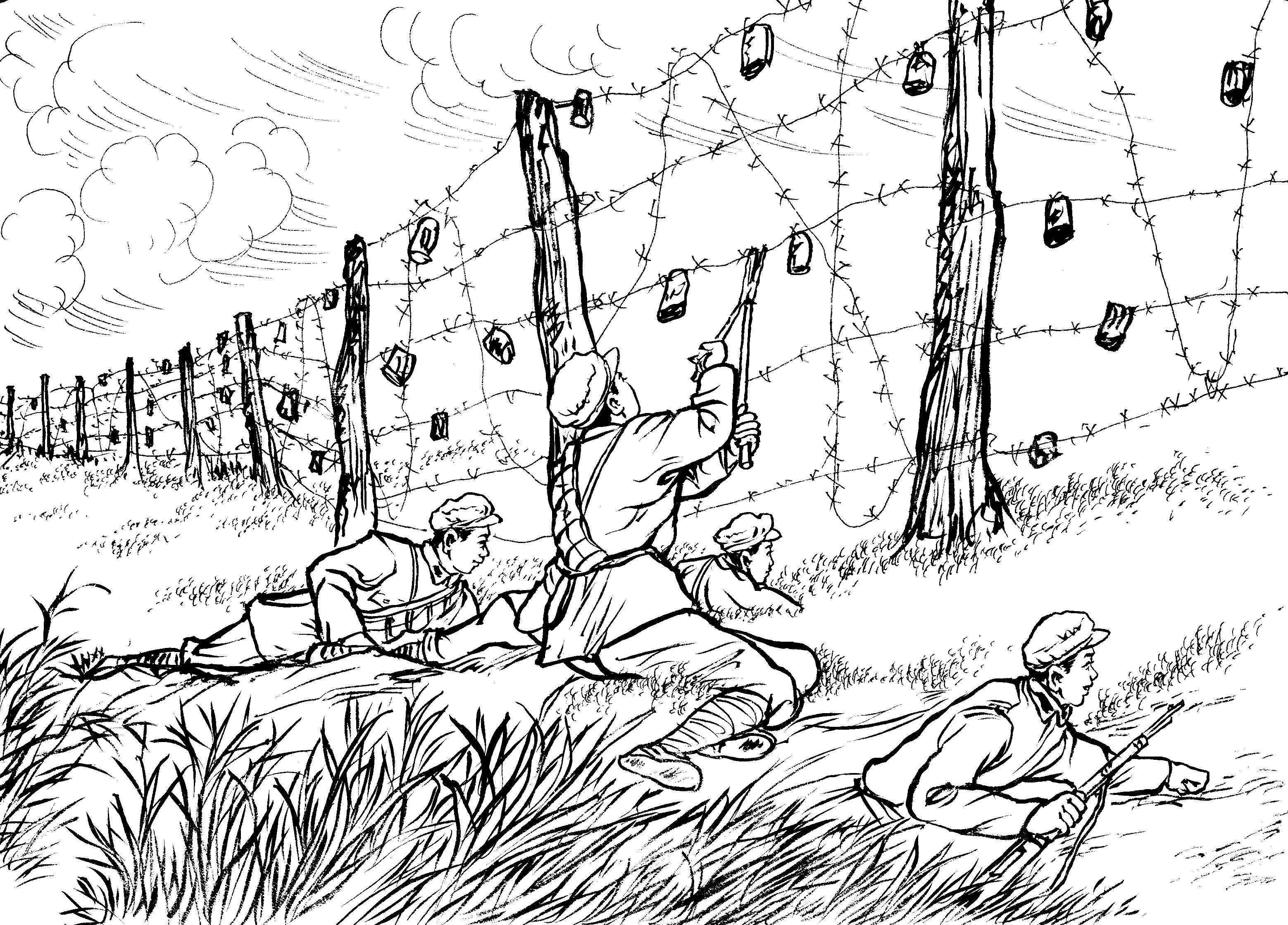 74. 7月上旬的一天,团部派康仲仁带着3名战士到敌占区侦探敌情。吃过早饭,他们穿过丛林,快速来到敌人的前沿阵地,只见四周围满了铁丝网,网上挂着许多子弹壳和罐头盒。