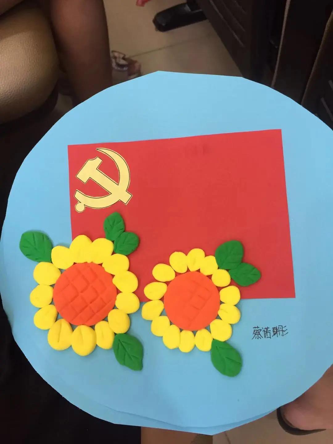 活动在一场小手工制作中拉开序幕,小朋友热情洋溢,在老师的引导下,用自己灵巧的小手先剪纸,然后在卡纸上粘上超轻粘土,设计出每个人自己心目中的党旗。当作品完成时,小朋友把作品捧在手中,认真听老师介绍党旗,党史。生动的课堂教育小朋友“童心向着党,永远跟党走”。孩子们在做手工的同时,学会认真思考,互相帮忙,共同学习,一场活动收获满满!