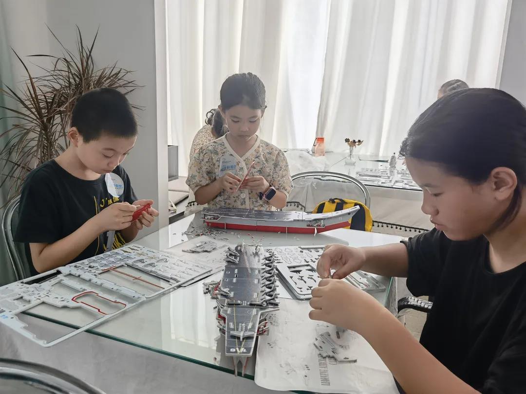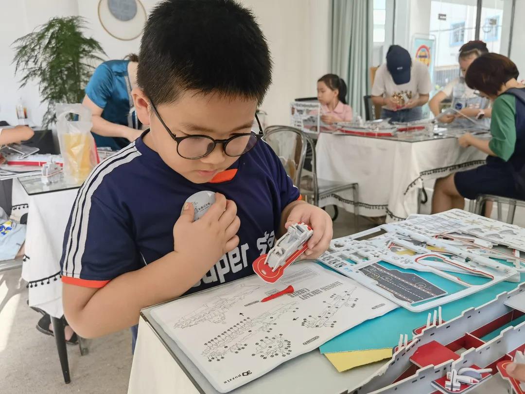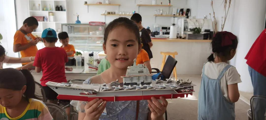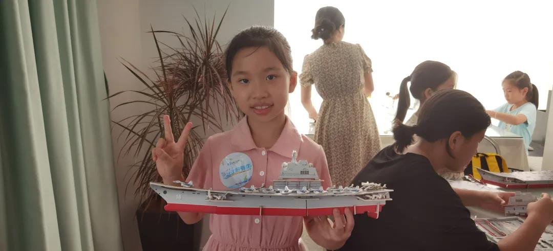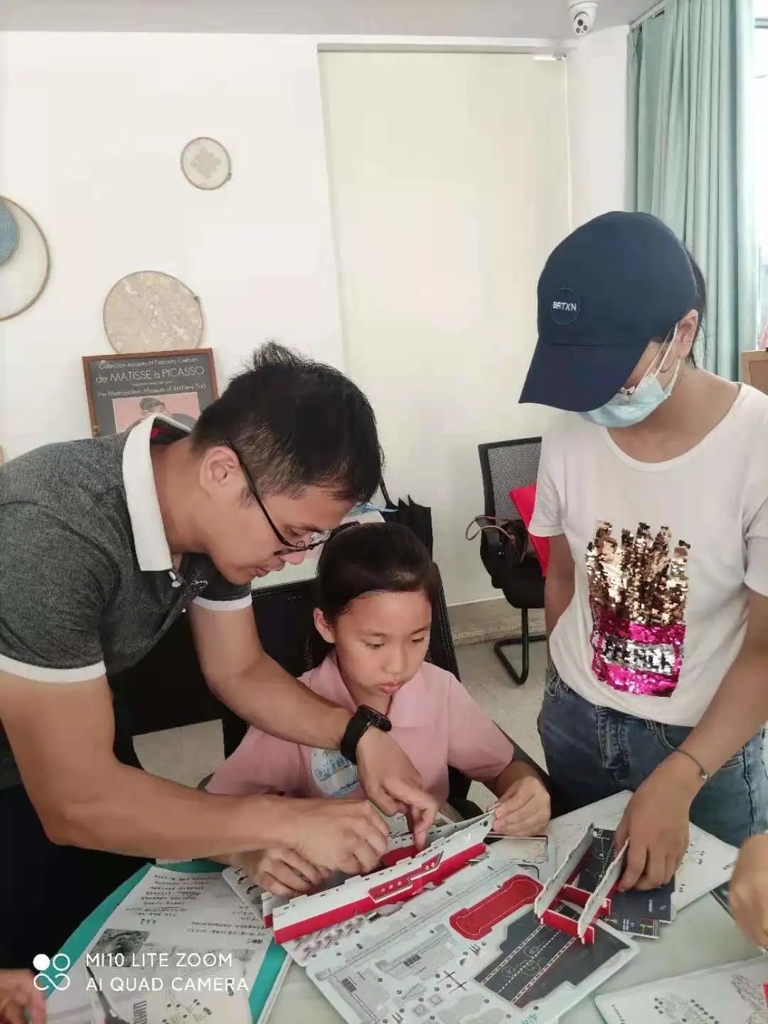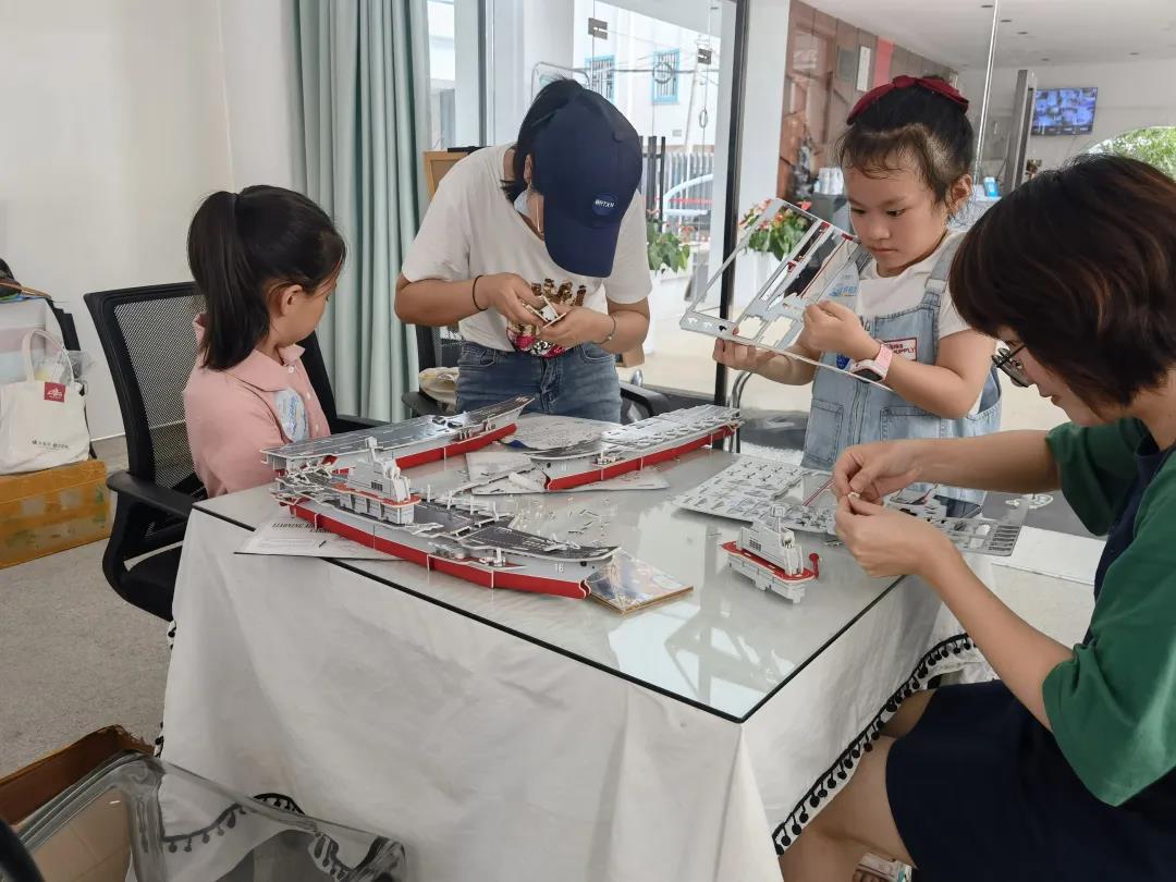 活动的最后一个环节是在澳海一号民宿制作“辽宁号”航空母舰。老师首先介绍了“辽宁号”的基本情况以及其在建设海洋国防上的重大意义,让小朋友们对“辽宁号”等军事装备产生浓厚的兴趣。然后带着小朋友们一起亲手制作“辽宁号”航模,在一拼一插中感受航母的高大威武,了解其强大的战斗力,大家认真制作,乐在其中。