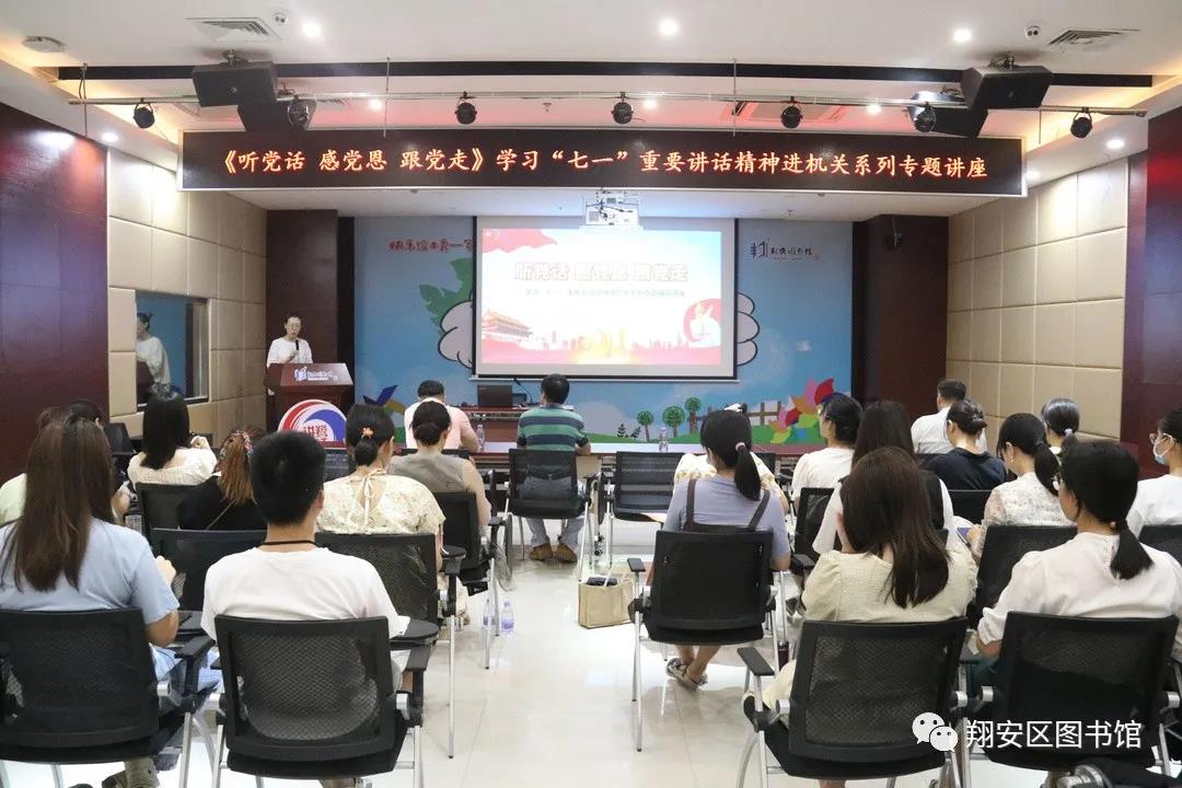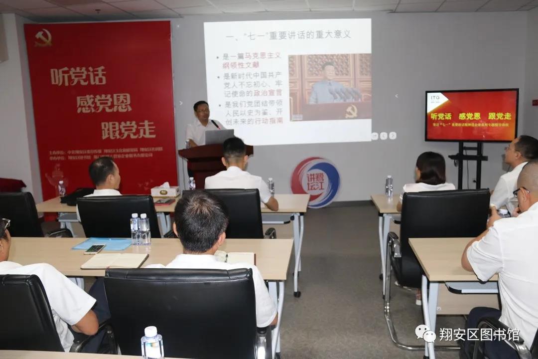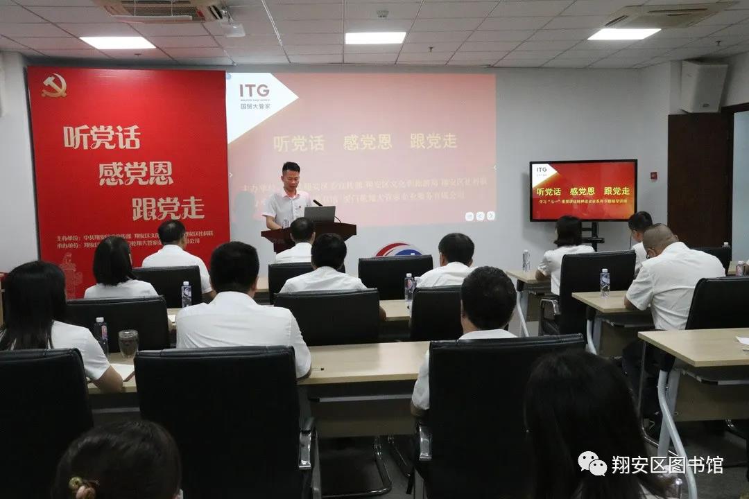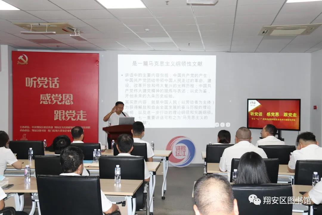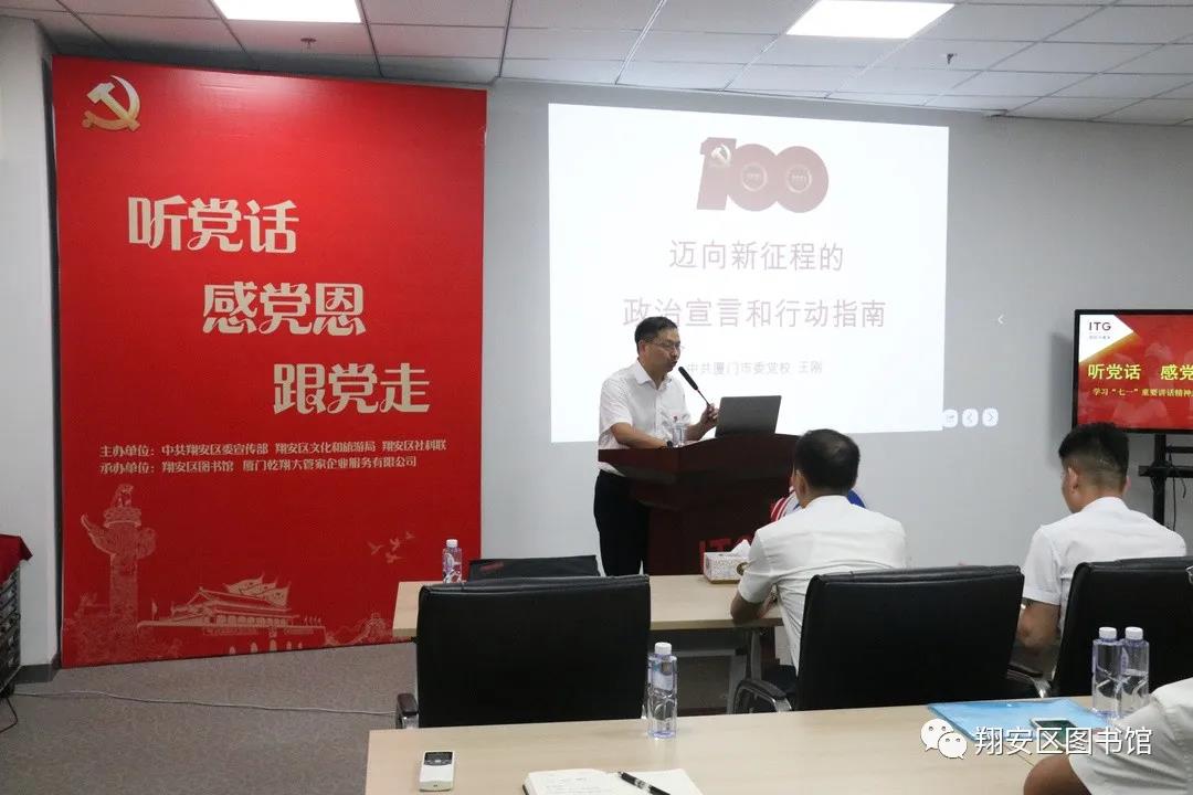 为庆祝中国共产党成立100周年,深入学习贯彻习近平总书记“七一”重要讲话精神。7月27日下午,翔安区图书馆在厦门乾翔大管家企业服务有限公司举办《以史为鉴、开创未来的行动指南--习近平总书记“七一”重要讲话精神解读》专题讲座,特别邀请了中共厦门市委党校哲学教研部主任、副教授王刚主讲,厦门乾翔大管家企业服务有限公司的干部职工聆听讲座。