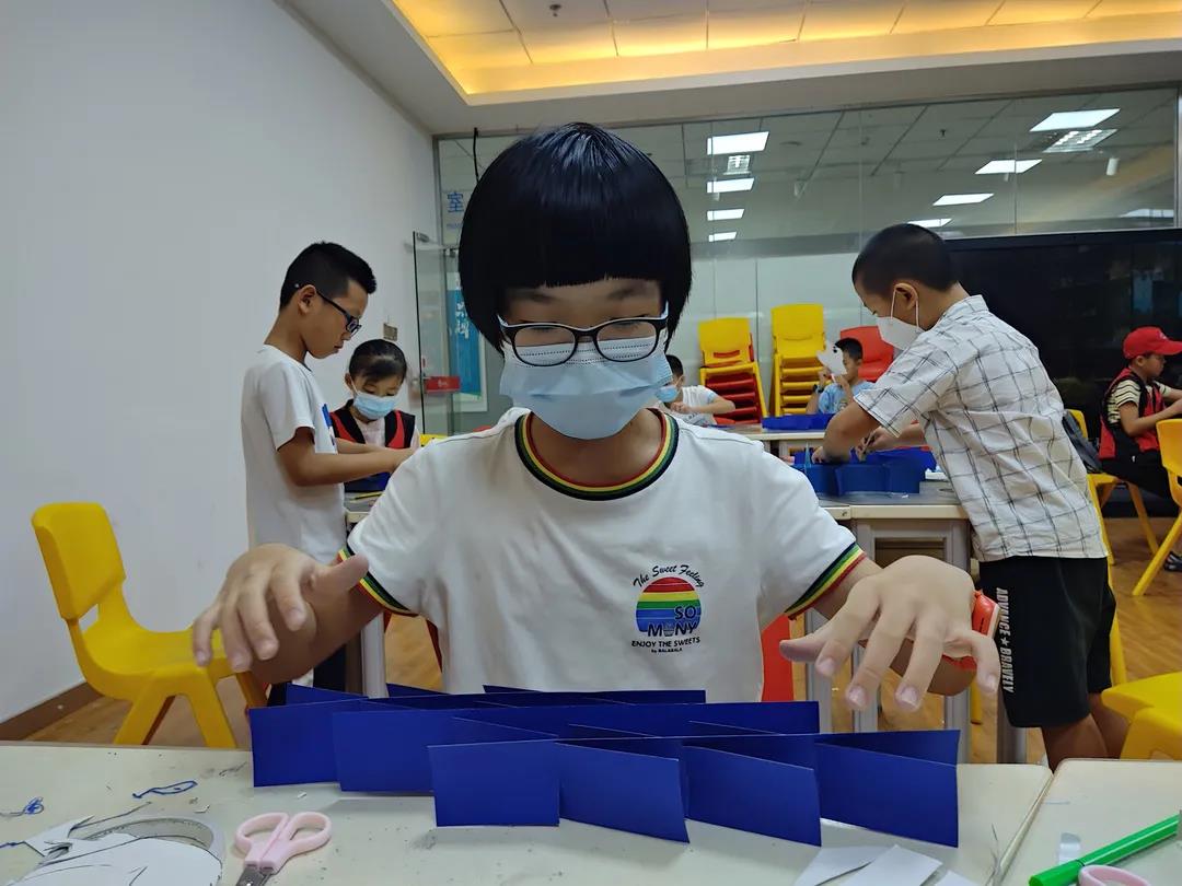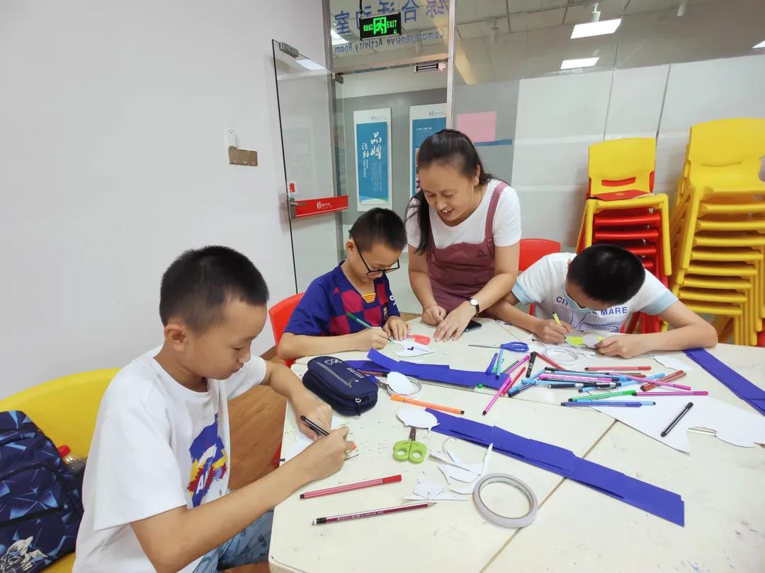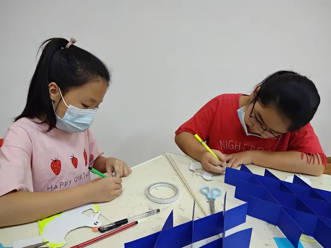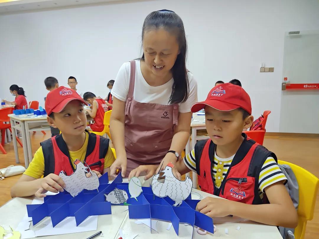 在共读与仿写之后,为了进一步深入读者印象,展开了活跃的课堂氛围,老师带领学生们开展了手工制作立体书“小鸡钓鱼”,生动且形象的再现了今日主题。