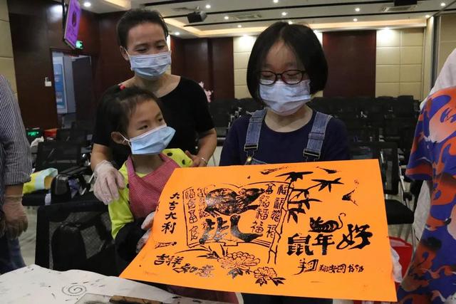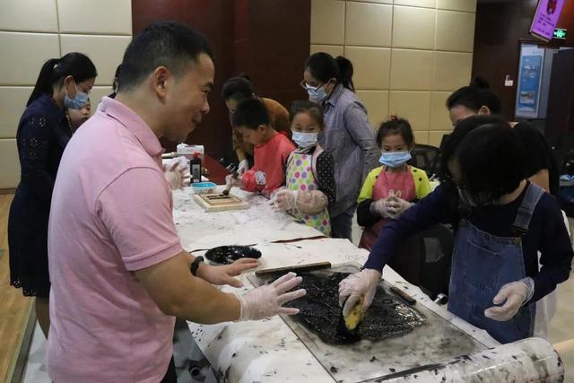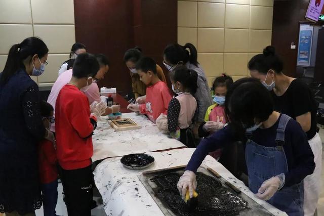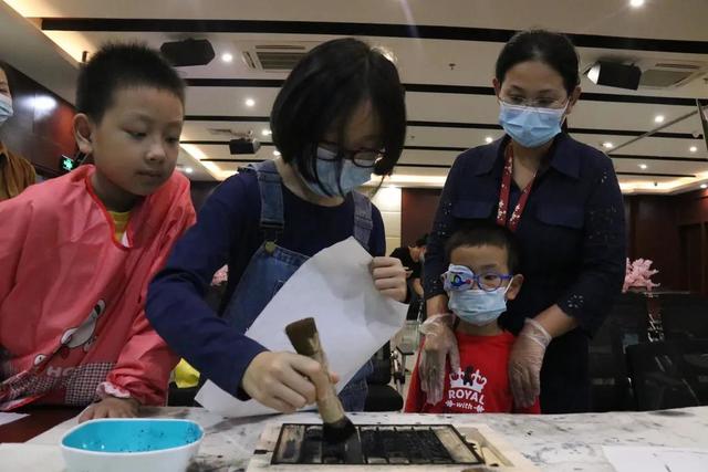 紧接着,力禾老师介绍了雕版印画的形成和相关知识,在小读者的热情高涨下,开展了雕版印刷研学体验活动。雕版印刷步骤看似简单,但要印出清晰、完整、均匀的作品,则需要技巧,更需要耐心。现场的每个小读者都一丝不苟,认真制作。